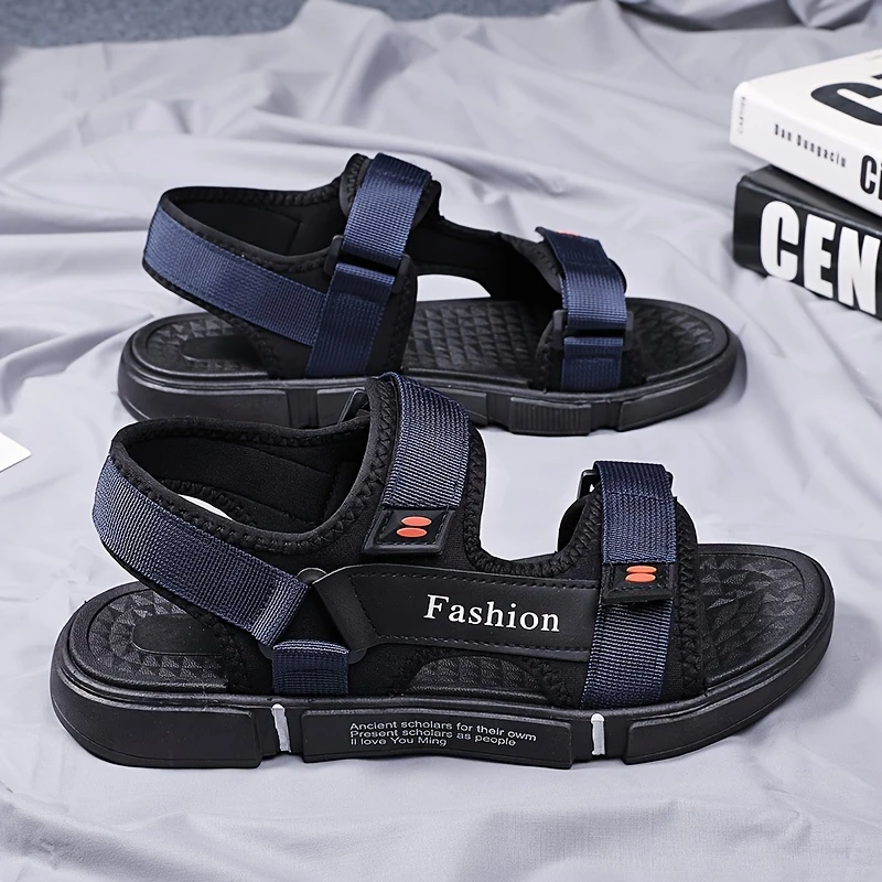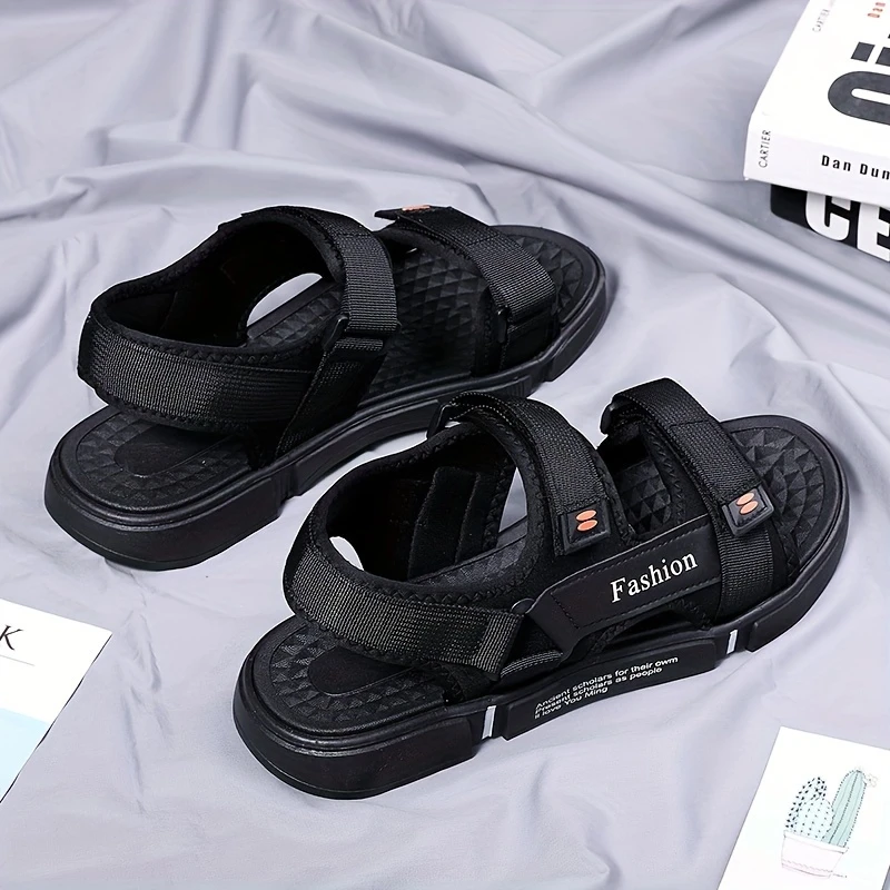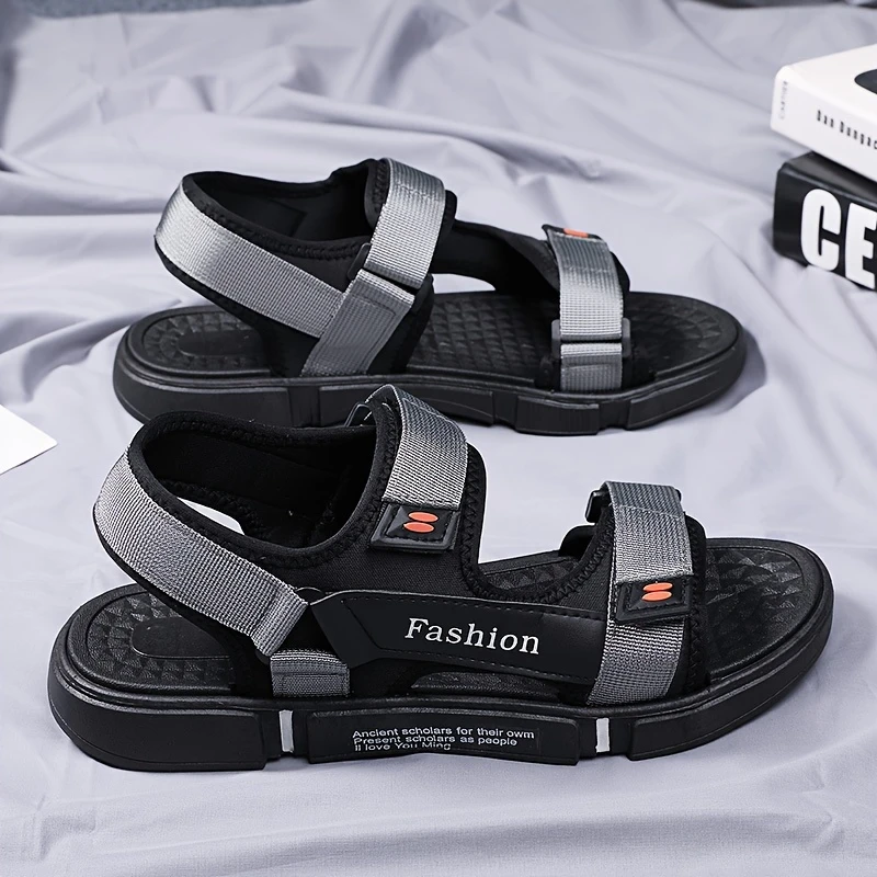 Erkaklar uchun sirpanmaydigan yozgi sandallar: uslubiy, mustahkam, qulay plyaj poyabzallari, yopishtiruvchi tasma bilan, qora mato ustki qismi, to'q sariq aksentlar, kauchuk taglik. Tashqi faoliyat, kundalik kiyim uchun mos.