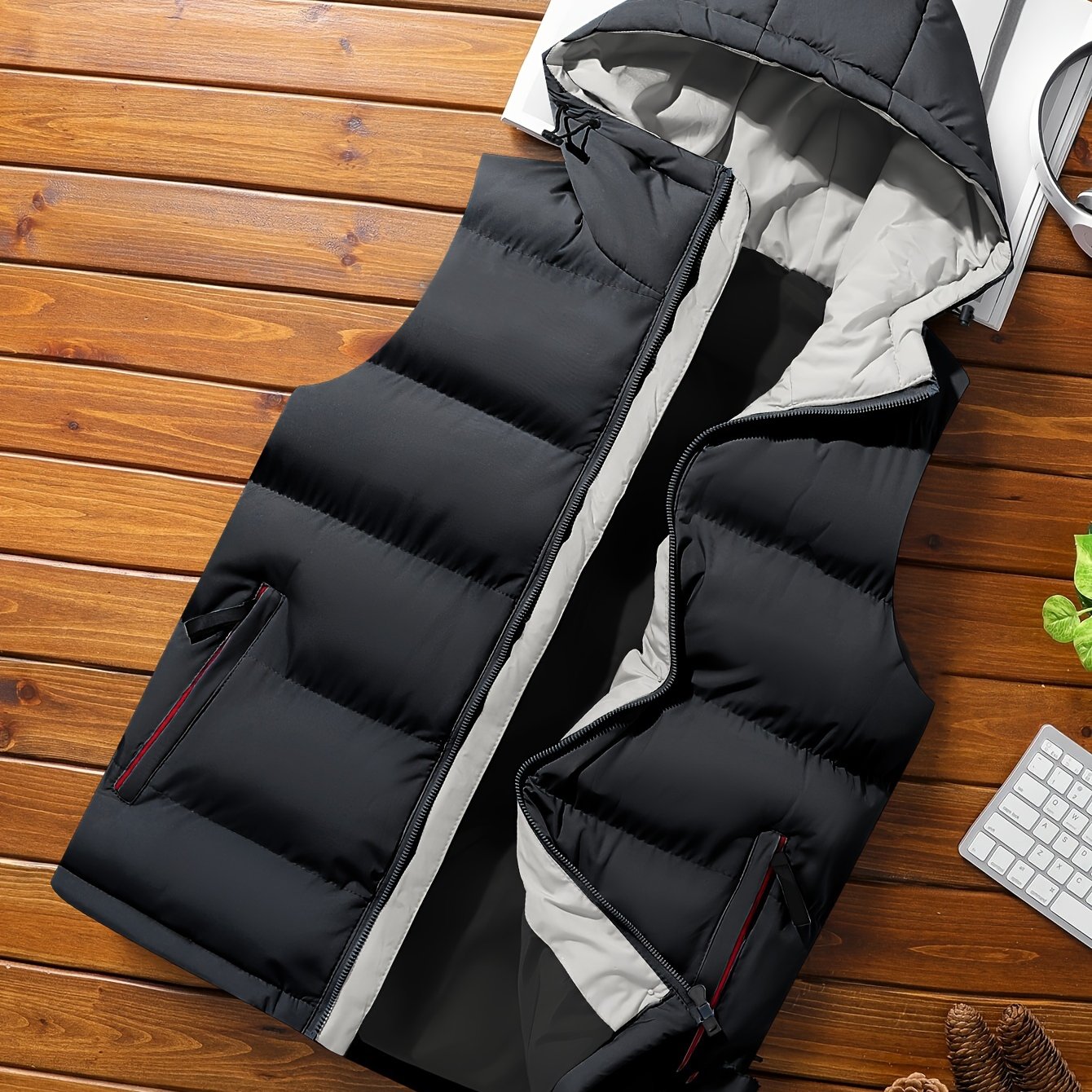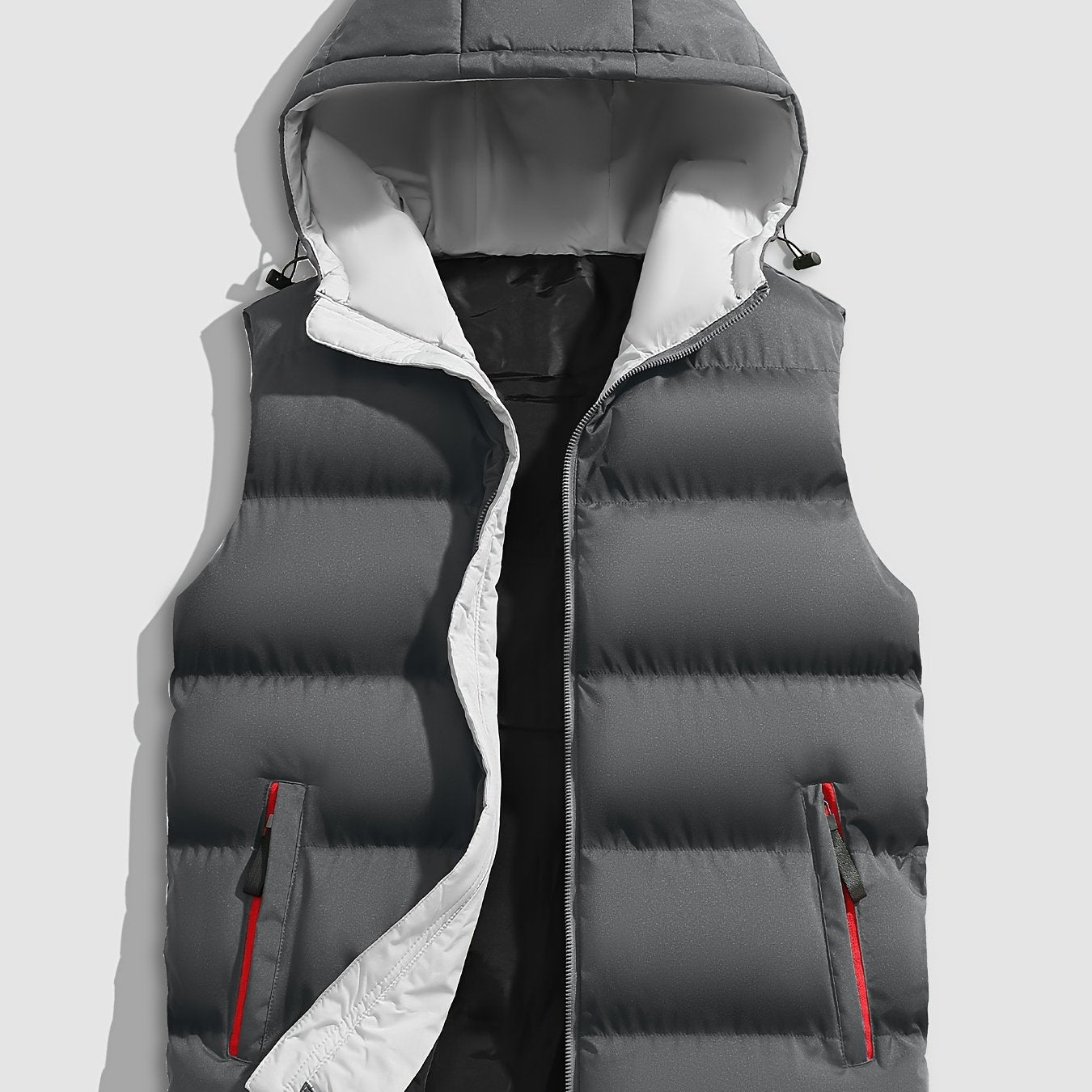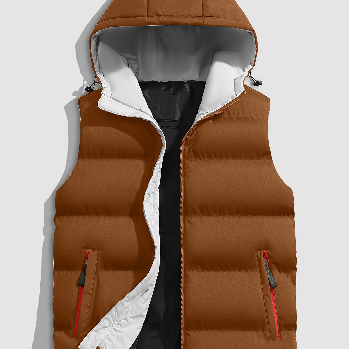 Erkaklar uchun zaytun yashil kapüşonli jilet, fermuarlı cho'ntaklar bilan, yengsiz, mashinada yuvish mumkin bo'lgan polyester, kuz/qish uchun ideal.