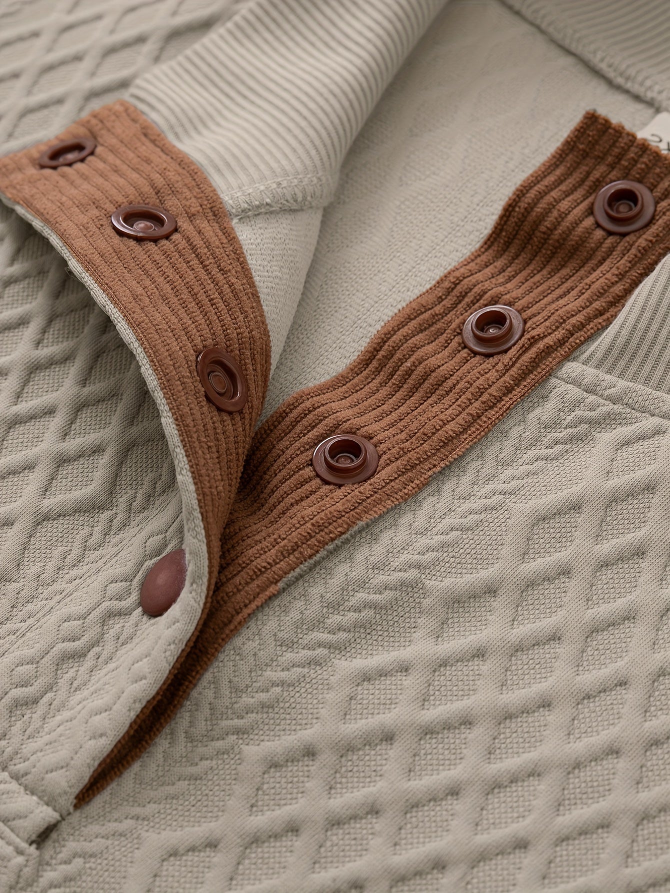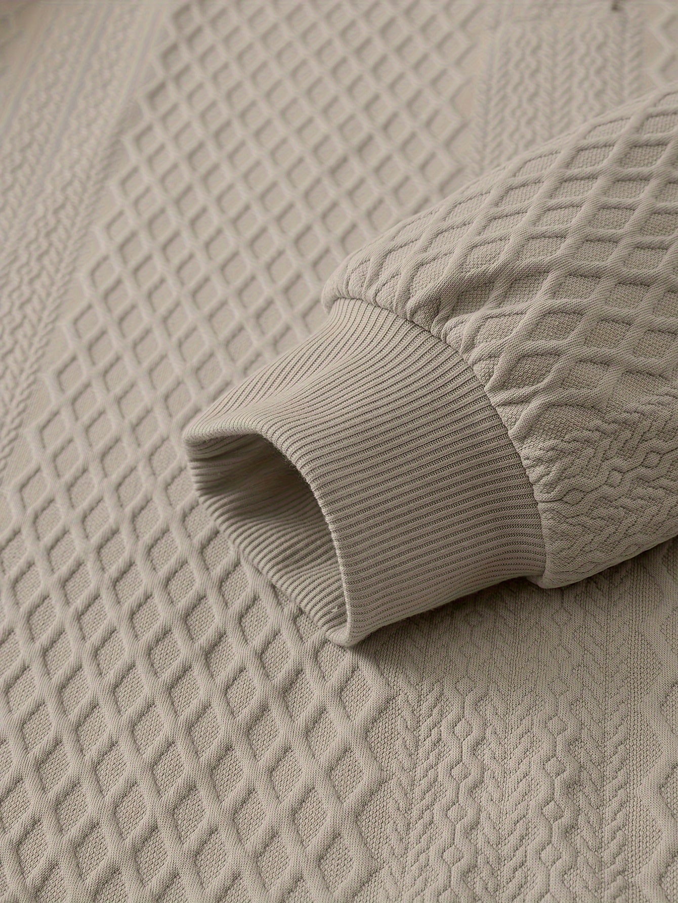 Bej rangdagi geometrik naqshli erkaklar uchun plussiz tasodifiy kardigan sviter, tugmachali old qismi. Bahor va kuz uchun mukammal. Yengil va qulay.