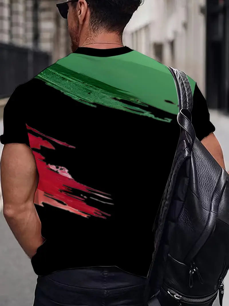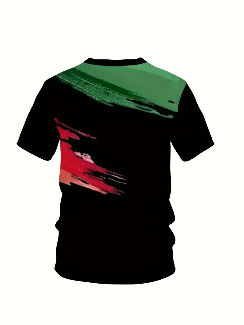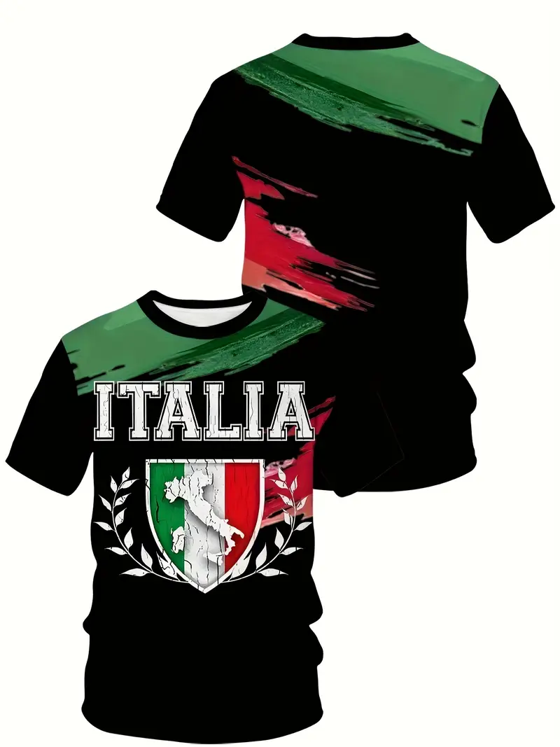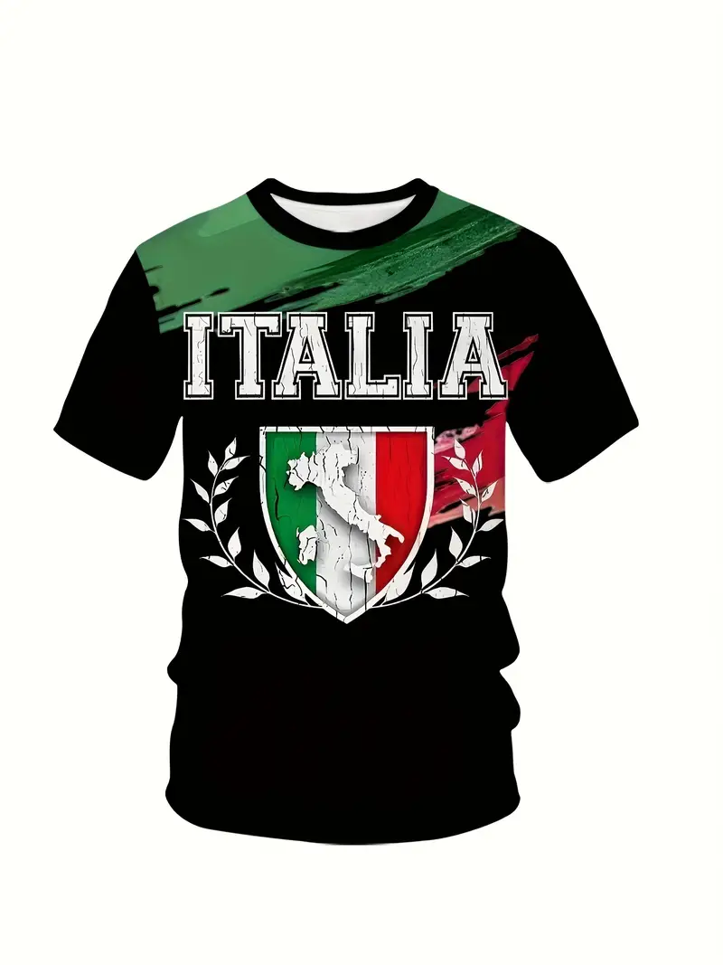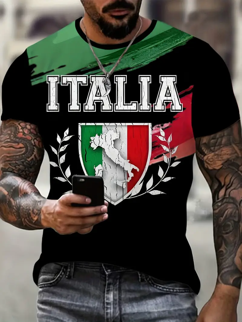 Erkaklar uchun plussiz tasodifiy T-ko'ylak, Italiyaning bosma dizayni, polyester va spandeks aralashmasi