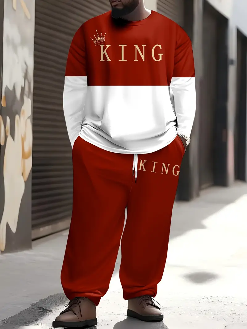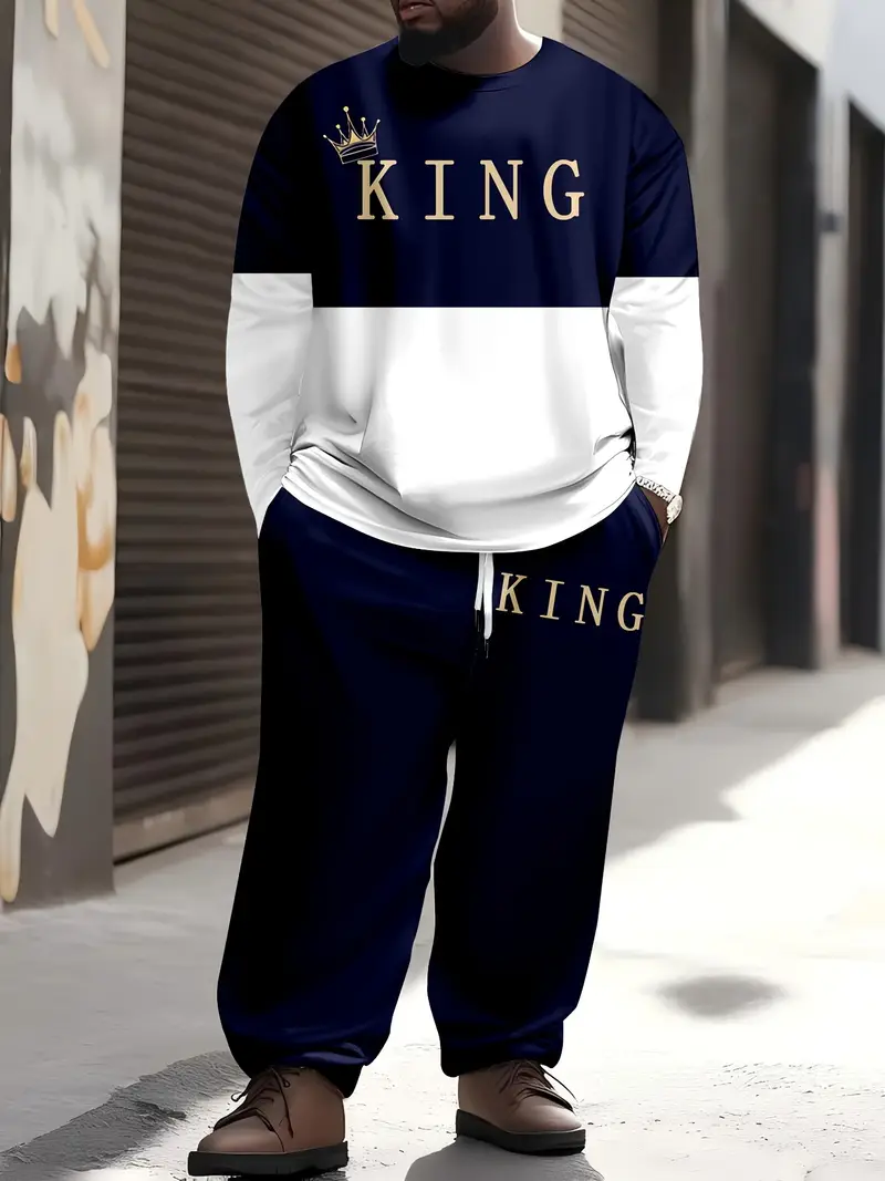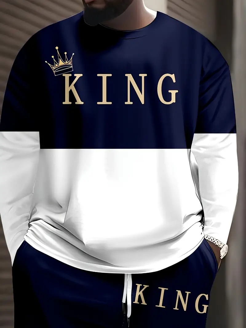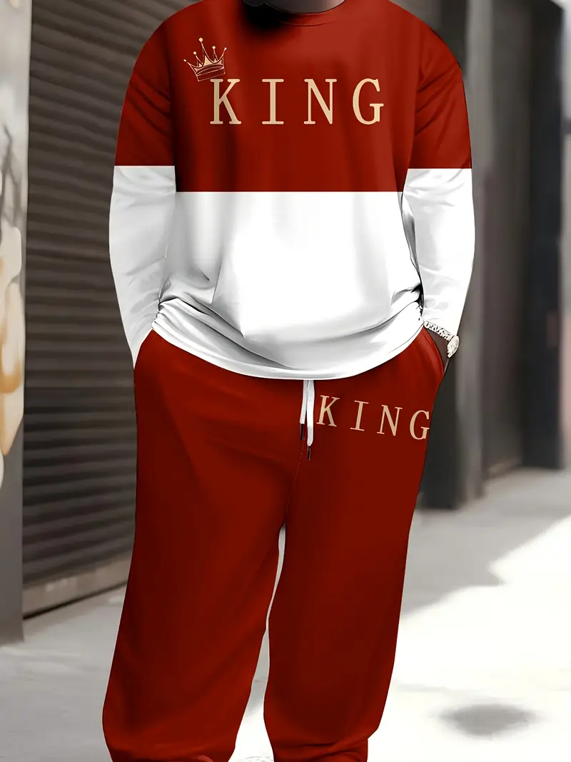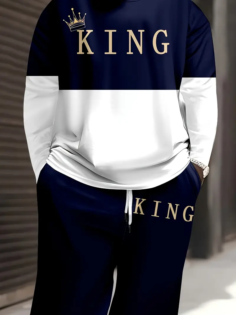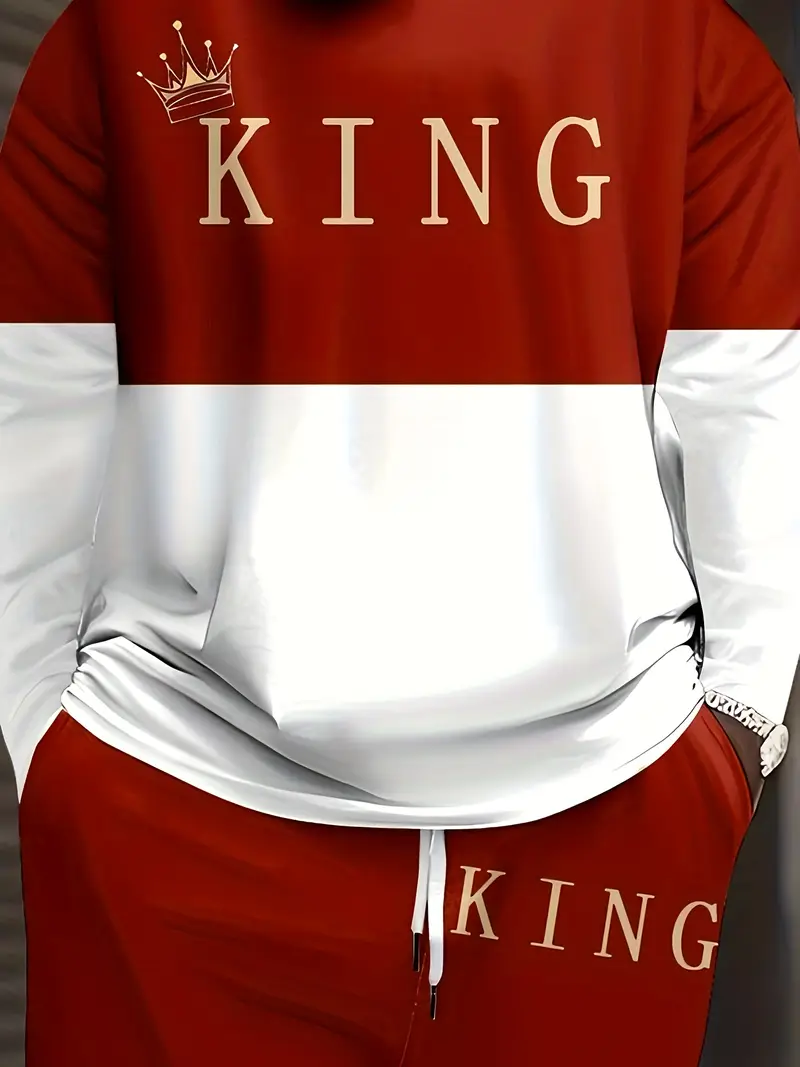 Erkaklar uchun kattalar o'lchamidagi sport va tasodifiy sport kiyimlari to'plami, multfilm qiroli bosma naqshi, polyester to'qima, elastik bel va cho'ntaklar bilan.