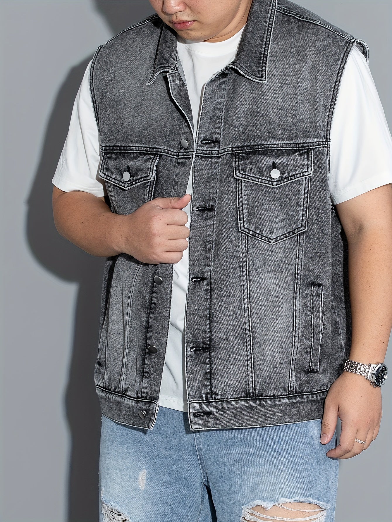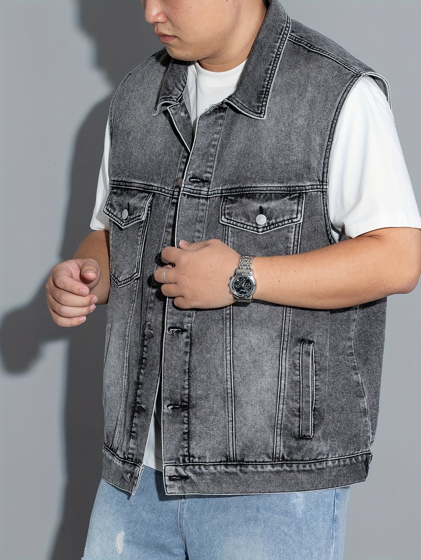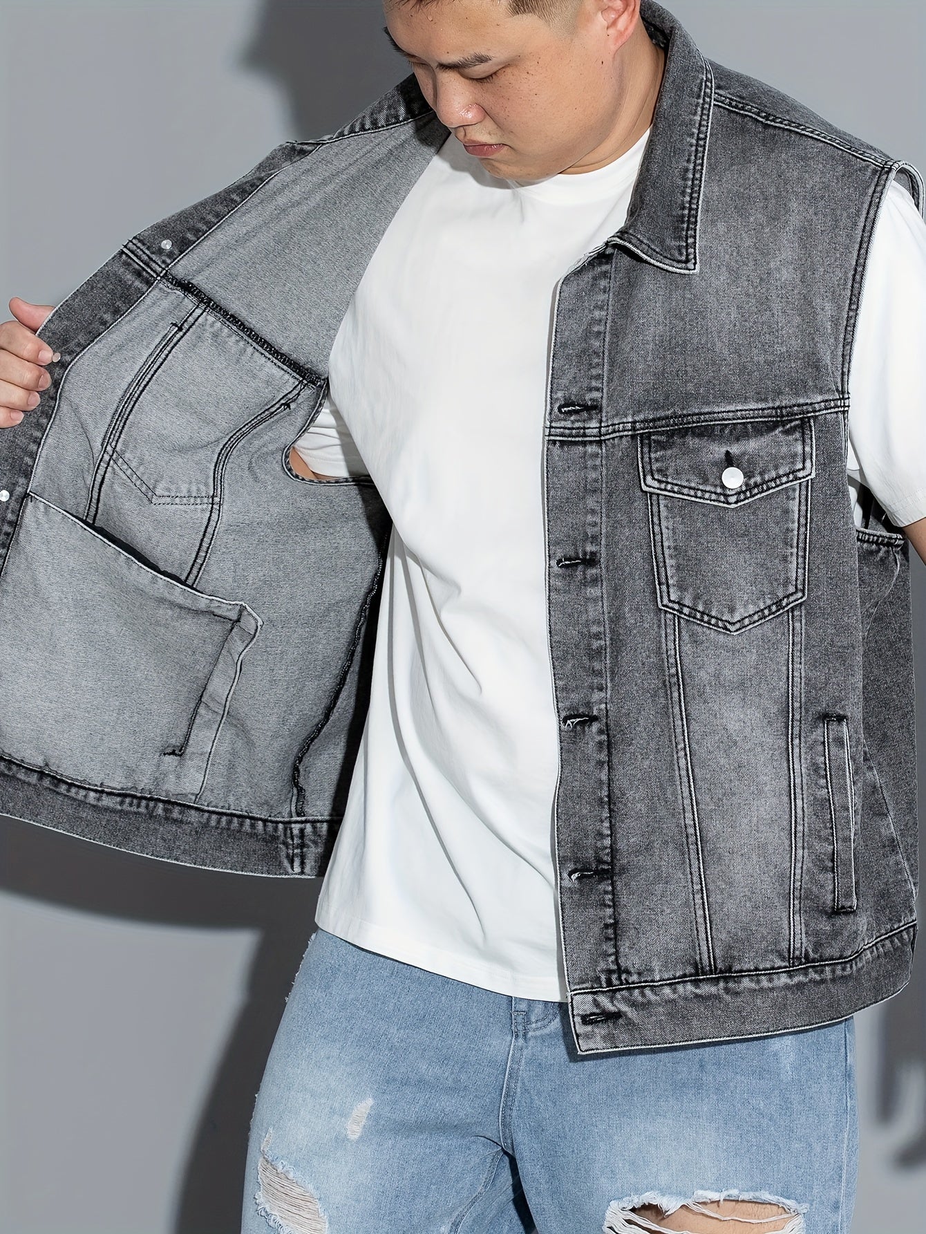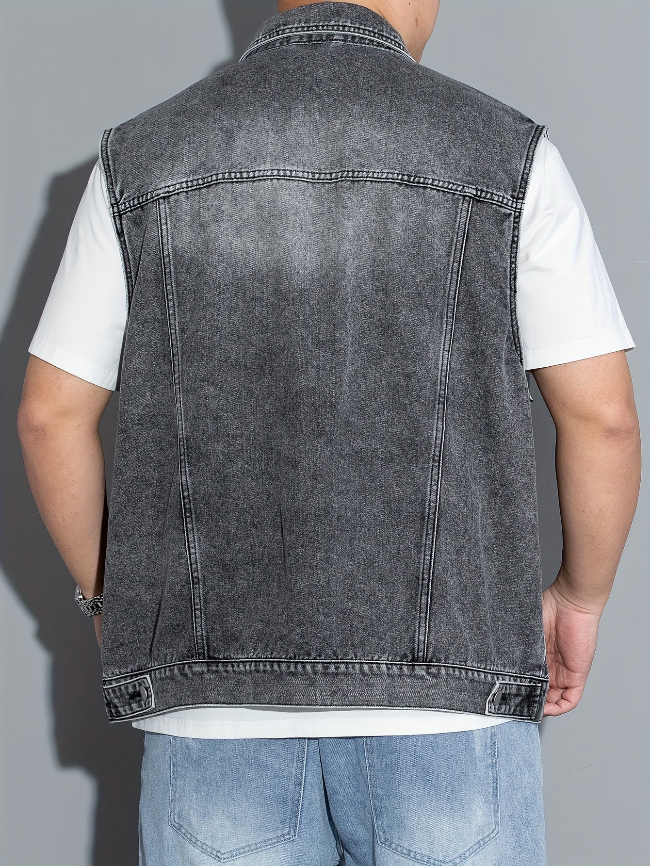 Erkaklar uchun yengsiz denim jilet, qopqoq cho'ntaklar, tugma yopish, yaka. Mashinada yuvish mumkin. Bahor/yoz/kuz uchun ideal. Katta o'lcham.