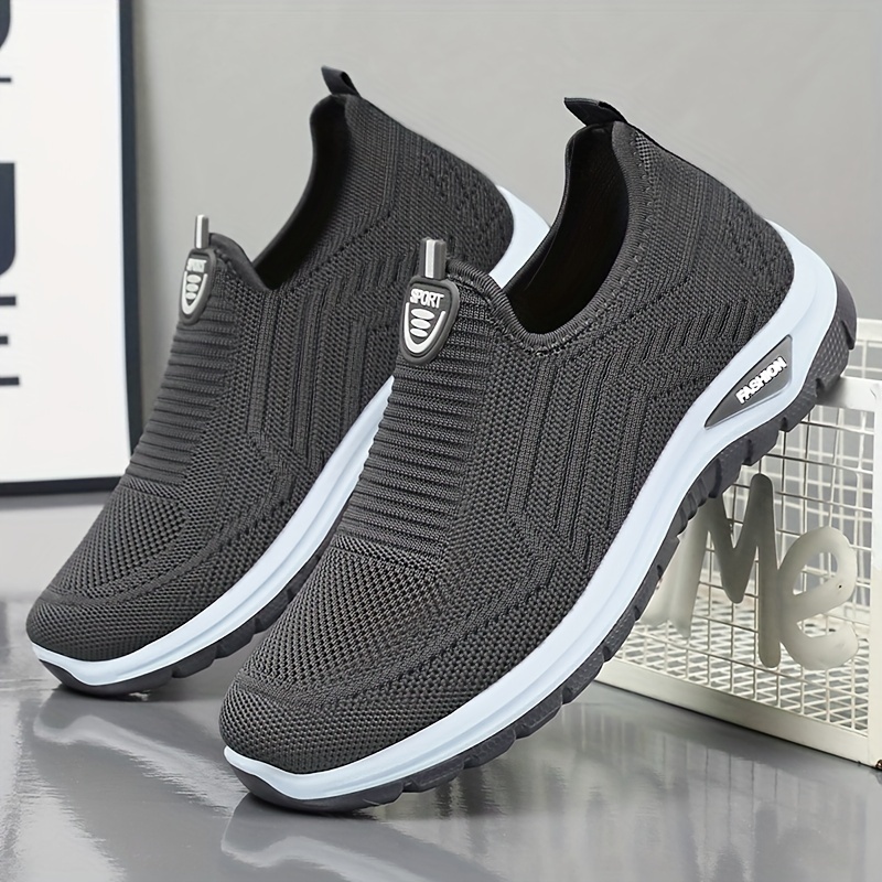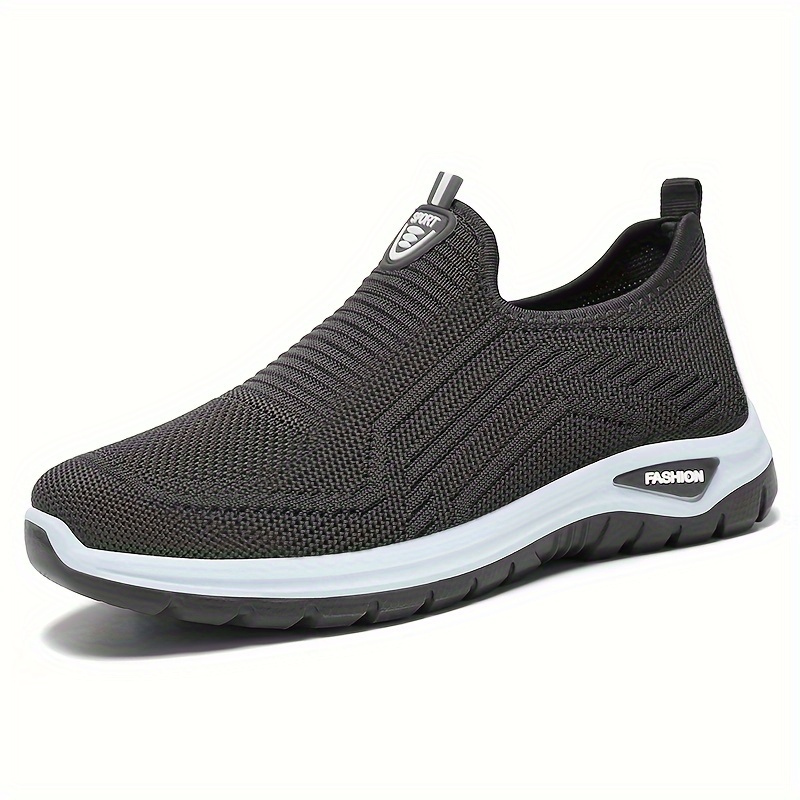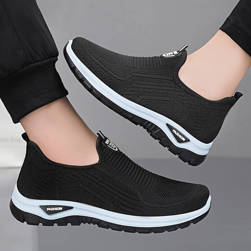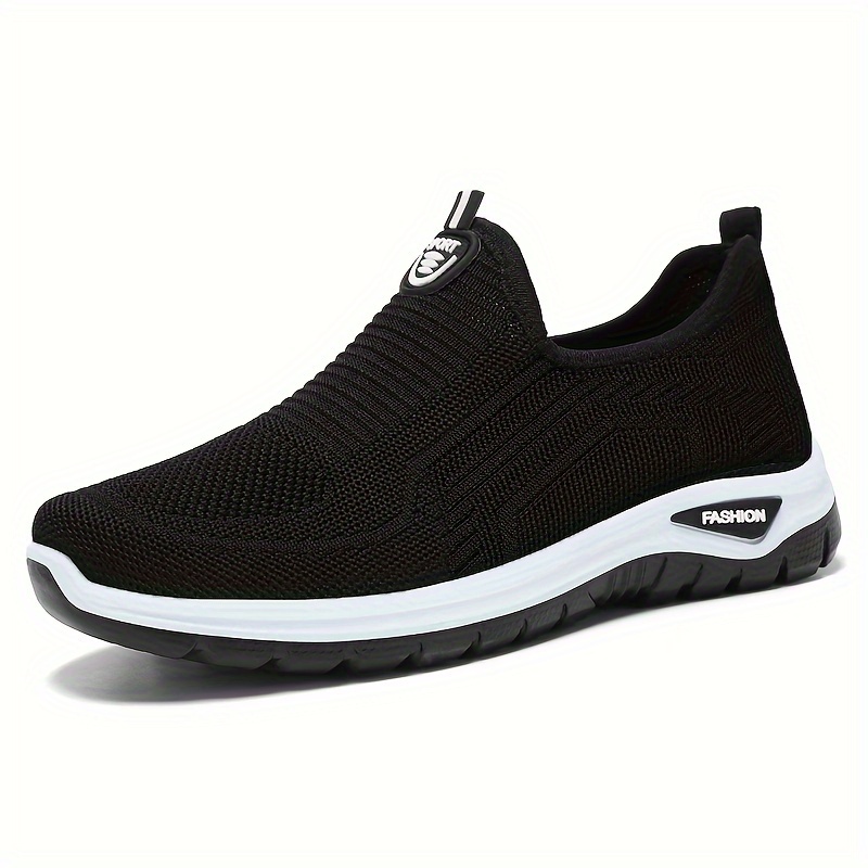 Erkaklar uchun qora rangdagi slip-on sport krossovkalari, nafas oladigan to'r va kauchuk taglik bilan, yugurish, yurish va tasodifiy kiyimlar kabi ochiq havoda faoliyatlar uchun ideal.