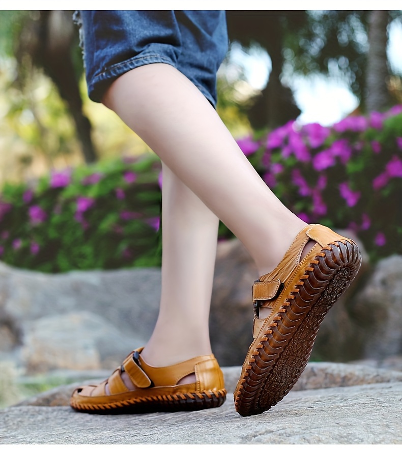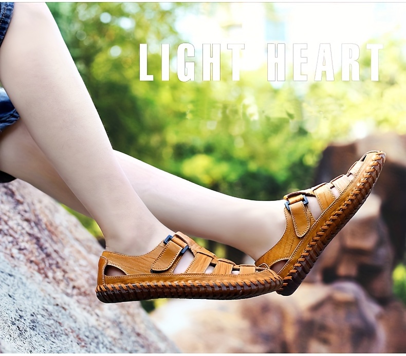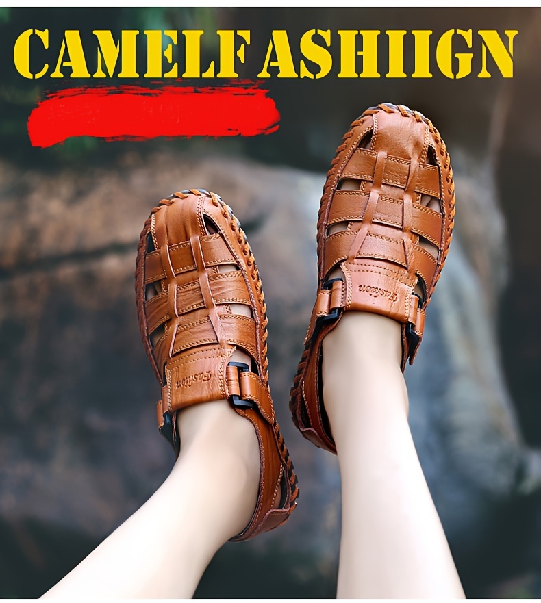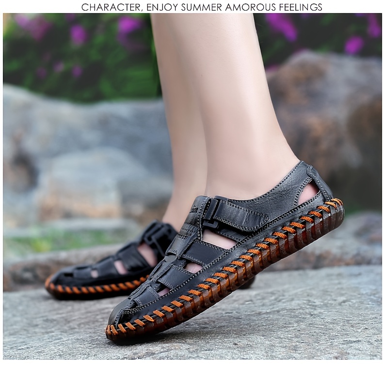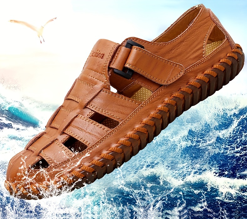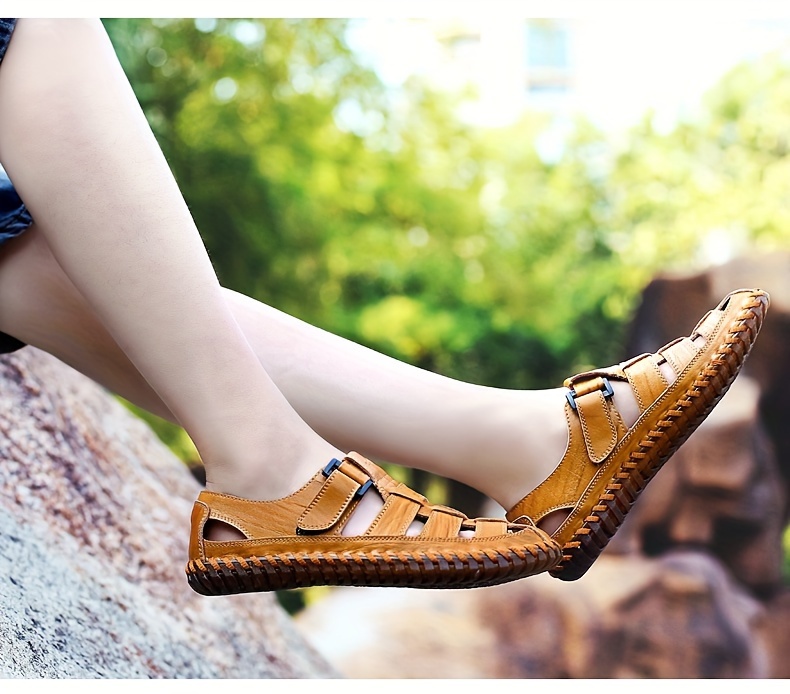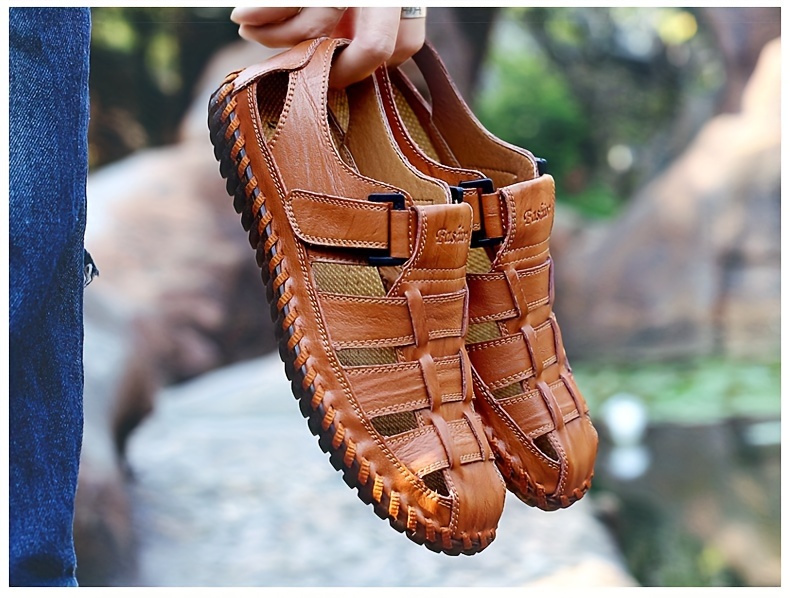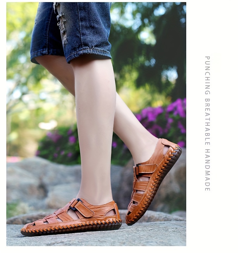 Yoz va bahorda tashqi foydalanish uchun mo'ljallangan erkaklar uchun slip-on mikrofiber sandallar, tikuvlar, yopiq barmoq, nafas oladigan dizayn va sirpanmas taglik bilan.