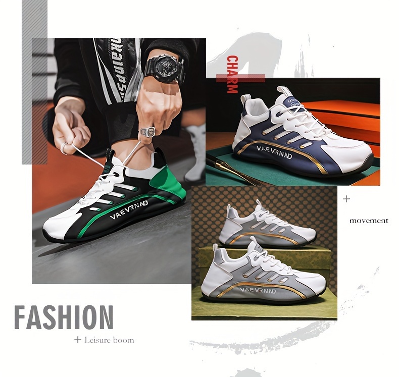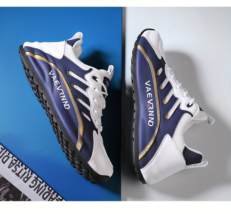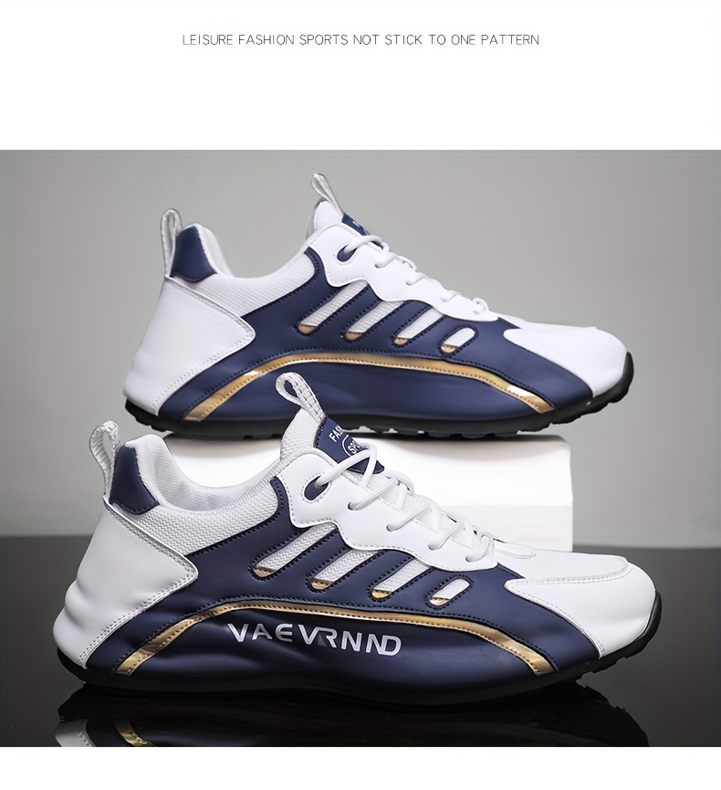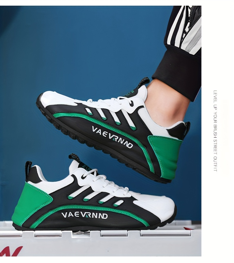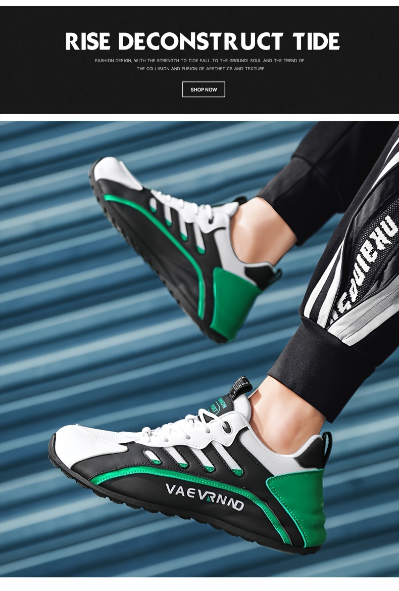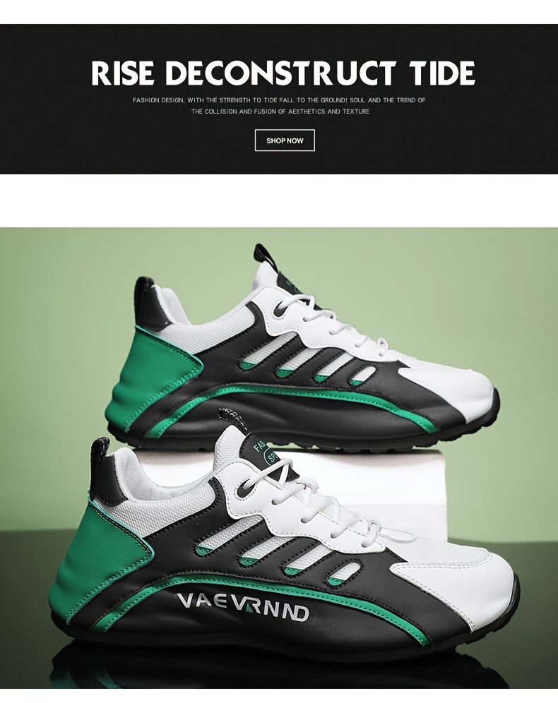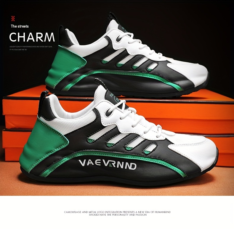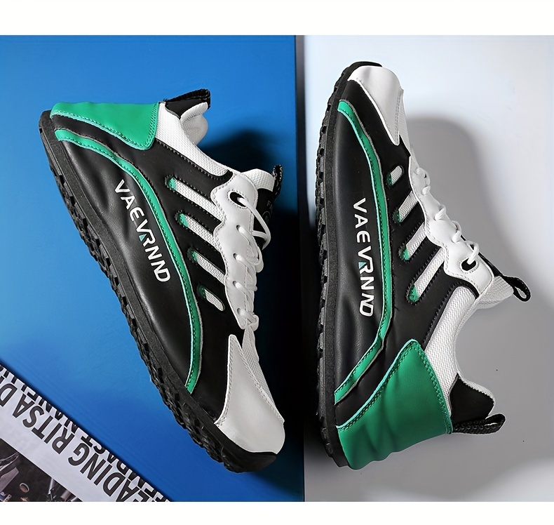 Erkaklar uchun qora va ko'k rangdagi dizaynga ega, oq asos, yashil aksentlar, PU yuqori qismi va PVC taglik bilan zamonaviy barcha mavsumli krossovkalar, norasmiy kiyimlar uchun.