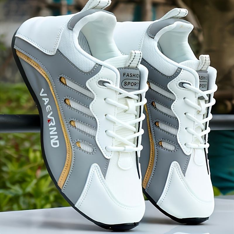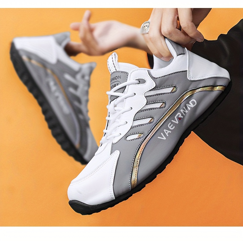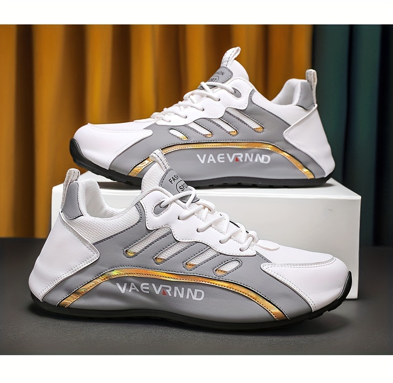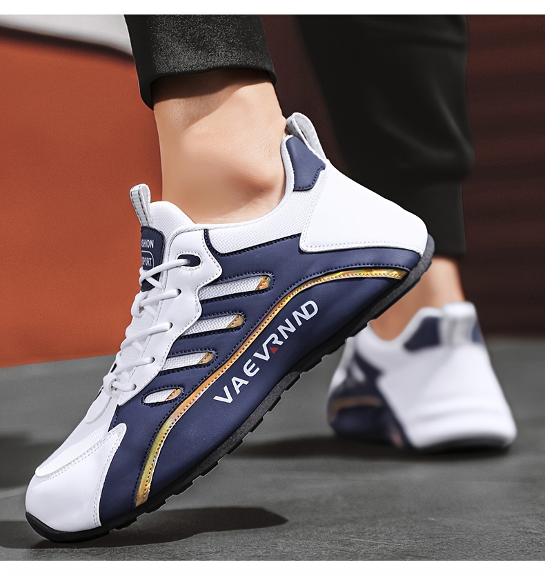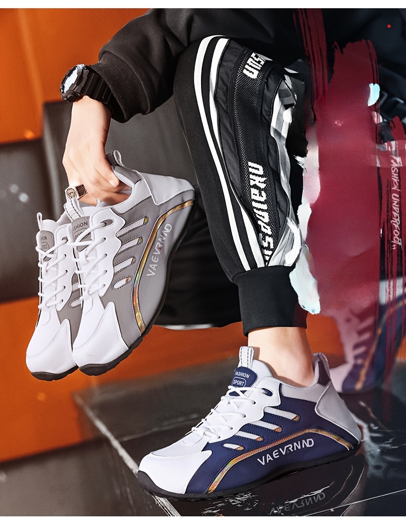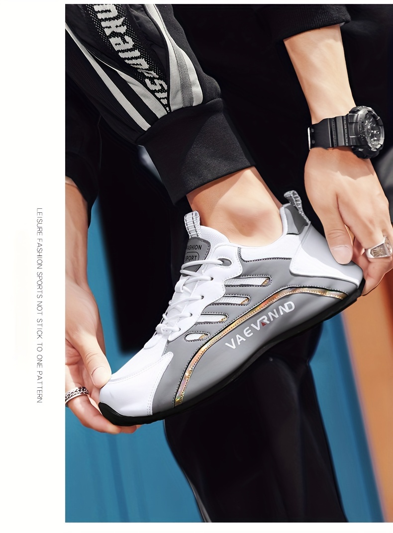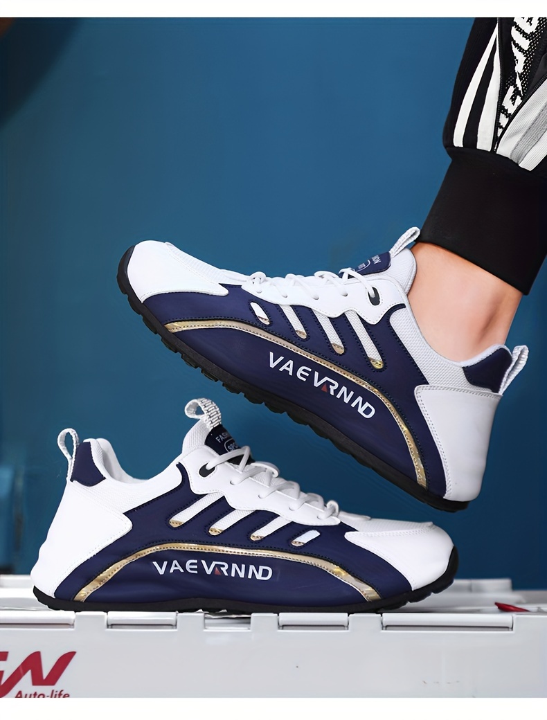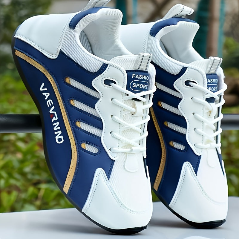 Erkaklar uchun qora va ko'k rangdagi dizaynga ega, oq asos, yashil aksentlar, PU yuqori qismi va PVC taglik bilan zamonaviy barcha mavsumli krossovkalar, norasmiy kiyimlar uchun.