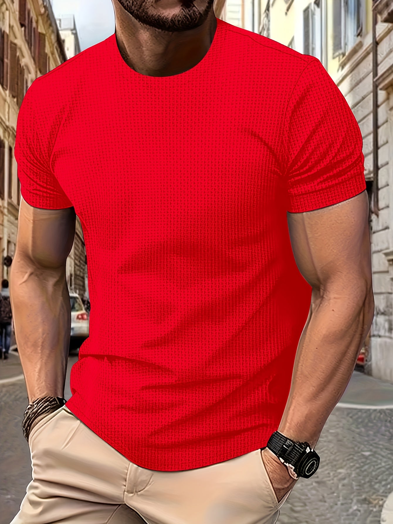 Erkaklar yozgi tasodifiy krujka bo'yinli futbolka, bir rangli to'qilgan matodan, oddiy moslikda. 94% naylon va 6% spandeksdan tayyorlangan, cho'zilmaydigan, lekin qulay cho'zilishga ega. 200gsm og'irlikda, kundalik kiyish uchun mos.