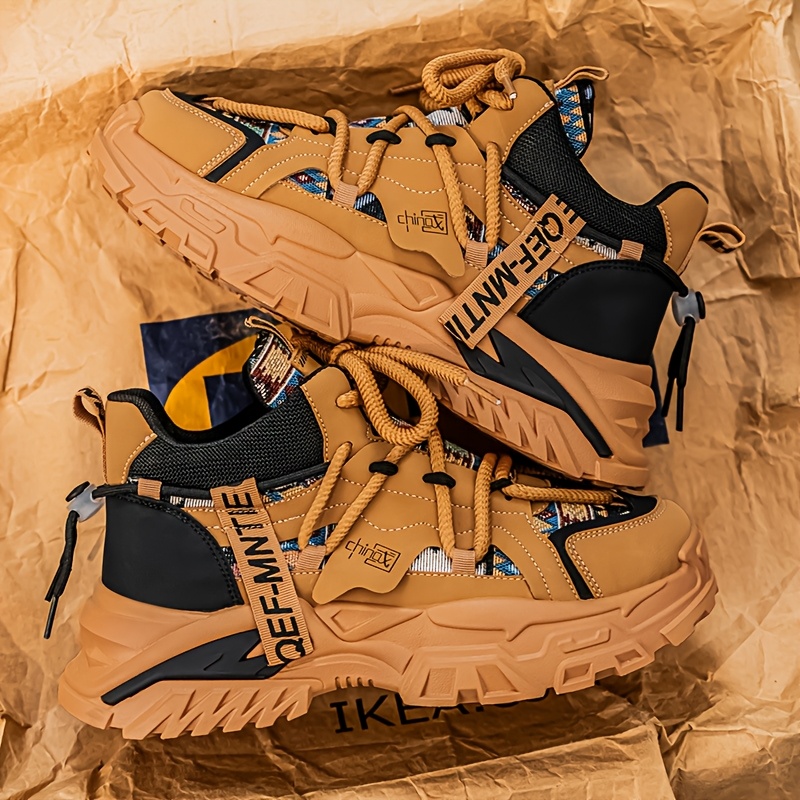 Erkaklar uchun kuz va qish mavsumiga mo'ljallangan zamonaviy chunky krossovkalar. Qabilaviy aksentlar bilan bej rang, bog'ichli yopilish, qalin taglik va yugurish, sayr qilish va tasodifiy kiyim uchun mos mato astar.