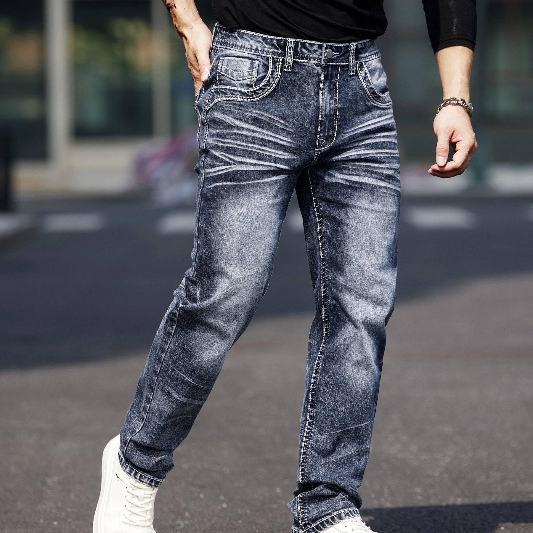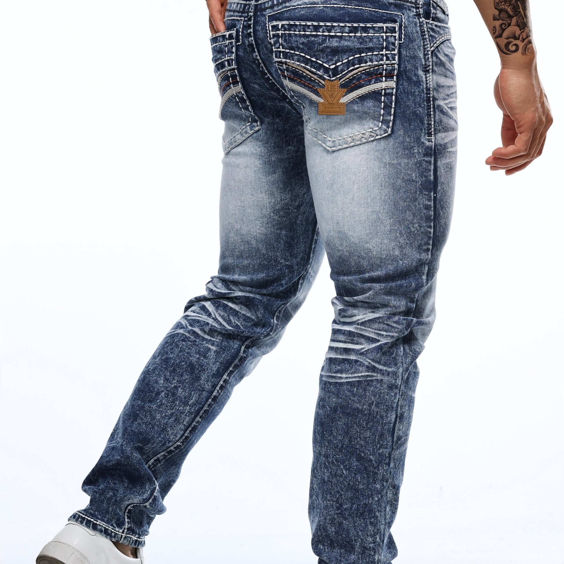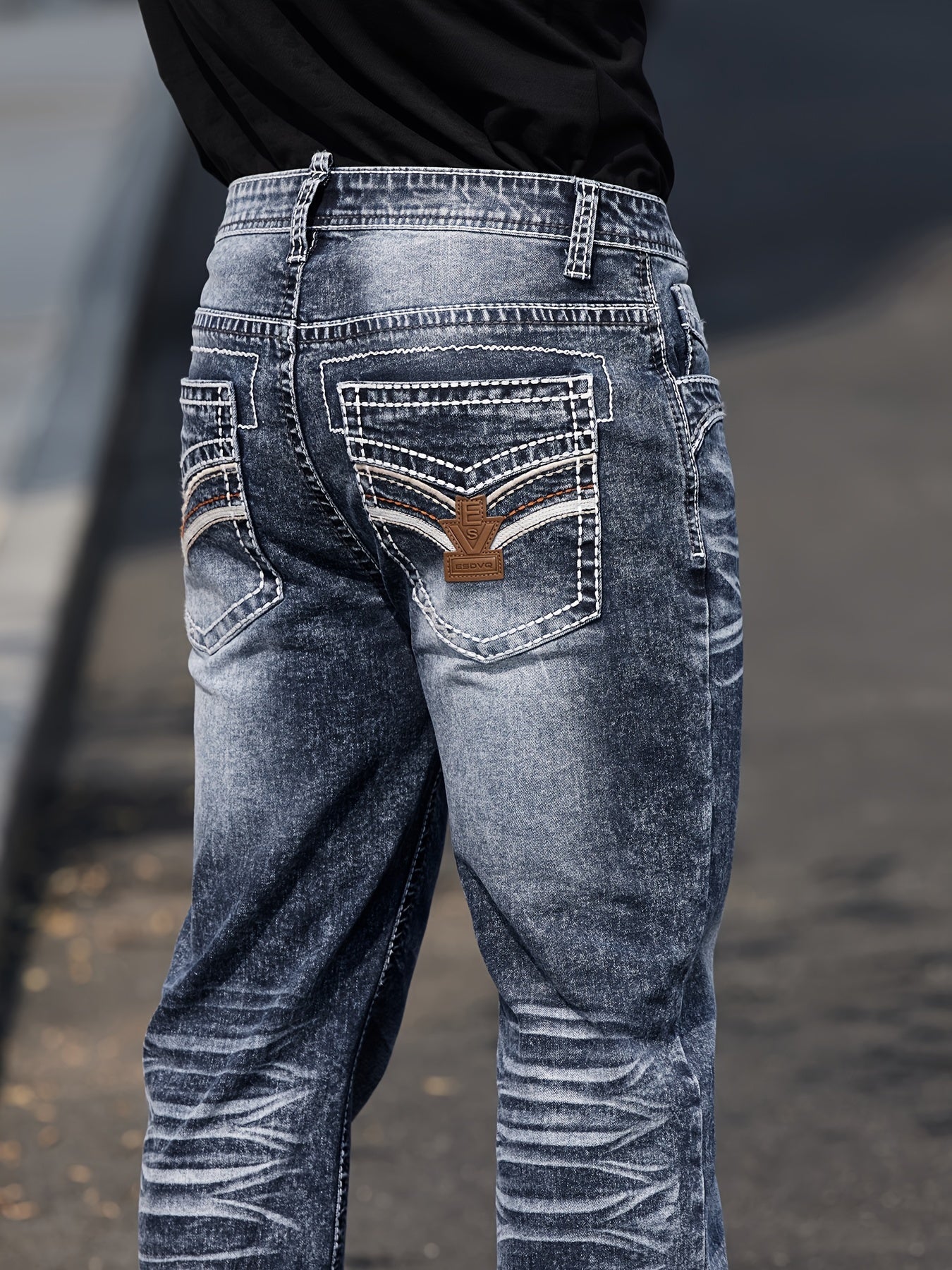 Erkaklar uchun vintage uslubidagi tikuvli elastik jinsilar, parchalar bilan bezatilgan - tor kesim, o'rtacha balandlik, mashinada yuvish mumkin
