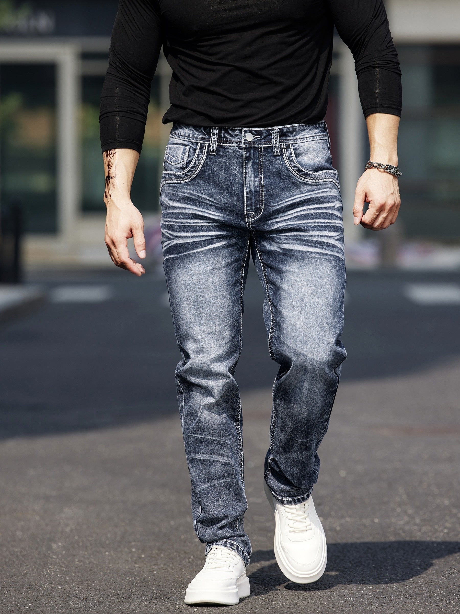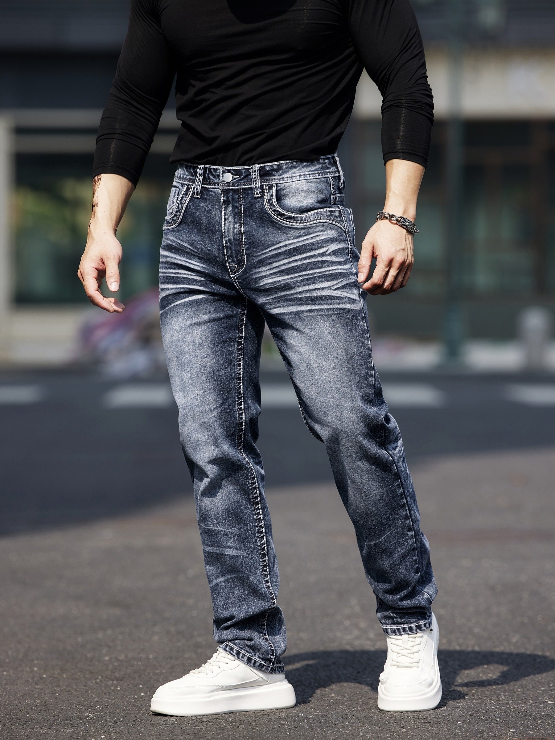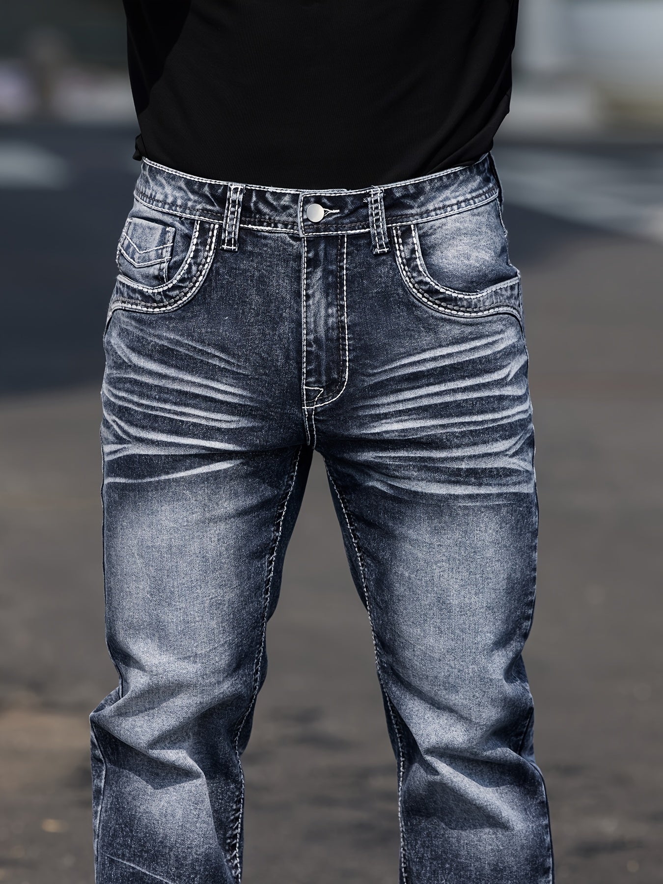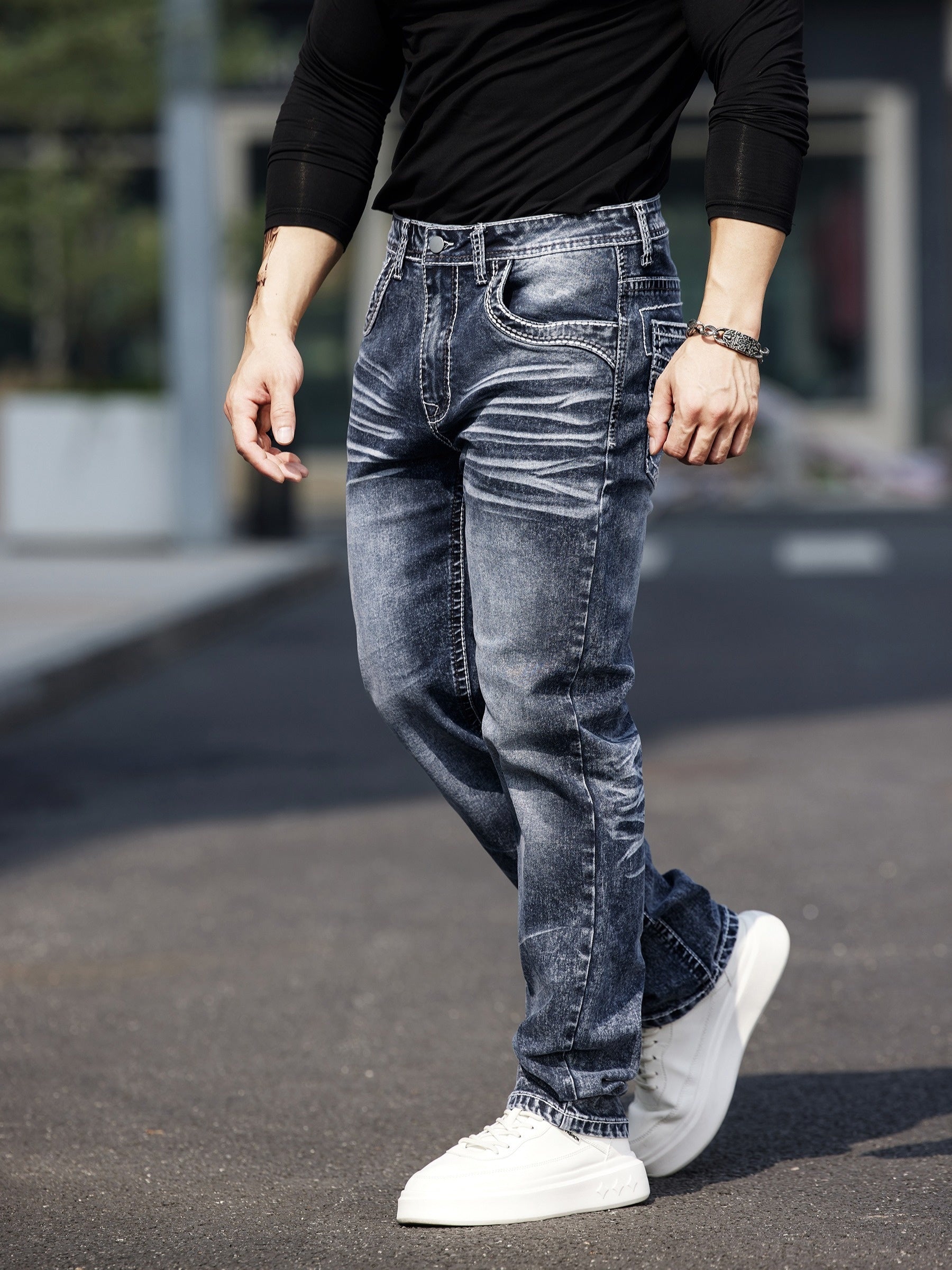 Erkaklar uchun vintage uslubidagi tikuvli elastik jinsilar, parchalar bilan bezatilgan - tor kesim, o'rtacha balandlik, mashinada yuvish mumkin