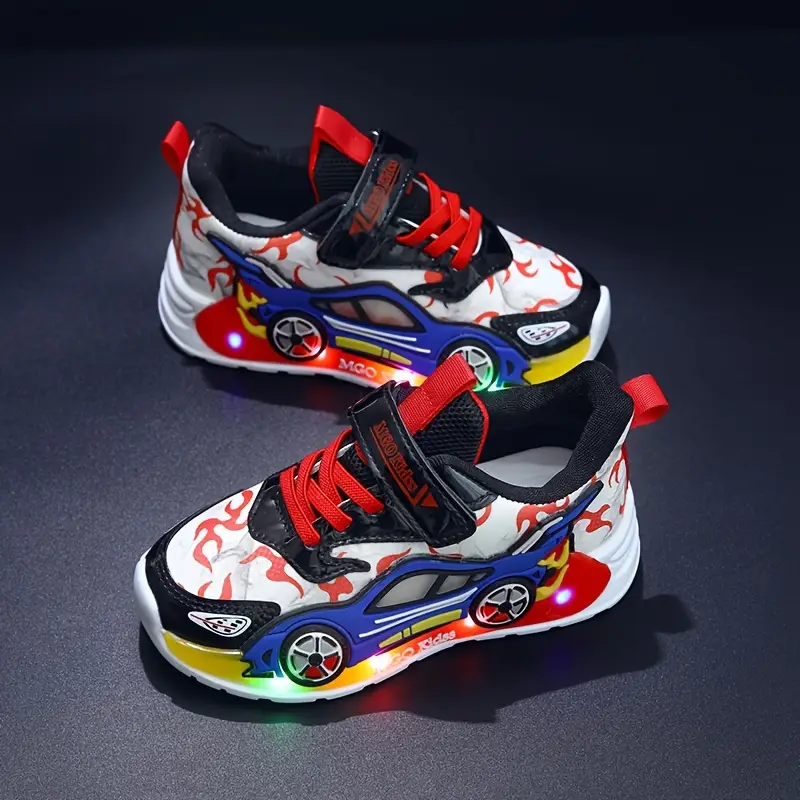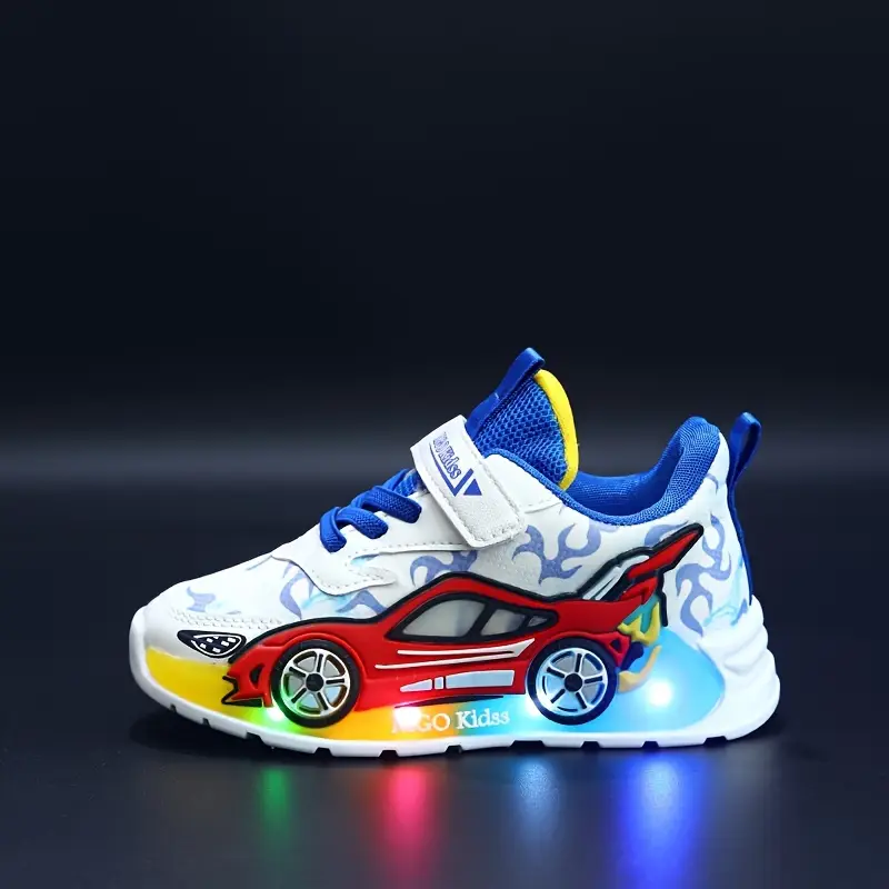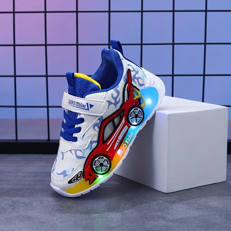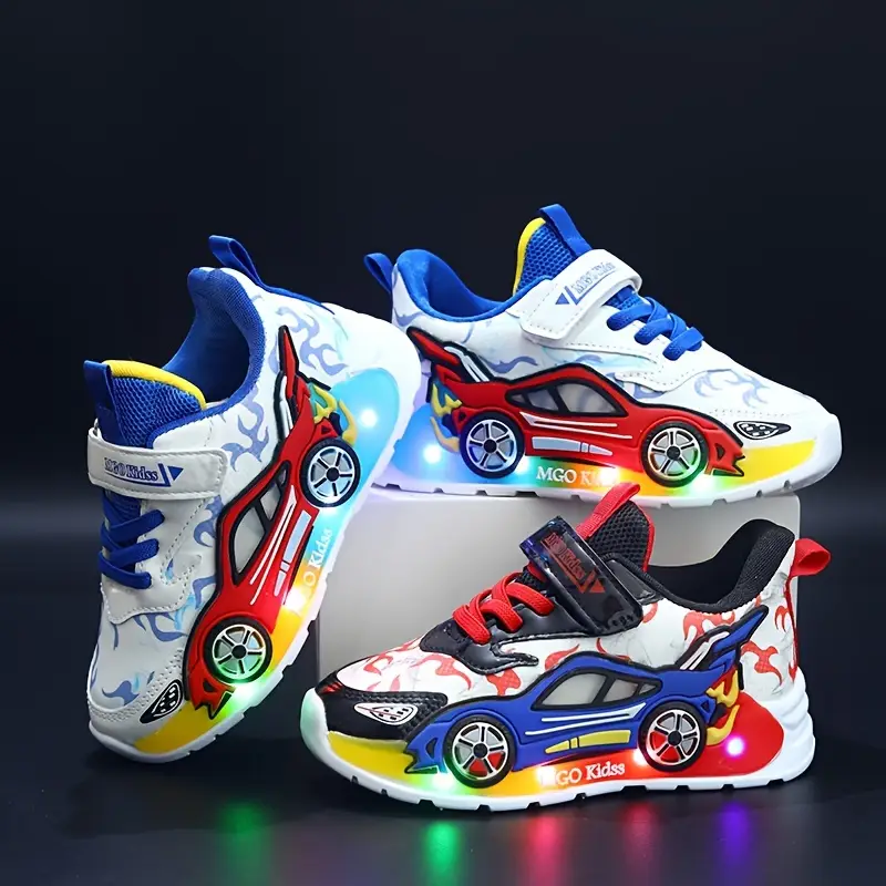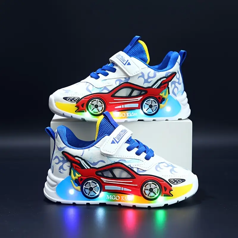 MGO bolalar uchun 14 yoshgacha bo'lgan o'g'il va qizlar uchun multfilm avtomobil dizayniga ega yoritilgan krossovkalar. LED yugurish poyabzallari, barcha mavsumlar uchun to'rli yuqori qismi, dumaloq barmoq, past yuqori va bir martalik batareya bilan.