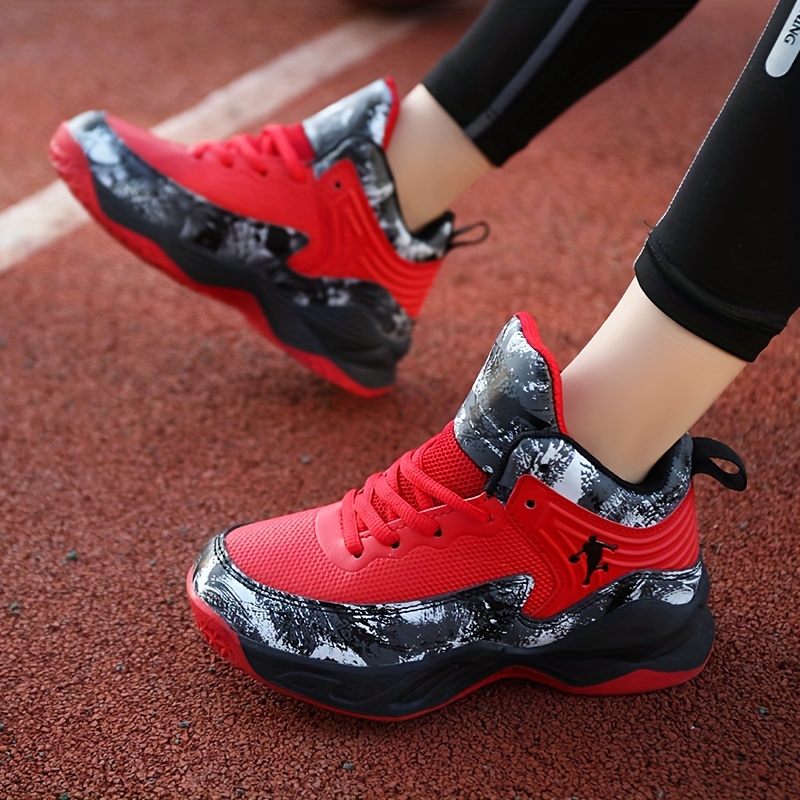 Qizil va qora dizayndagi o'rta balandlikdagi PU sport krossovkalari, tashqi mashg'ulotlar va norasmiy kiyim uchun TPR taglik.