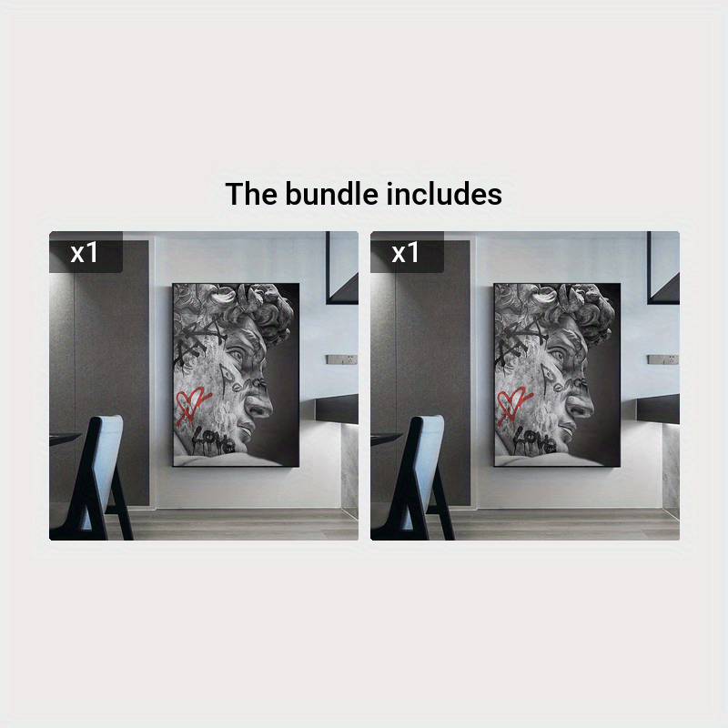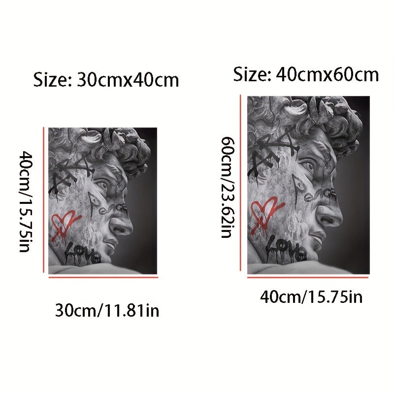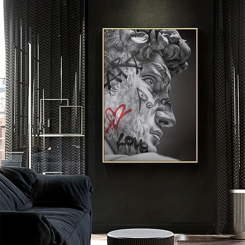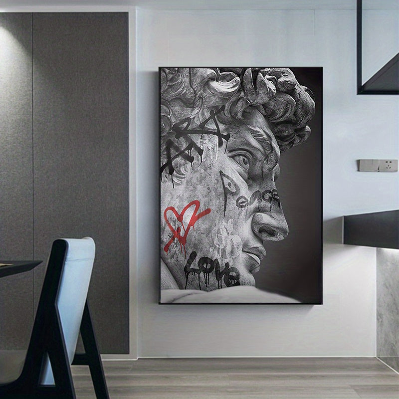 Zamonaviy kulrang devor san'ati, Mikelanjeloning David asari, graffiti va yurak aksentlari bilan, yashash xonasi, yotoqxona yoki ofis bezatish uchun.