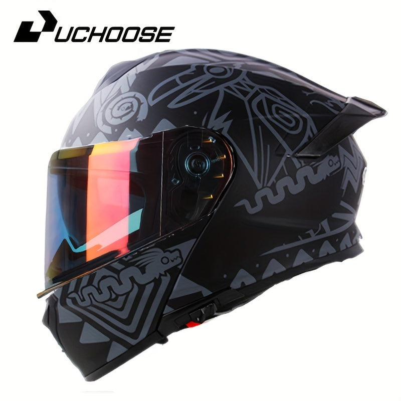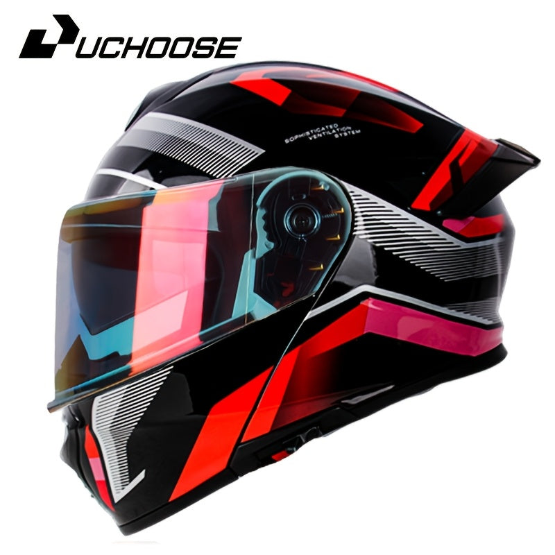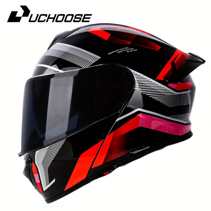 Zamonaviy mototsikl shlepi, ikki ko'zoynak, ajratiladigan yuz qopqog'i va yaxshilangan xavfsizlik xususiyatlari bilan qora rangda qizil va pushti aksentlar bilan. Mustahkam ABS qatroni konstruktsiyasi. Mototsikl xavfsizlik uskunalari.