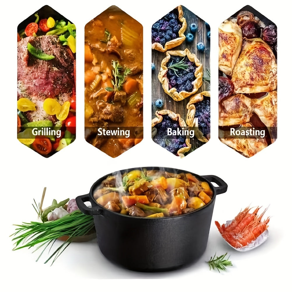 Ko'p funksiyali quyma temir qozon qopqog'i bilan - Pishirish, qaynatish va qovurish uchun mukammal, mustahkam va ko'p maqsadli Golland qozoni va skovorodka kombinatsiyasi, kuchli uy jihozlari, plita va pechda foydalanish uchun.