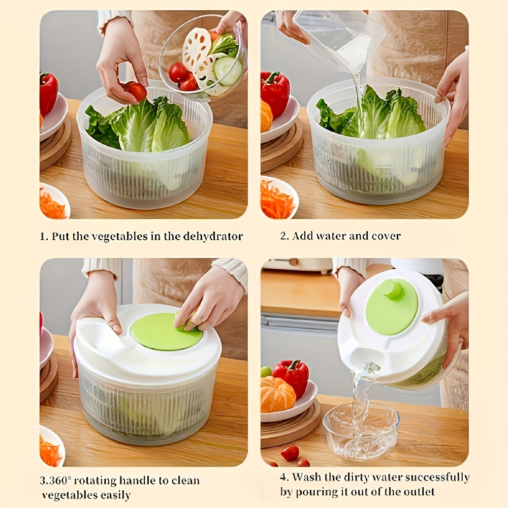 Ko'p funksiyali oshxona aylantiruvchi va qurituvchi, sabzavot va meva kolandri. Mustahkam PP materialidan tayyorlangan, oson salat tayyorlash vositasi. Oq asos, yashil aksentlar bilan. Sog'lom ovqat uchun ideal.