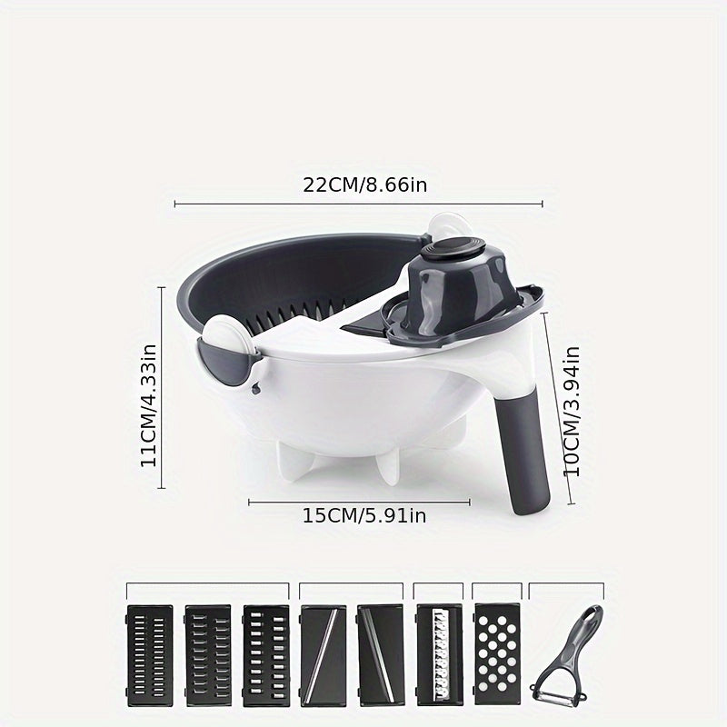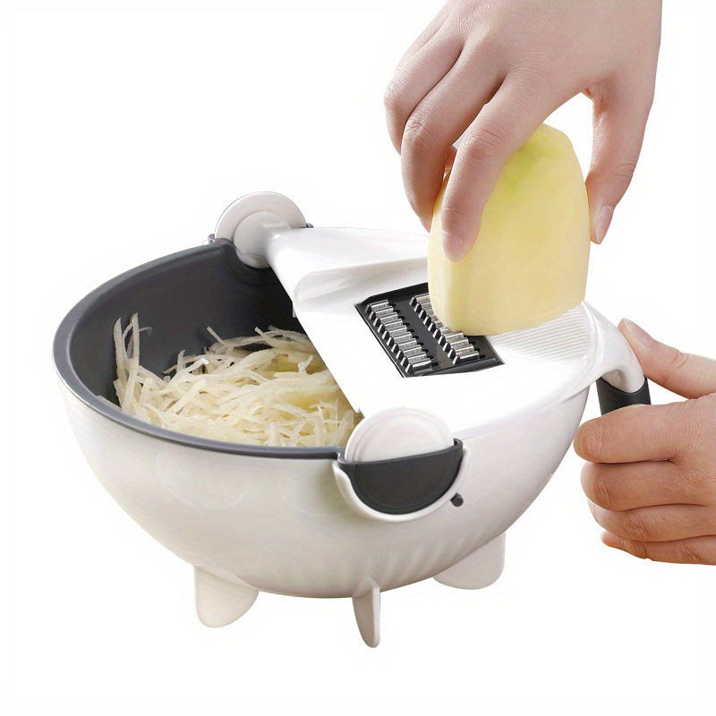 Ko'p funksiyali sabzavot kesgichi, suyuqlikni to'kib tashlash uchun savat bilan, zaryadsiz PC materialidan tayyorlangan.