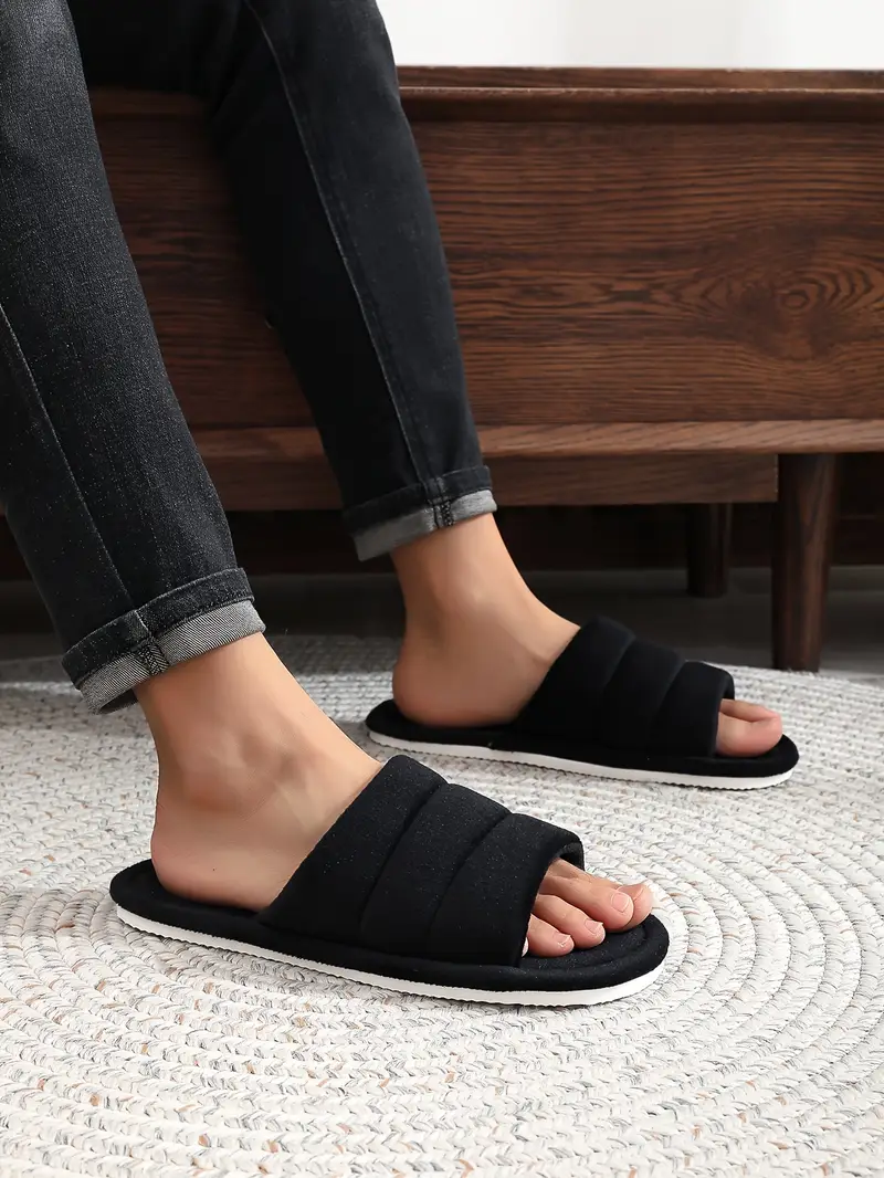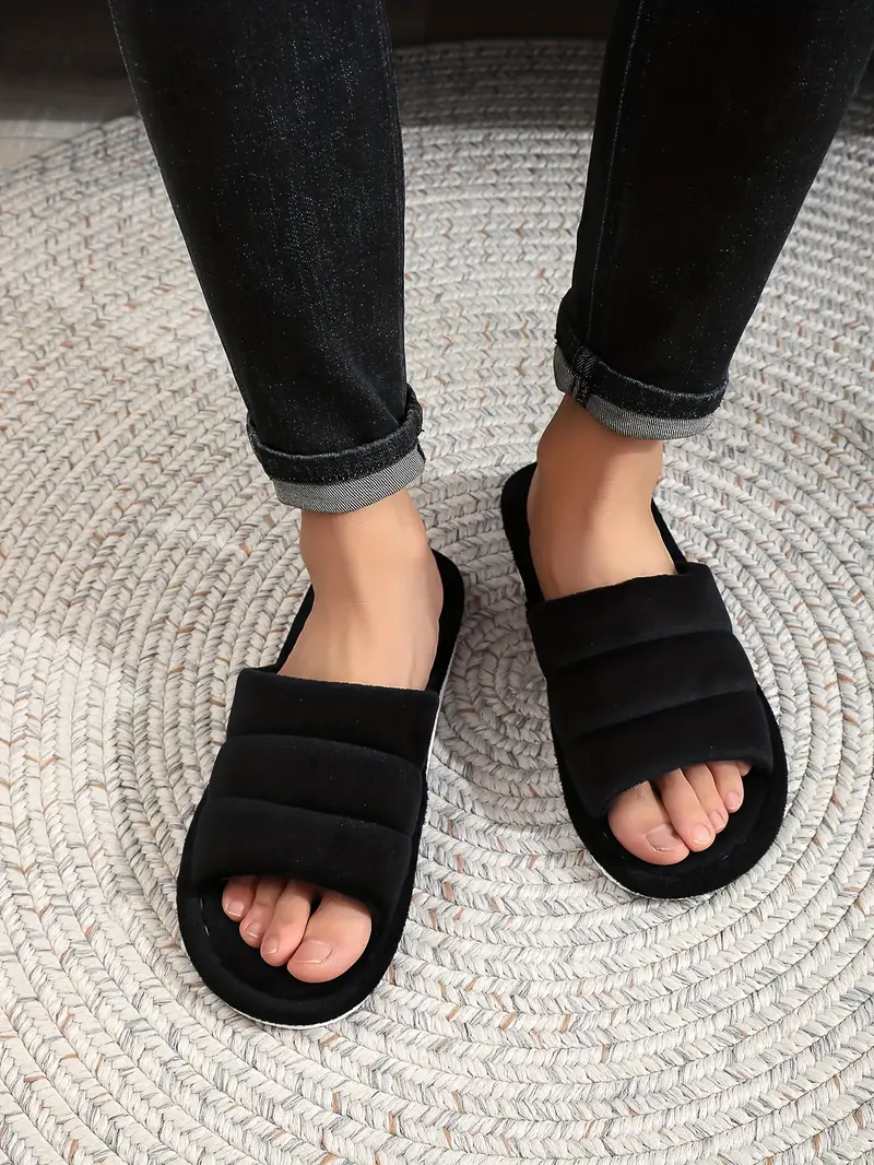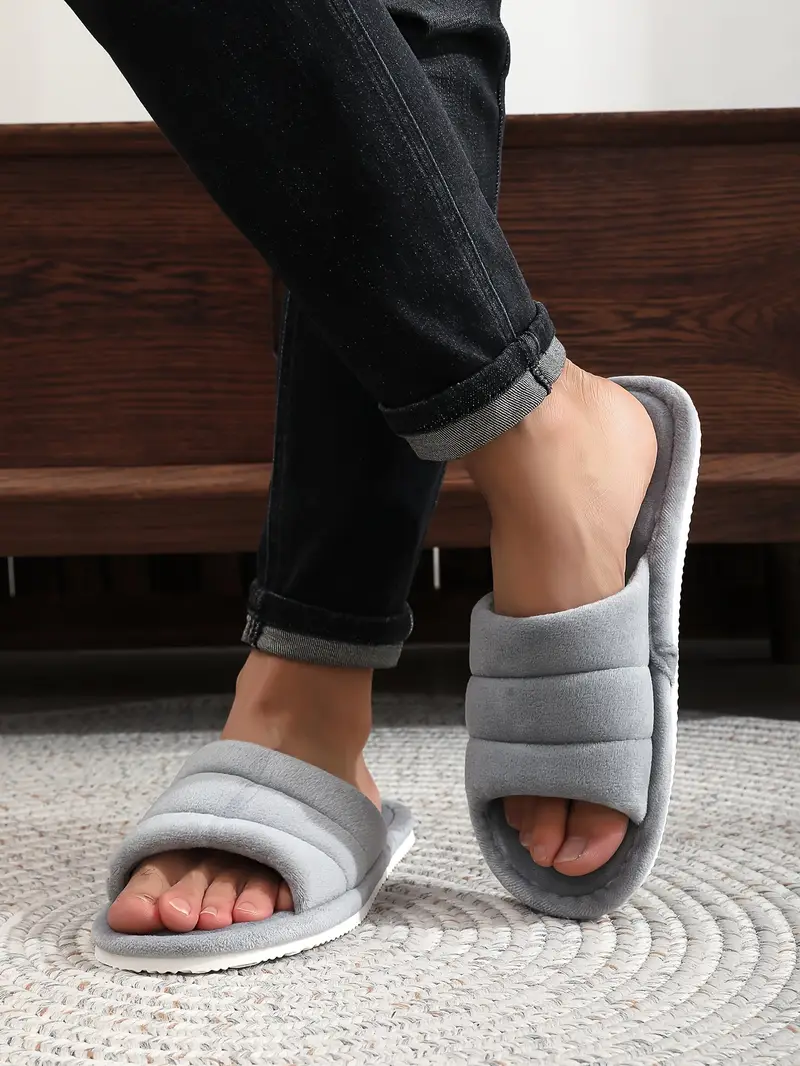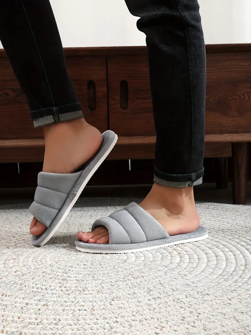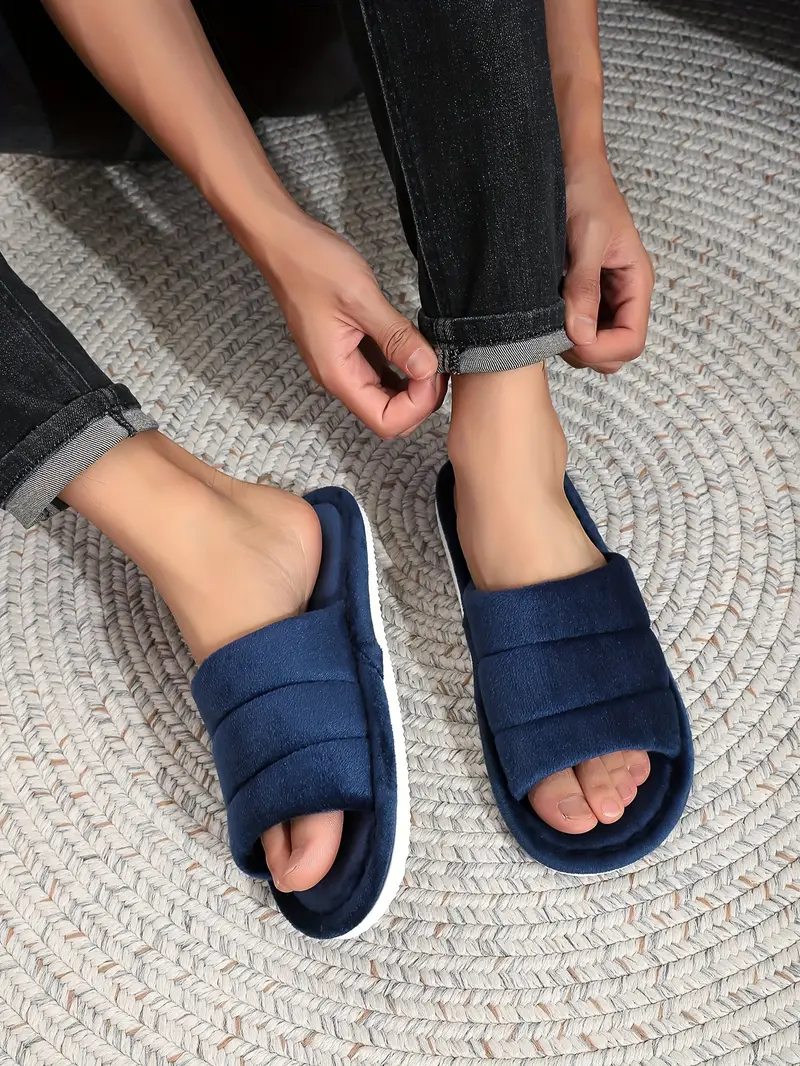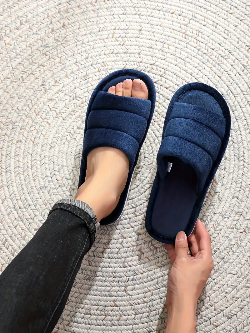 "Ochiq barmoq bilan va sirpanmaydigan taglikka ega dengiz ko'k qulay plush uy poyabzallari - juftliklar uchun mukammal."