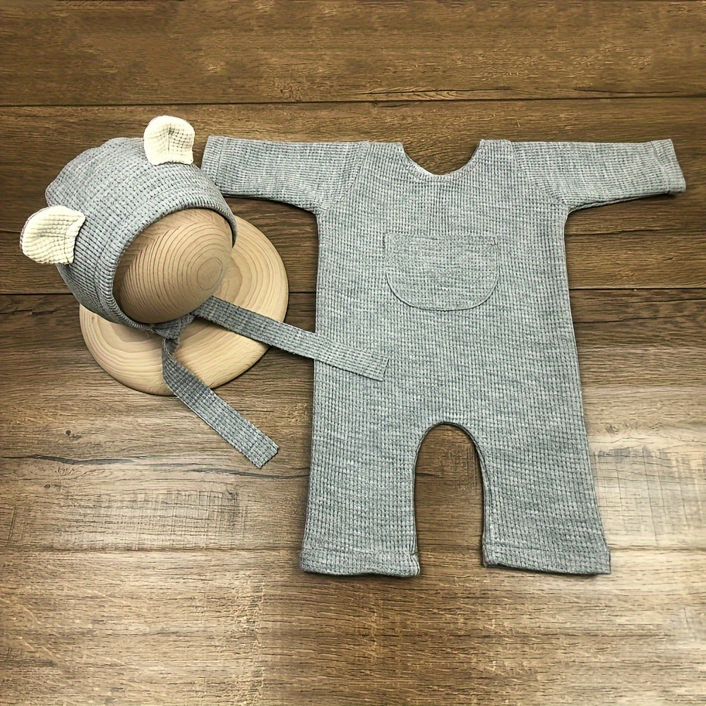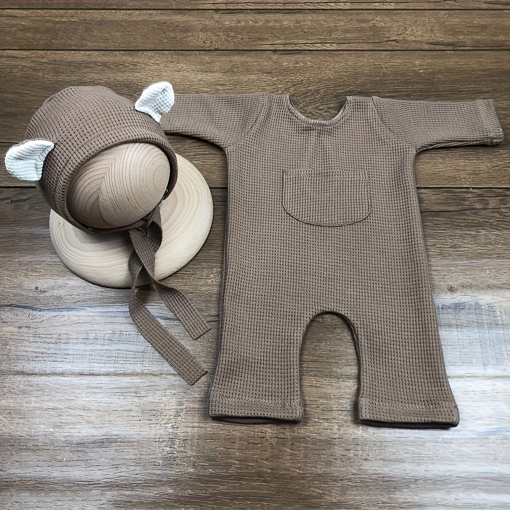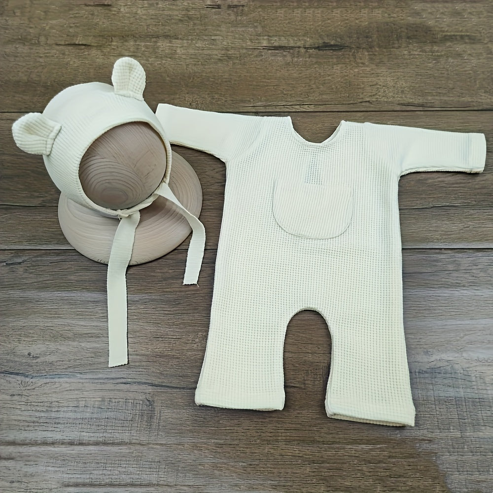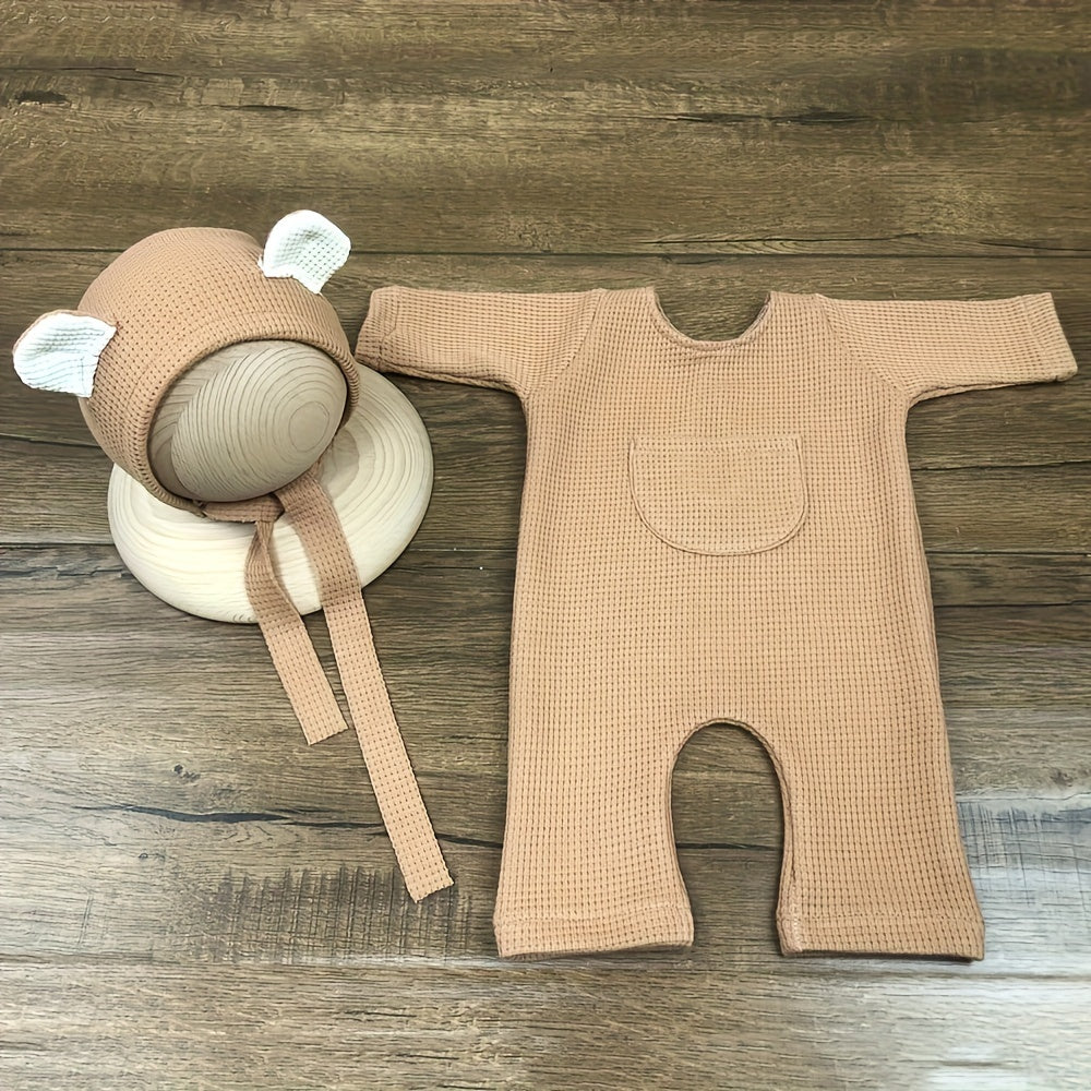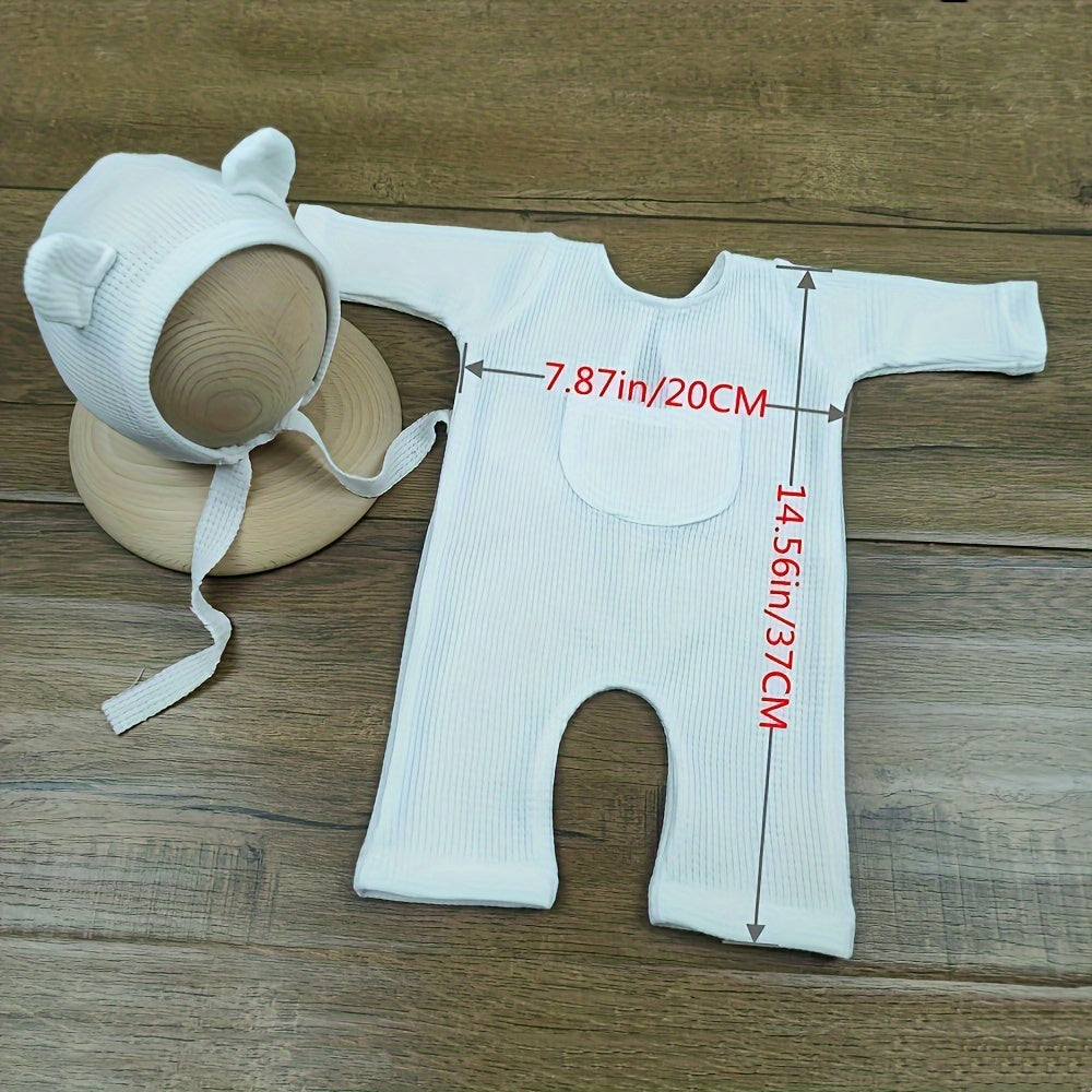 Yangi tug'ilgan chaqaloq fotosurati uchun to'qilgan shlyapa va tanaga mos keladigan bodi kostyumi