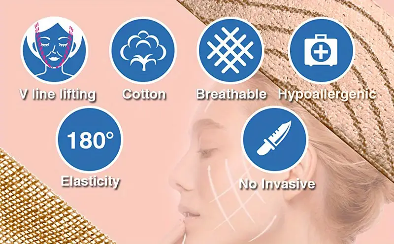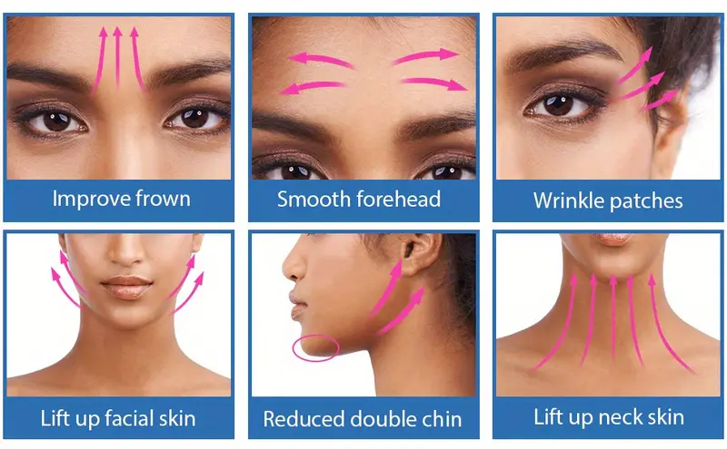 Bosh, ko'zlar, bo'yin va V chiziqni ko'tarish uchun invaziv bo'lmagan yuz ko'tarish lentasi. Gippoallergen, nafas oladigan va qayta zaryadlanadigan yopishqoq ko'tarish bantlari yuz konturini shakllantirish va ajinlarni silliqlash uchun.