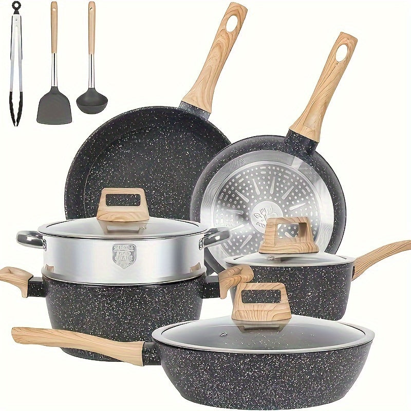 Non-Stick Cookware Set 12 ta alyuminiy qozon va panadan iborat bo'lib, induksiya bilan pishirish uchun mos. Ular mashinada yuvish va pechga chidamli, va ajraladigan tutqichlar bilan ta'minlangan. Muhim pishirish uskunalari to'plami.