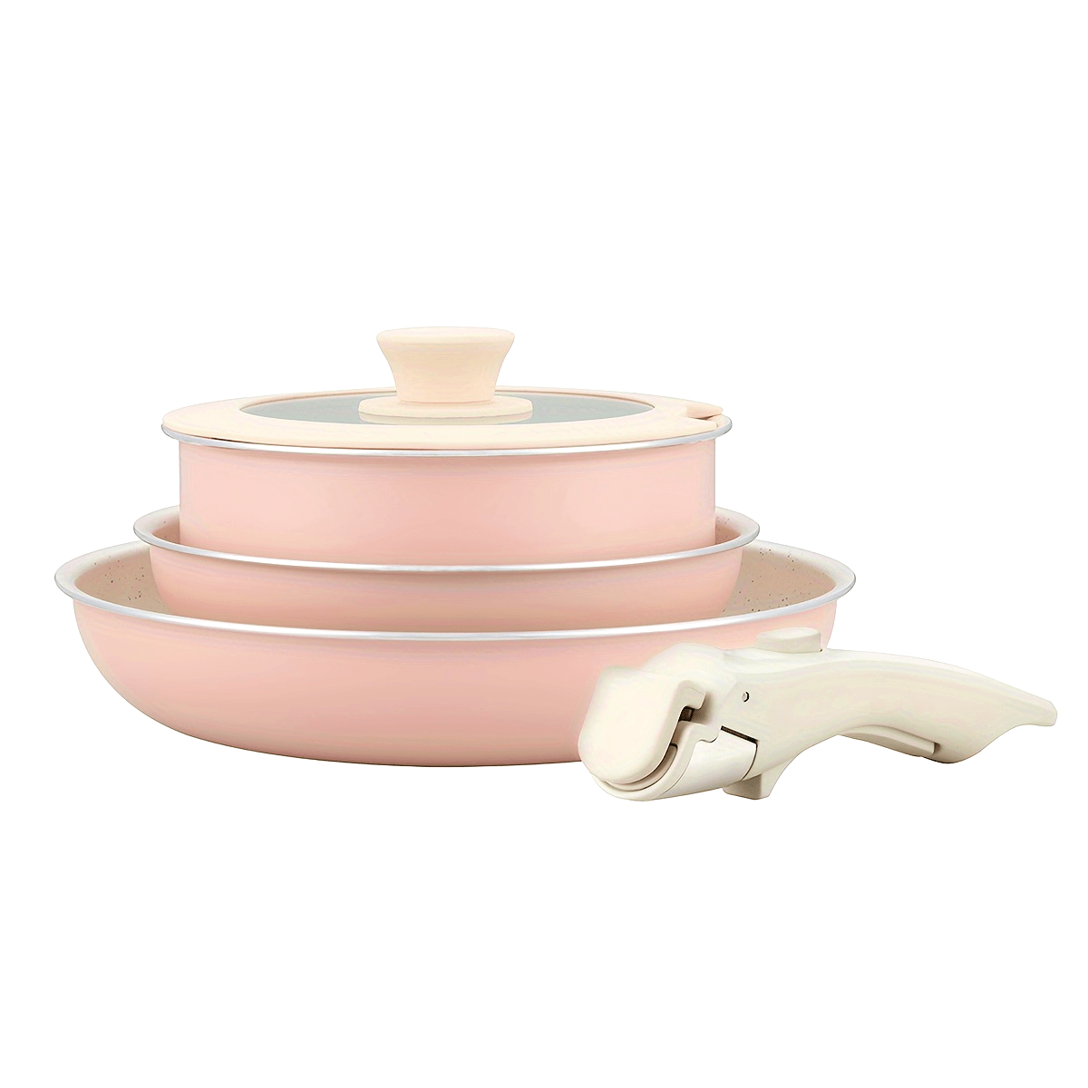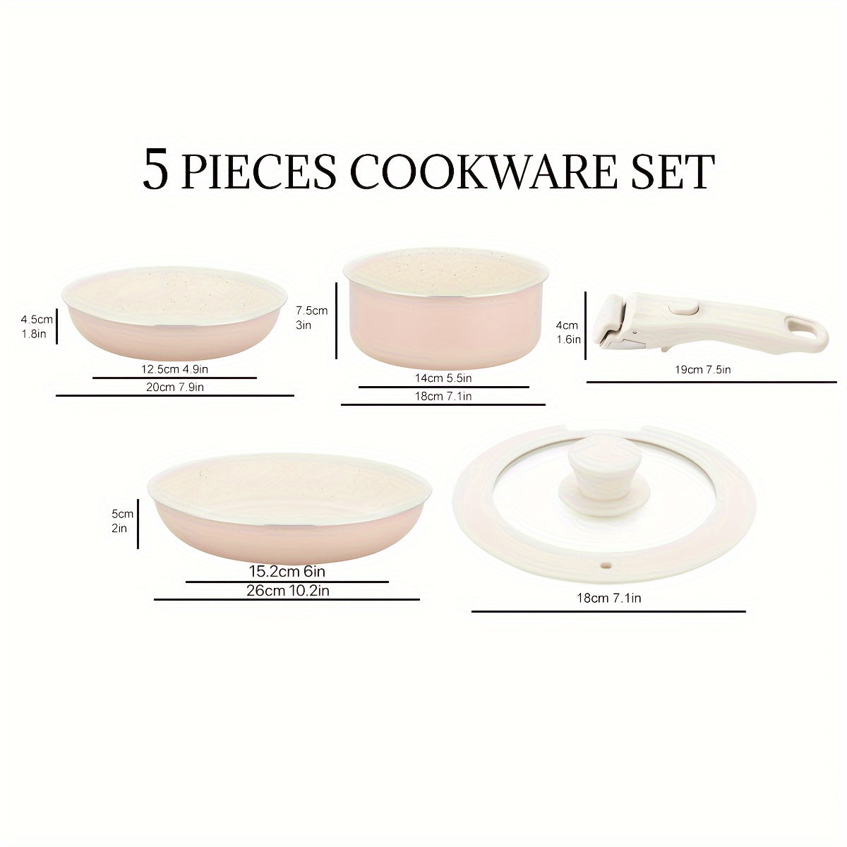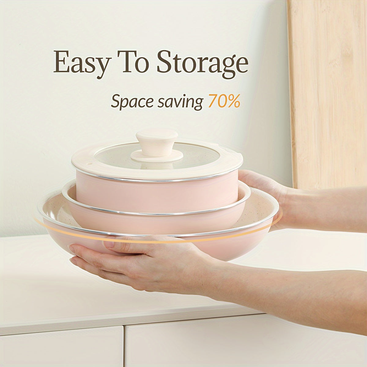 Yopishqoq emas pishirish to'plami - 5 dona, olib tashlanadigan tutqichlar bilan, pechda ishlatish uchun xavfsiz, qulay saqlash uchun yig'iladigan. Sayohat va uy oshxonalari uchun ideal.