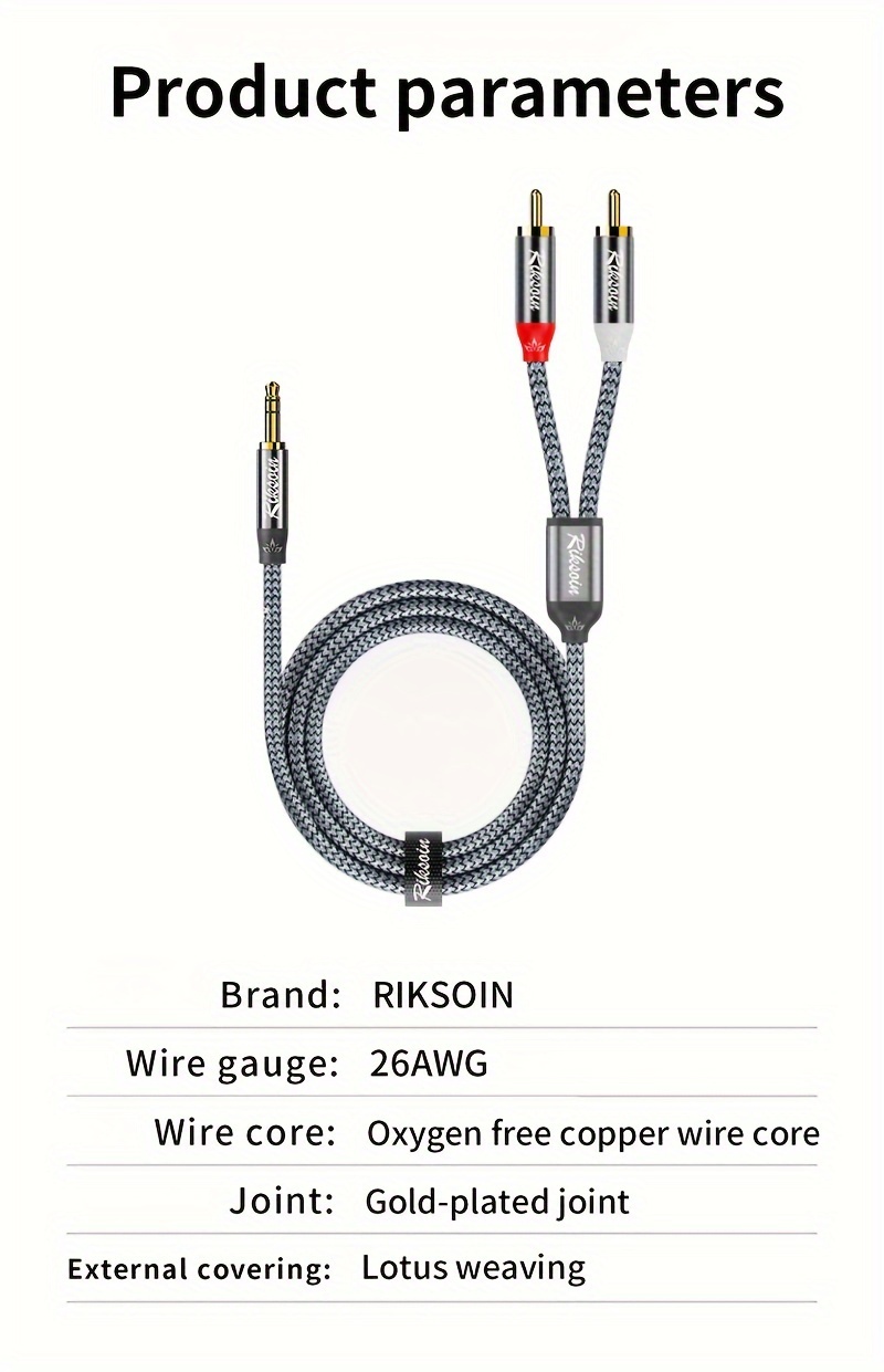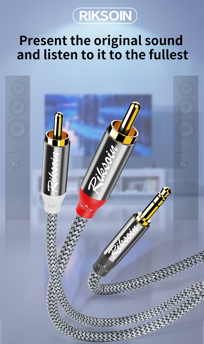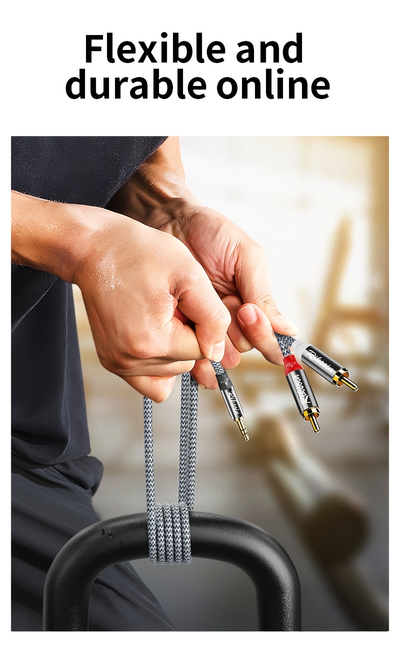 Nylon to'qilgan 3.5mm erkakdan 2RCA audio kabeli turli qurilmalar va tizimlar uchun, stereo ovoz taqdim etadi.