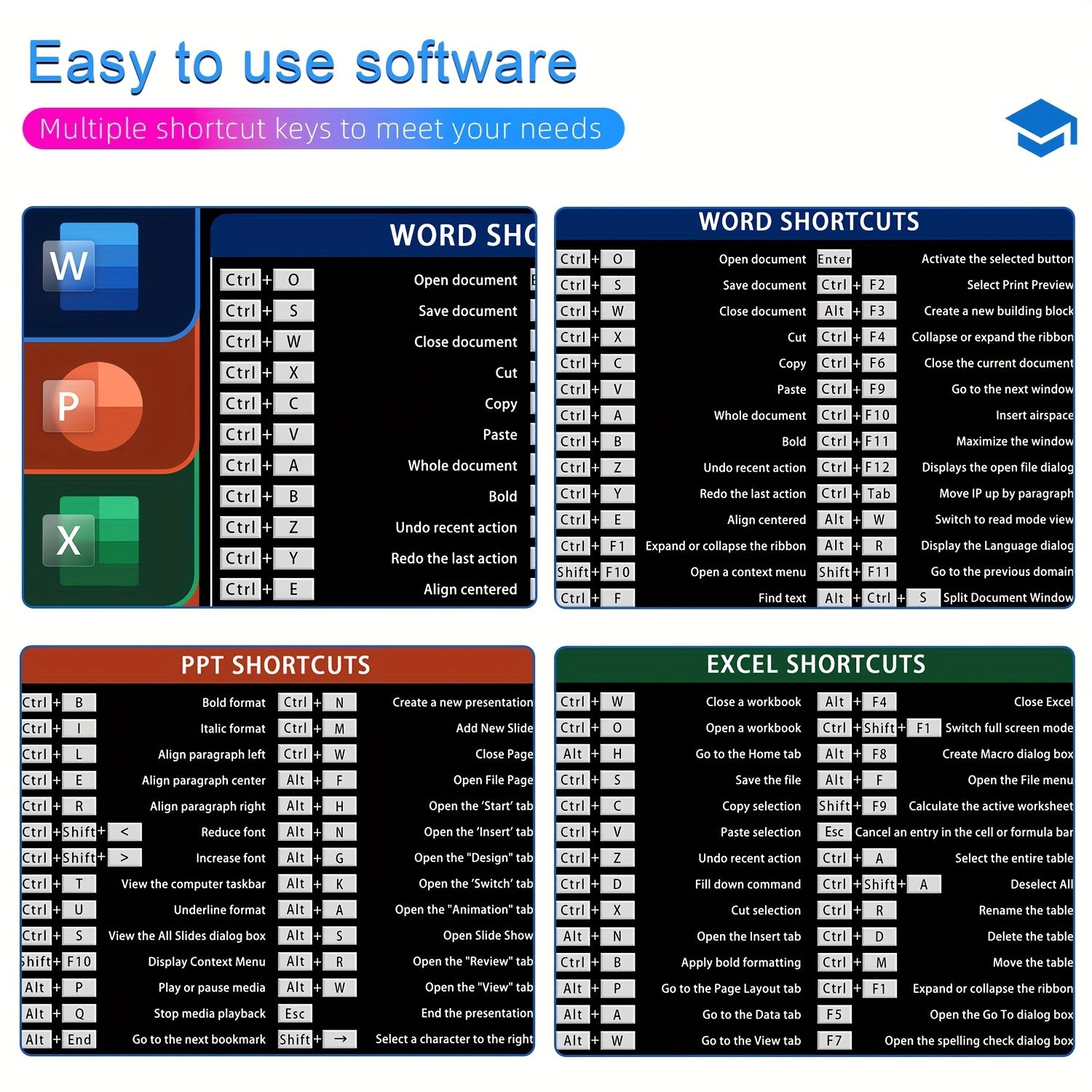 Ofis va uyda foydalanish uchun sirpanmaydigan dizaynga ega to'rtburchakli kauchuk sichqoncha pad, Office dasturlari uchun klaviatura qisqa tugmalari bilan. Mustahkam va tozalash oson.
