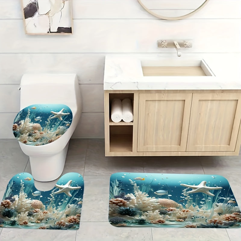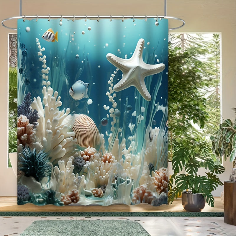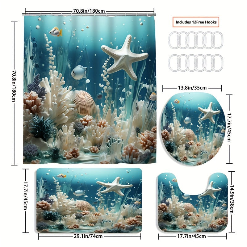 Koʻk koral bosma dush pardasi toʻplami, suv oʻtkazmaydigan pardali mato va ganchlar bilan