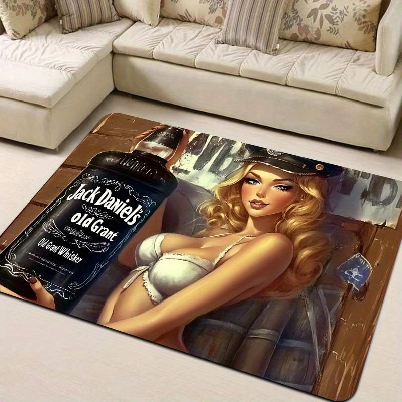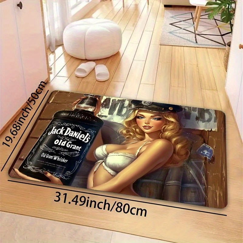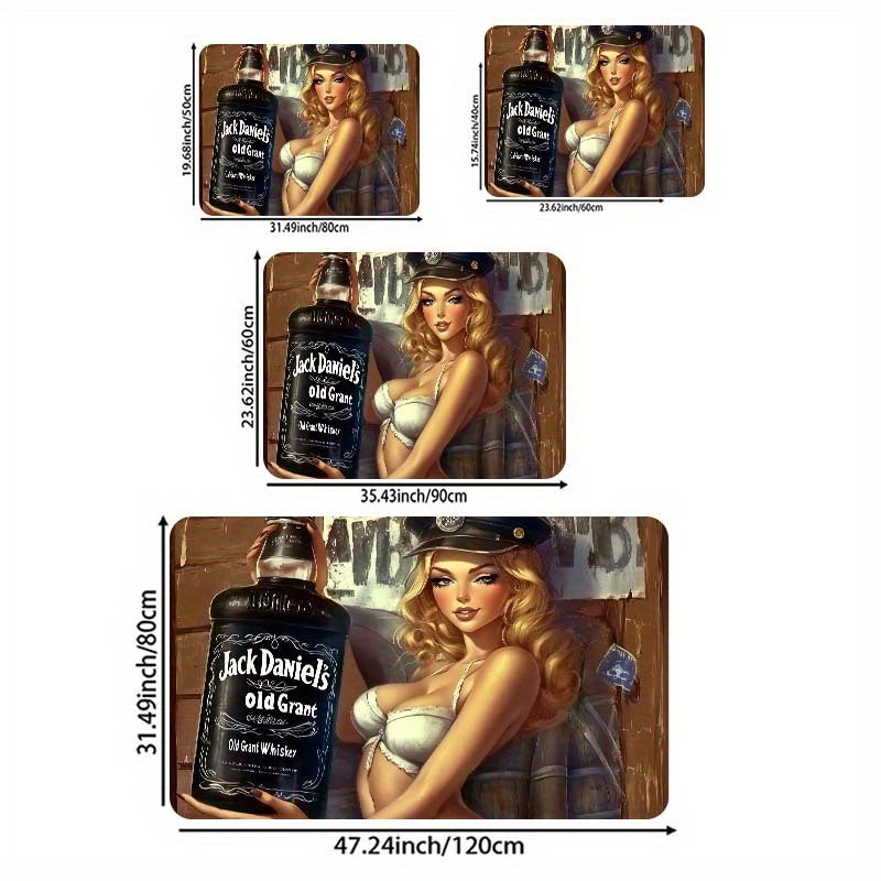 Bir dona viski mavzusidagi seksi Pin-Up qiz eshik matosi, Polyester va PVC orqa qismi bilan, sirpanmaydigan to'rtburchak ichki pol matosi. Mashina bilan yuvishga qulay va O'yin xonasi, hammom, oshxona, mehmonxona va yotoqxona uchun mos.