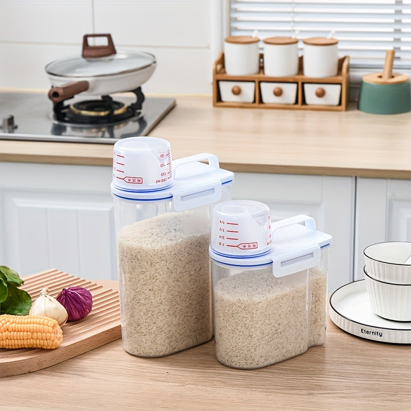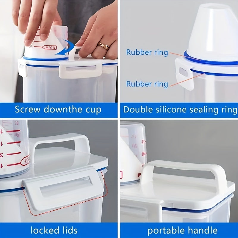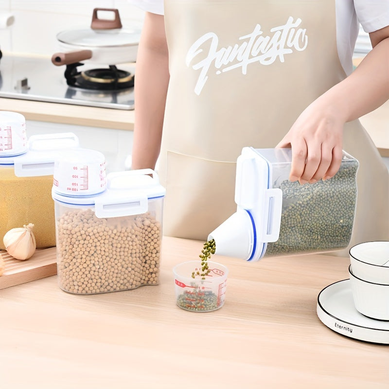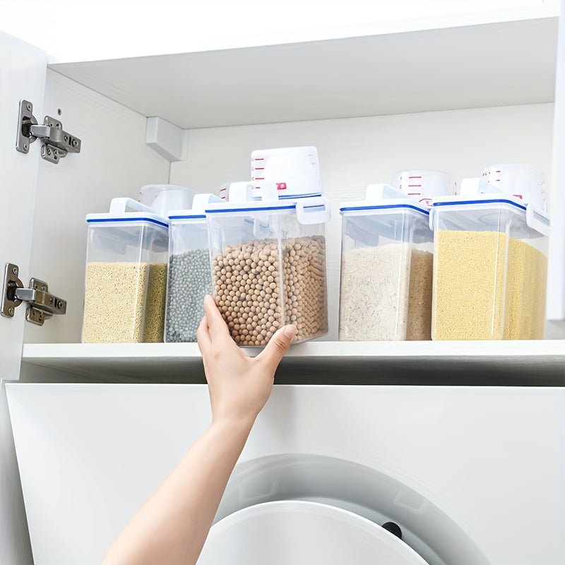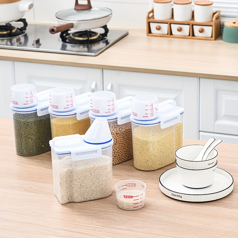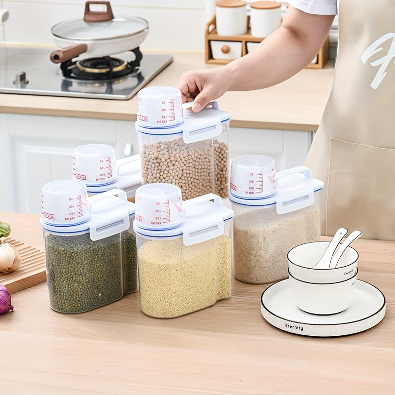 Bir muhrlangan guruch idishi va turli oziq-ovqat bankalari to'plami, katta sig'imli, namlikka chidamli dizayn va o'lchov stakanini o'z ichiga oladi, oshxona jihozlari uchun mukammal.