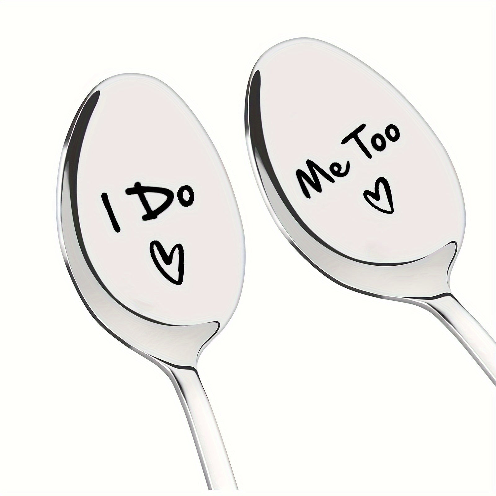 "I Do" va "Me Too" yozuvlari bilan bir to'plam ikki zanglamas po'lat qoshiq, qahva, muzqaymoq, choy va shirinliklar uchun mukammal. To'y, Sevishganlar kuni, Yubiley, Nikoh yoki Tug'ilgan kun sovg'alari uchun ideal. Sevishganlar kuni partiya ta'minoti."