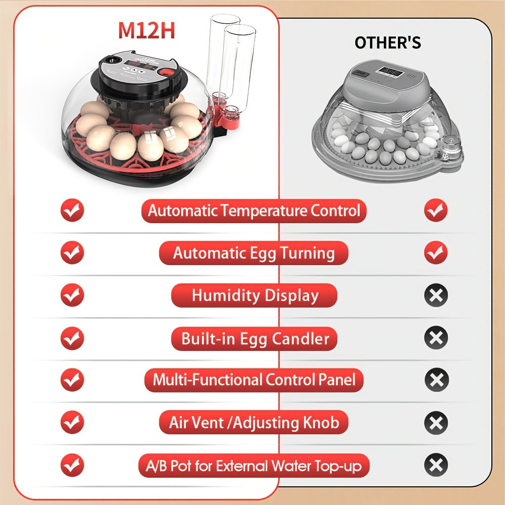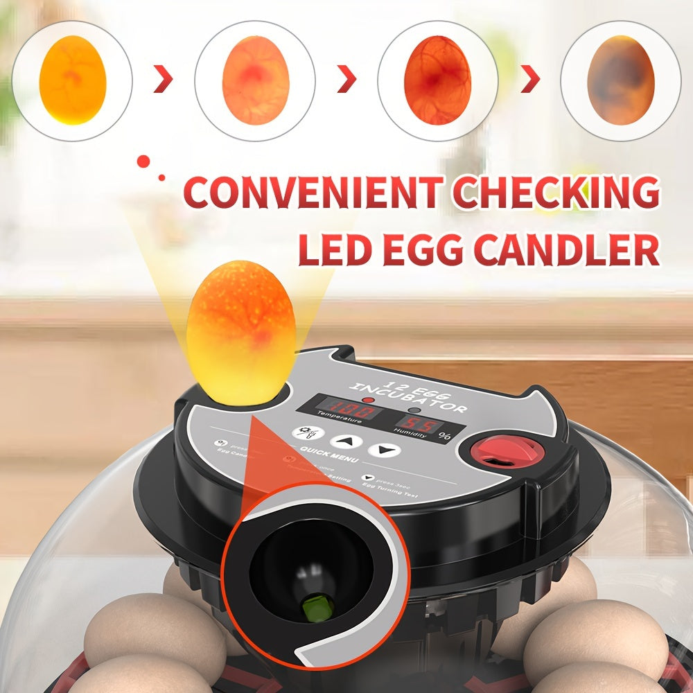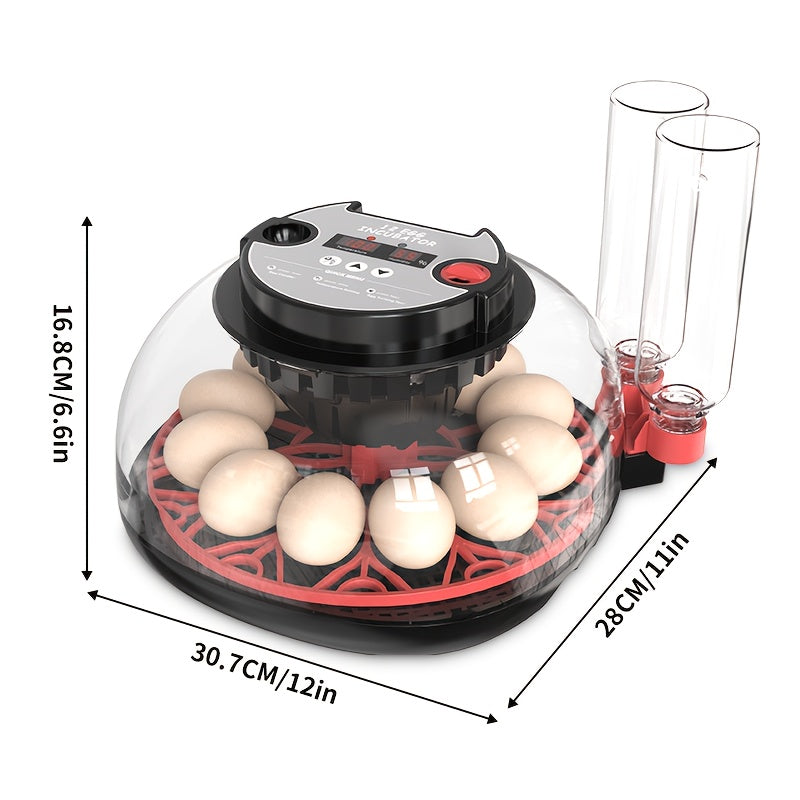 Paketga 12 tuxum uchun to'liq avtomatik inkubator, aylantirish va namlikni nazorat qilish funksiyalari bilan birga, uyda turli qush tuxumlarini inkubatsiya qilish uchun ideal hisoblanadi.
