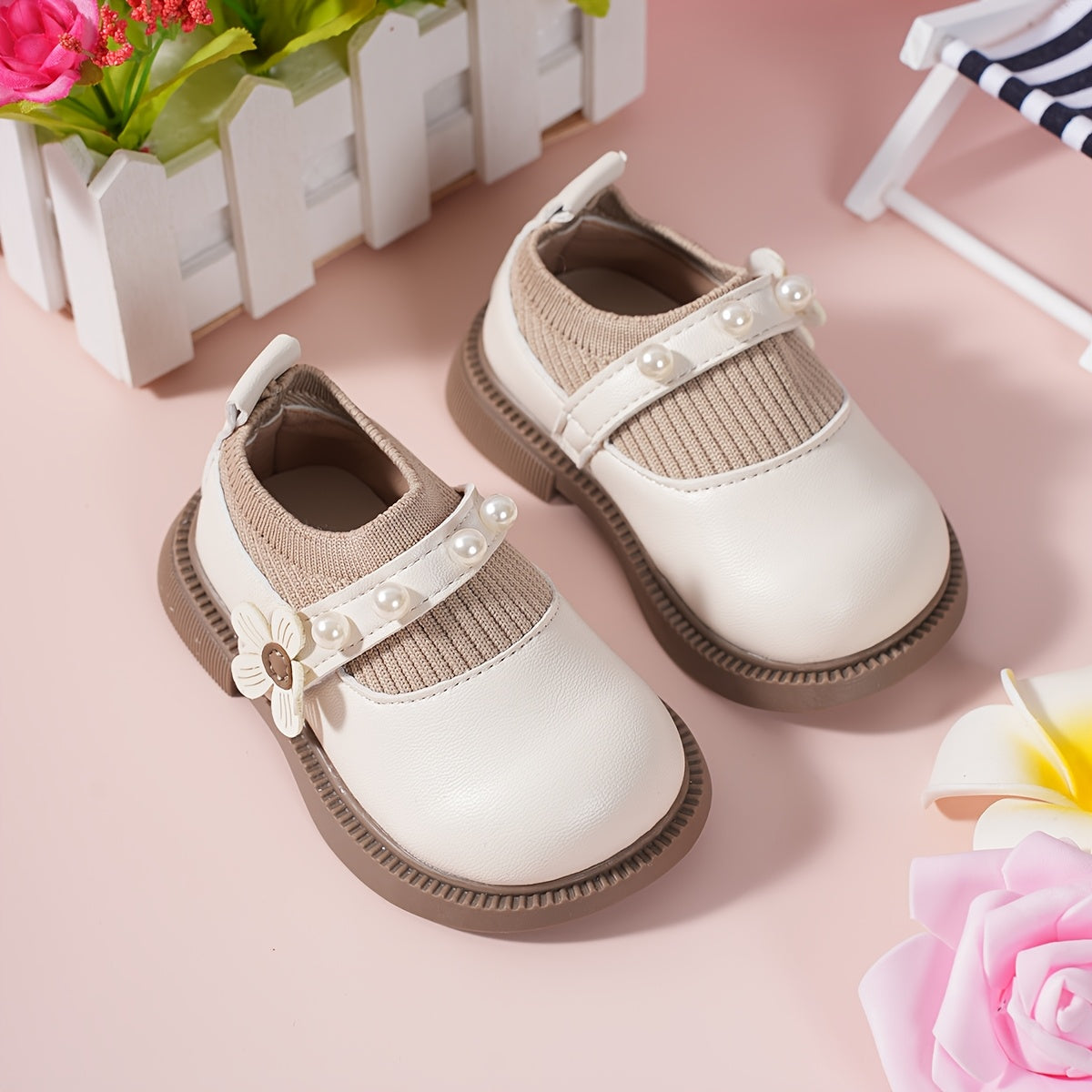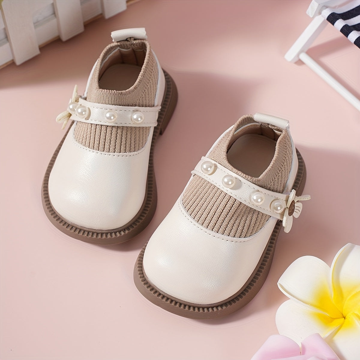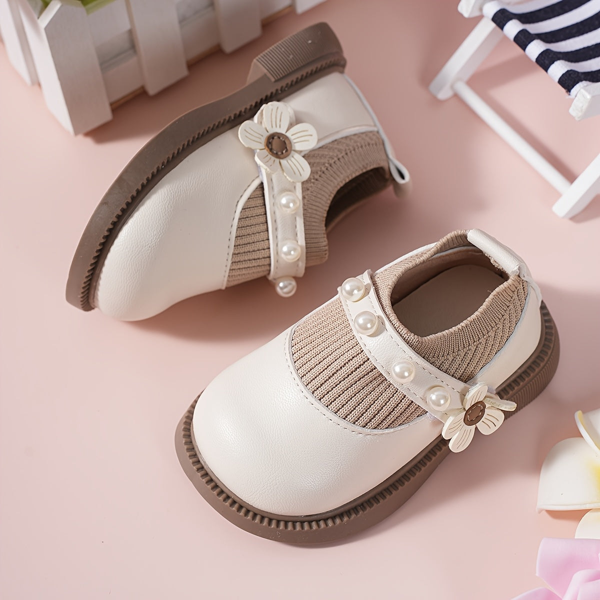 Yangi tug'ilganlar va kichkina bolalar uchun bolalar poyabzali, barcha mavsumlar uchun PU mato bilan bezatilgan gulli marjonli qizlar uchun flatlar