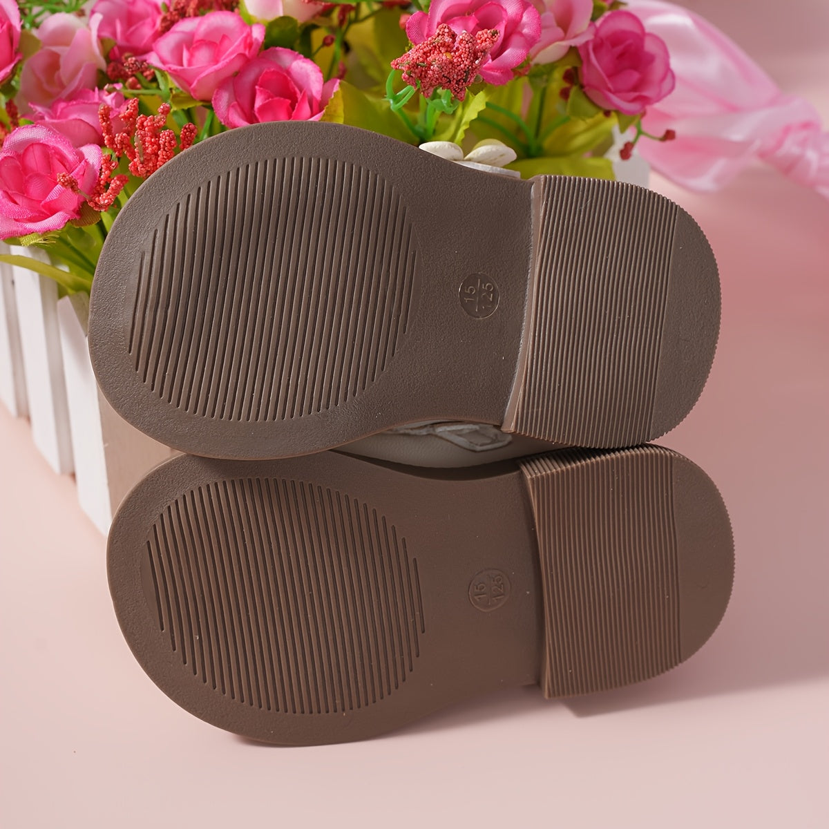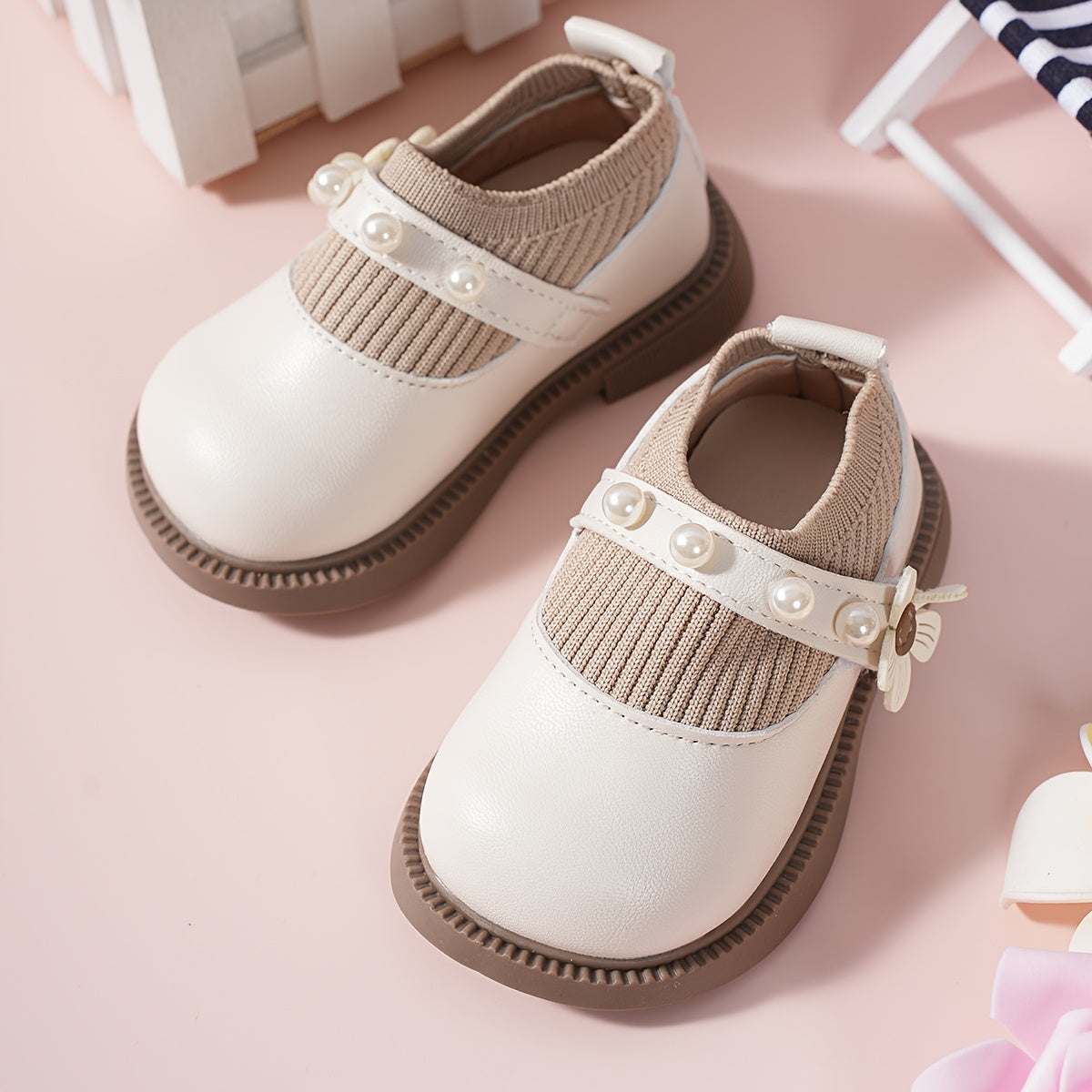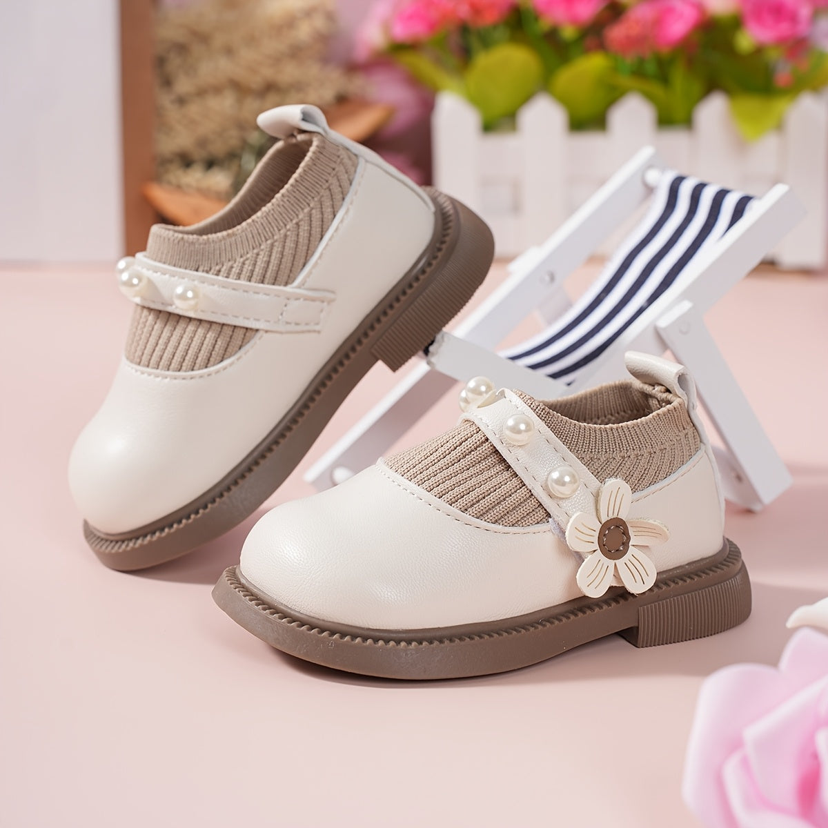 Yangi tug'ilganlar va kichkina bolalar uchun bolalar poyabzali, barcha mavsumlar uchun PU mato bilan bezatilgan gulli marjonli qizlar uchun flatlar