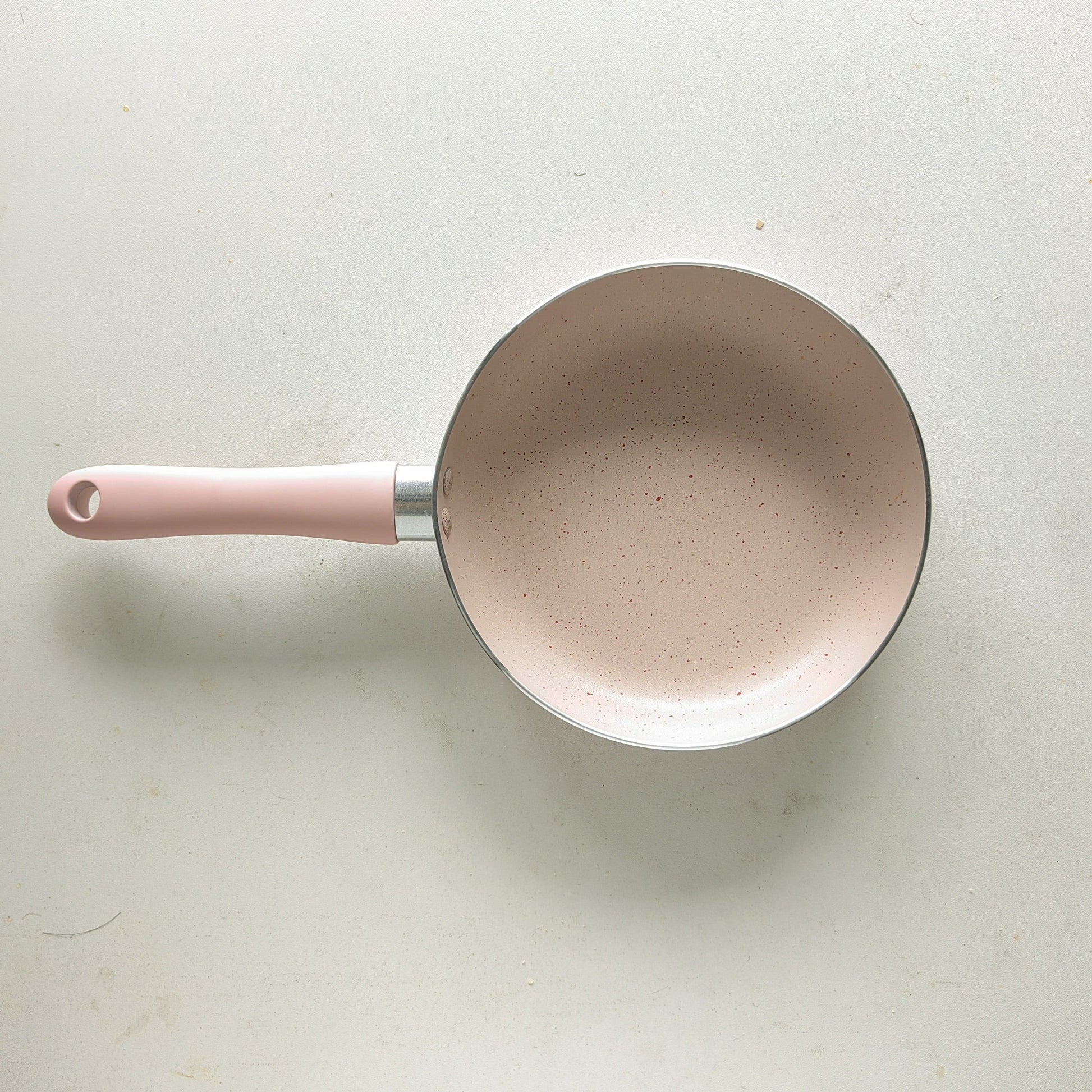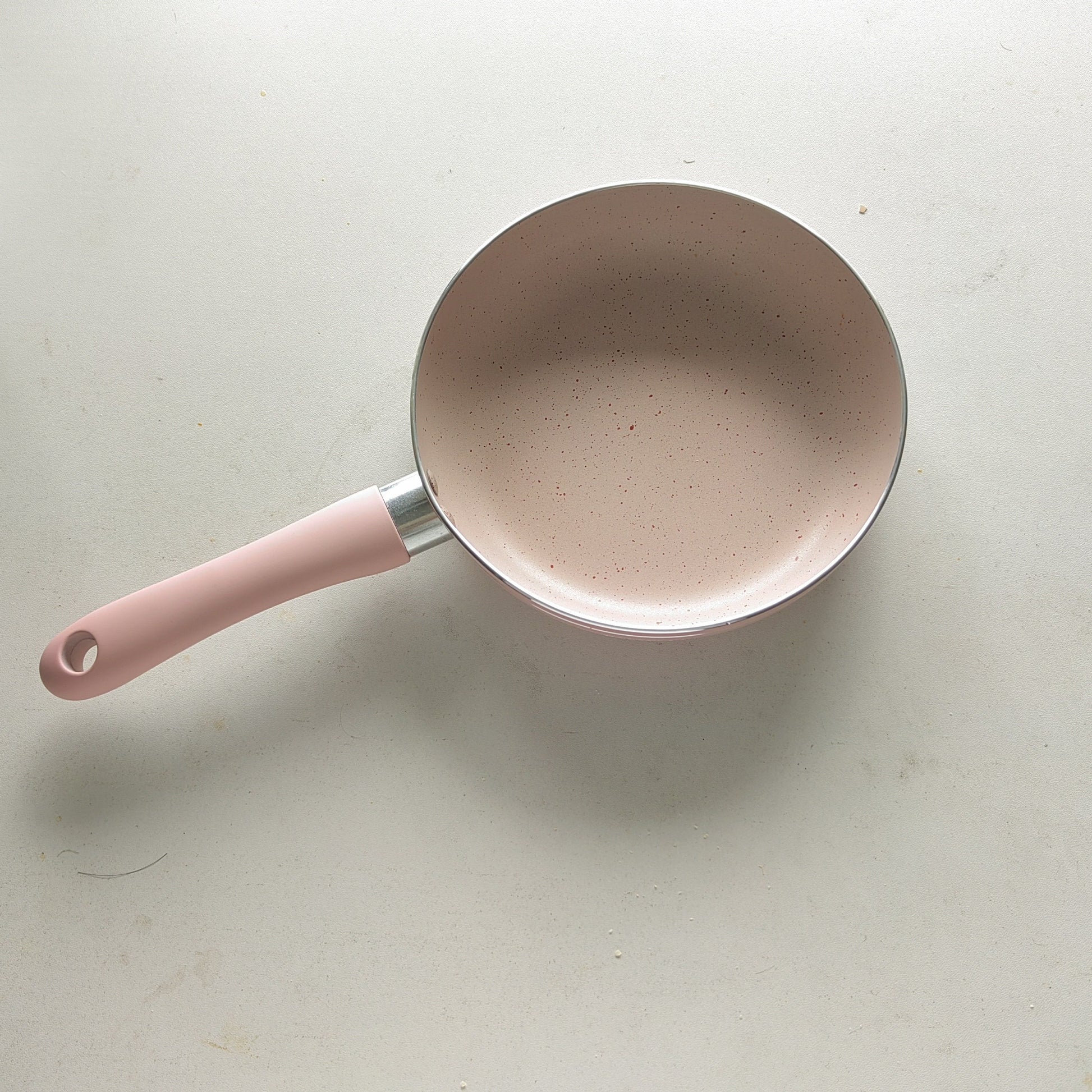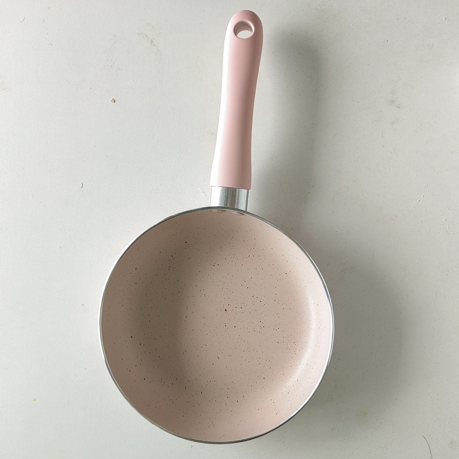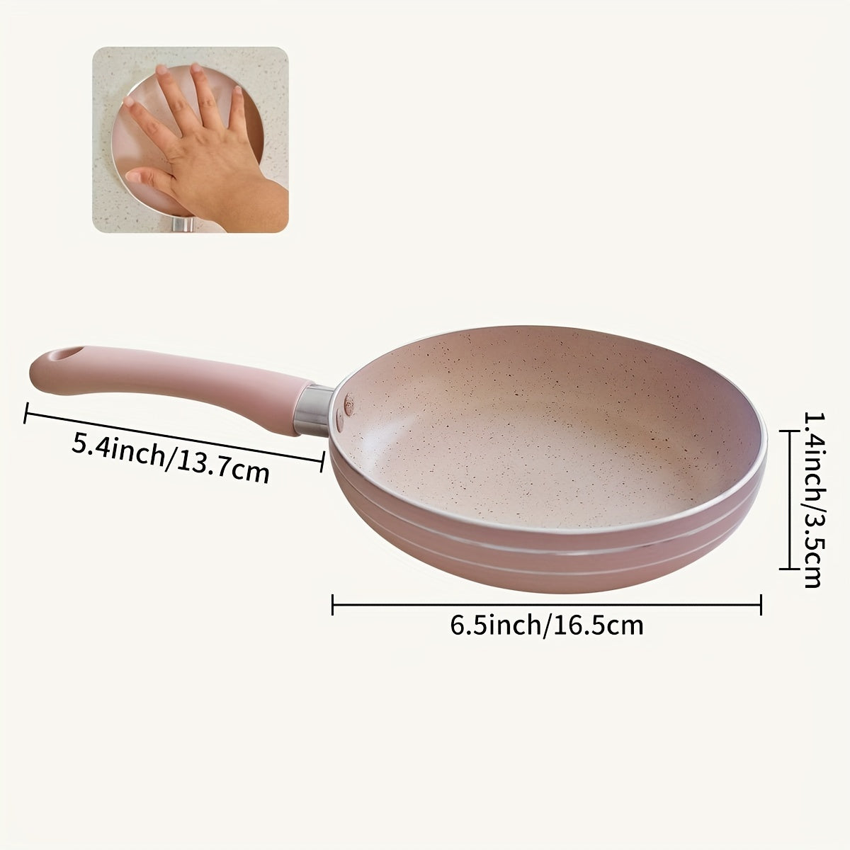 Pushti alyuminiy mini qovurish panasi, tekis pastki va silikon tutqichi bilan, o'lchami 16.51 sm. Yengil va gaz pechkasida tuxum va steak qovurish uchun mos.
