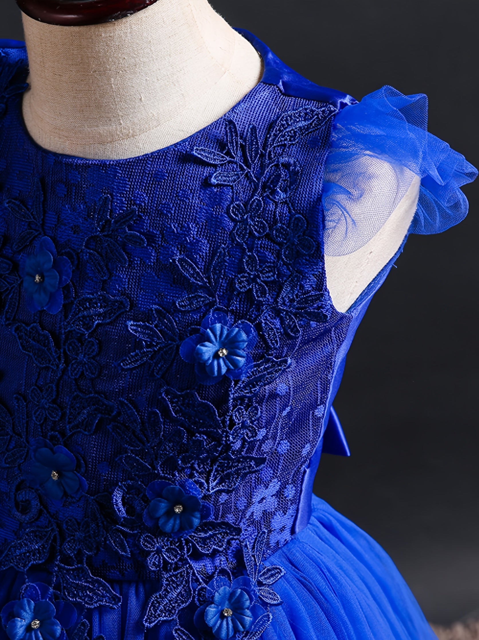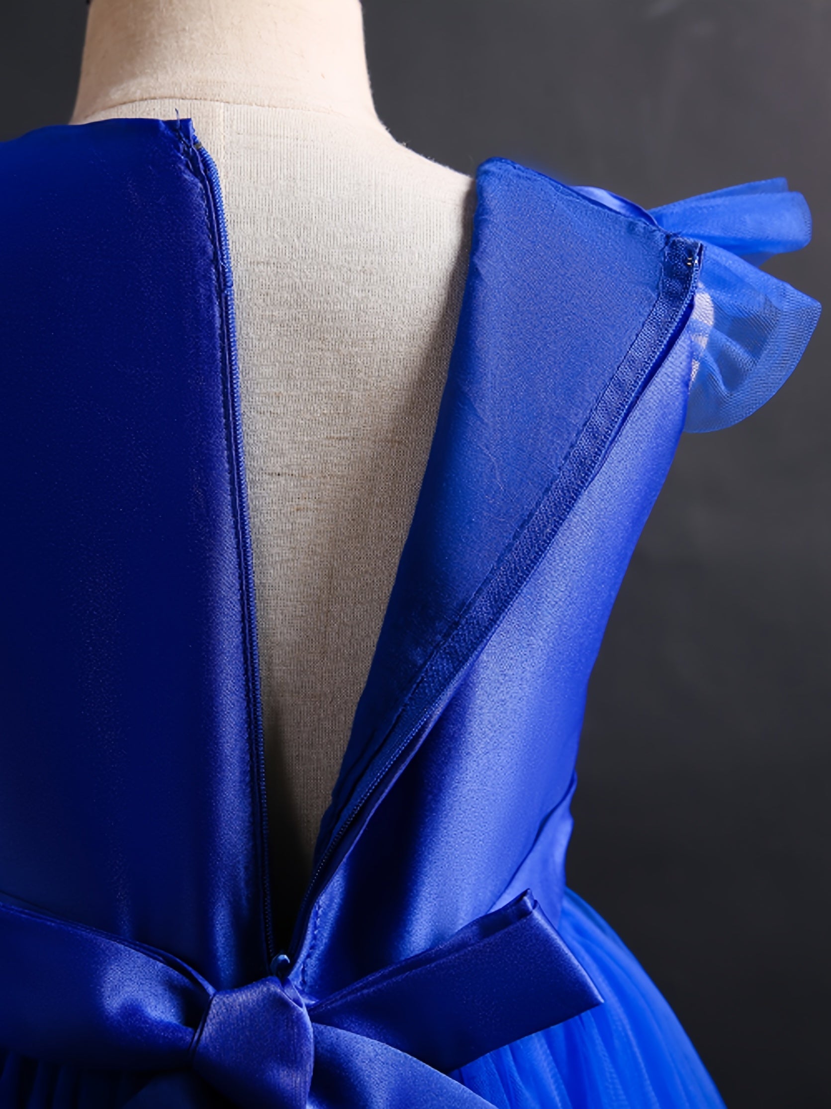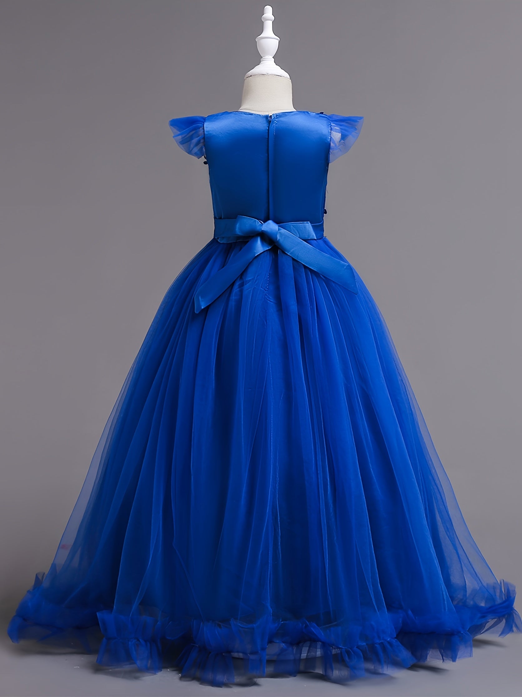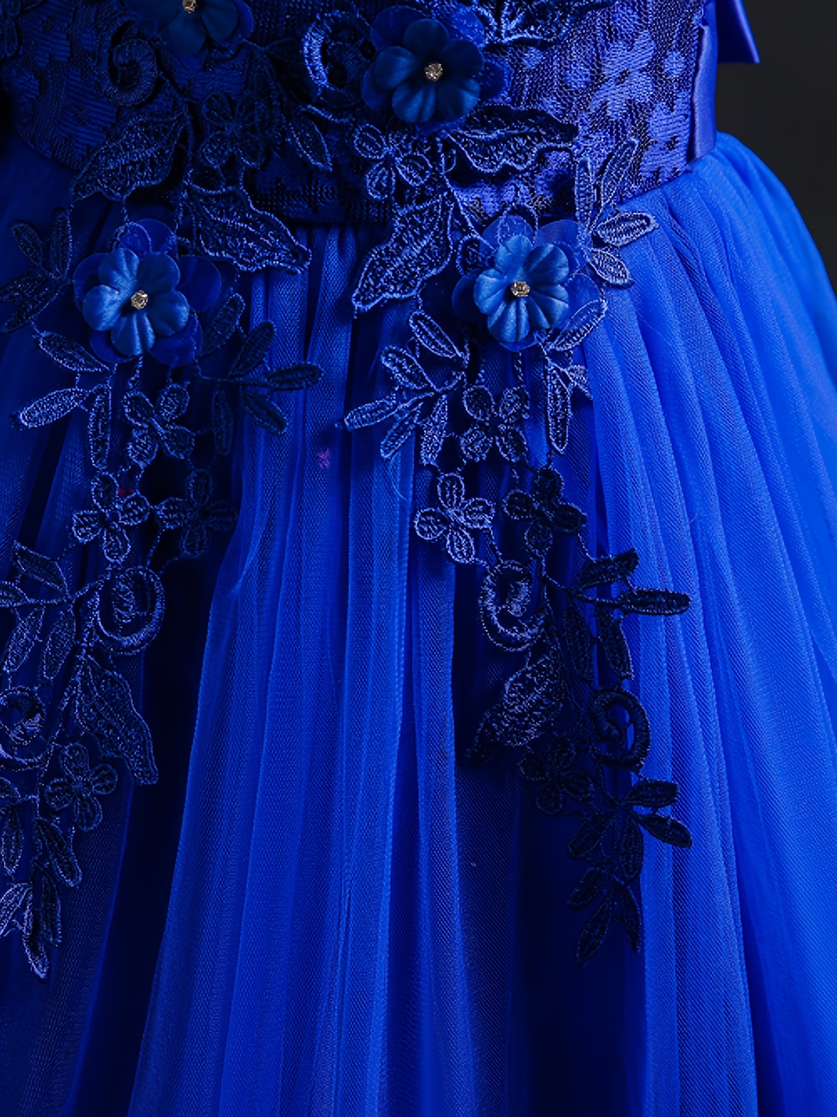 Qizlar uchun pushti malika libosi, yelkasiz, qirrali yelka detali bilan, A-shaklidagi tull skirti, belga bog'langan, nafis dantel trim va appliqué dizayni, 5-14 yoshdagi bolalar uchun mos, tug'ilgan kun uchun ideal.