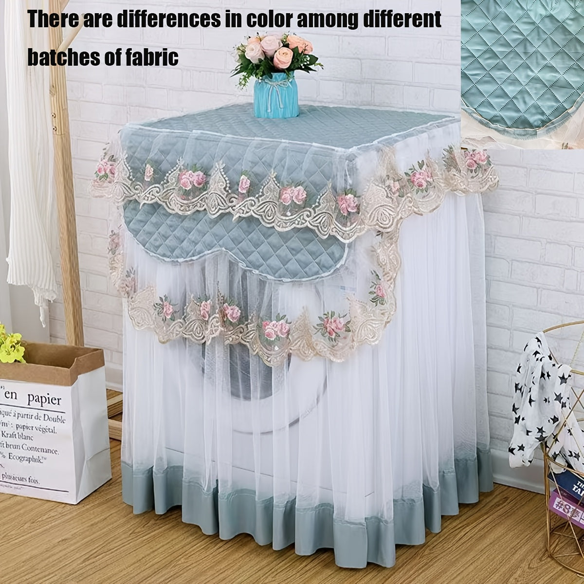 Gul naqshli va qirrali trim bilan bezatilgan pushti va oq dantel kir yuvish mashinasi qopqog'i, yon tomondan ochiladigan modellarga mos kelish, chang va quyoshdan himoya qilishni ta'minlaydi. Polyester matodan tayyorlangan.