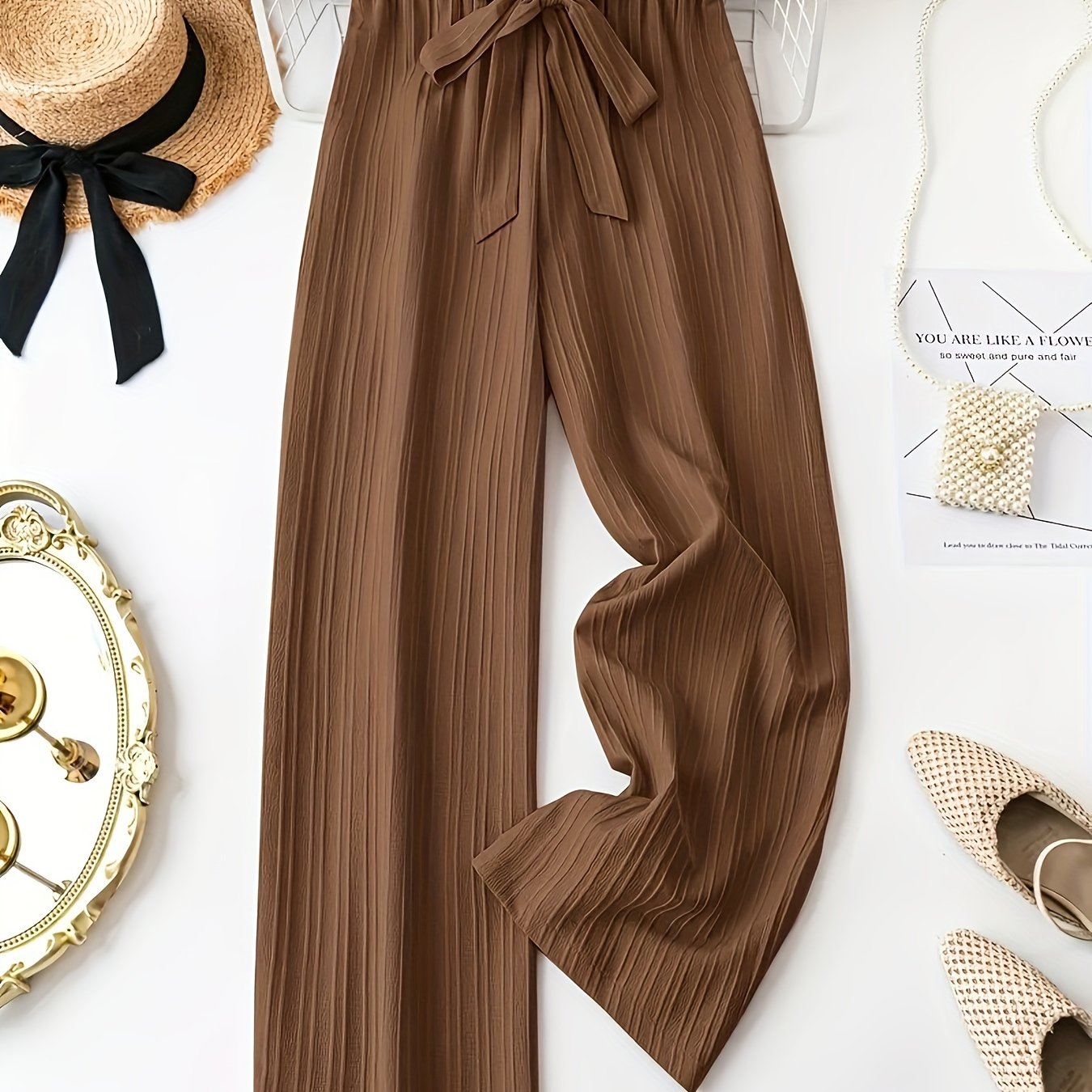 Ayollar uchun qattiq rangli, keng oyoqli, bel bog'ichli pliseli polyester shimlar. Bahor/yoz/kovak mavsumlari uchun mos.