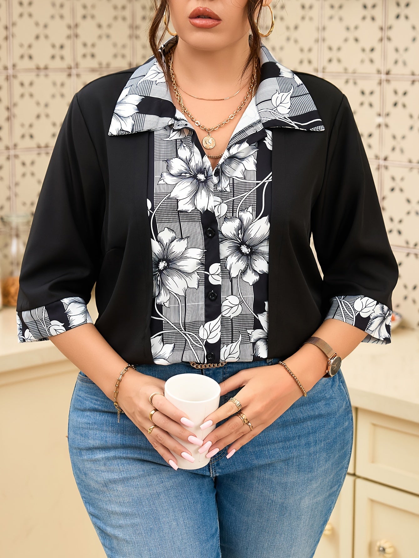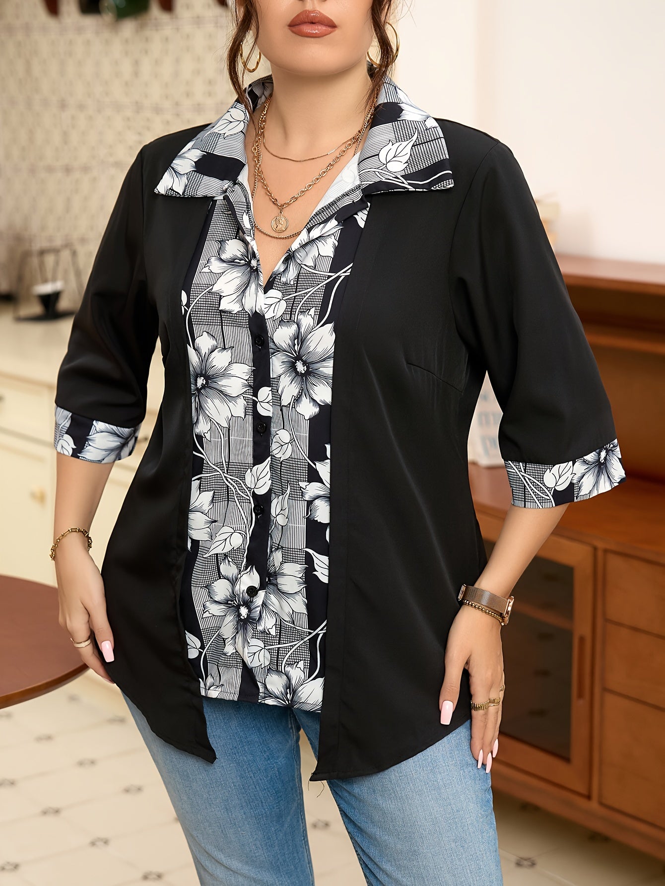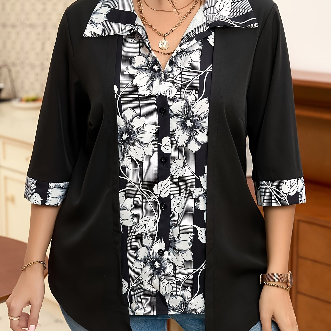 Katta o'lchamdagi gullar bilan patchwork ko'ylak, tugmachali old qismi, 3/4 uzunlikdagi yenglar, bahor va kuz uchun. Ayollar uchun katta o'lchamdagi kiyimlar.