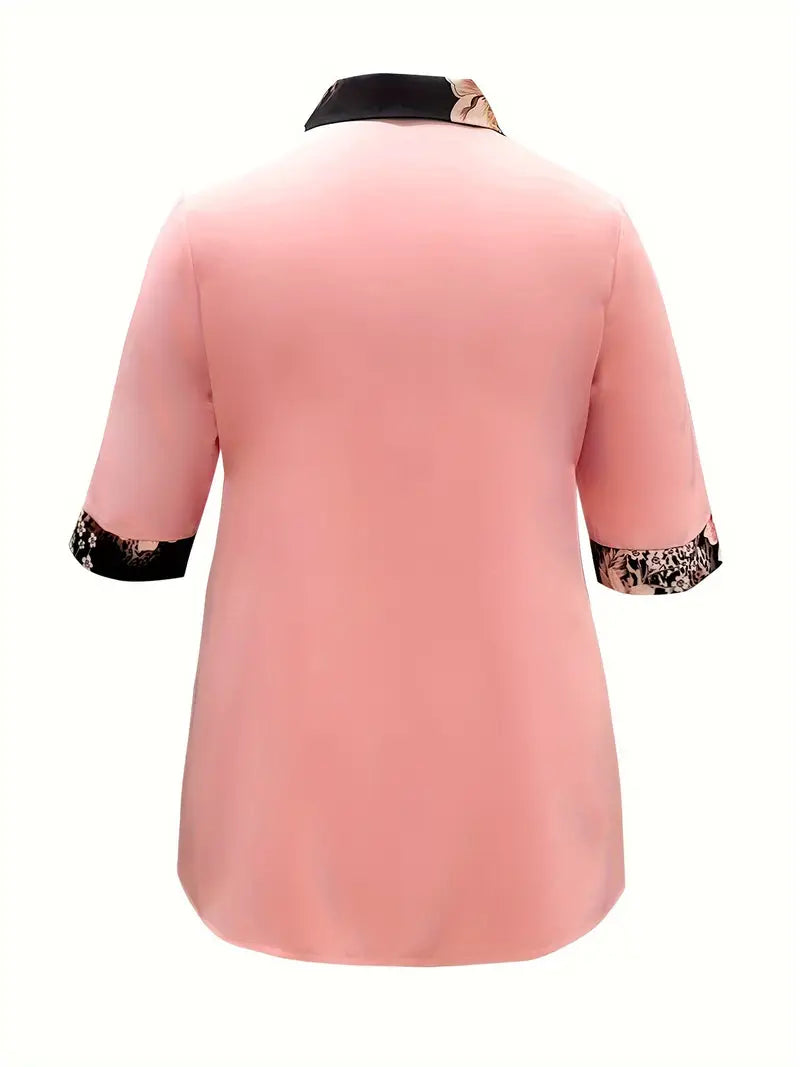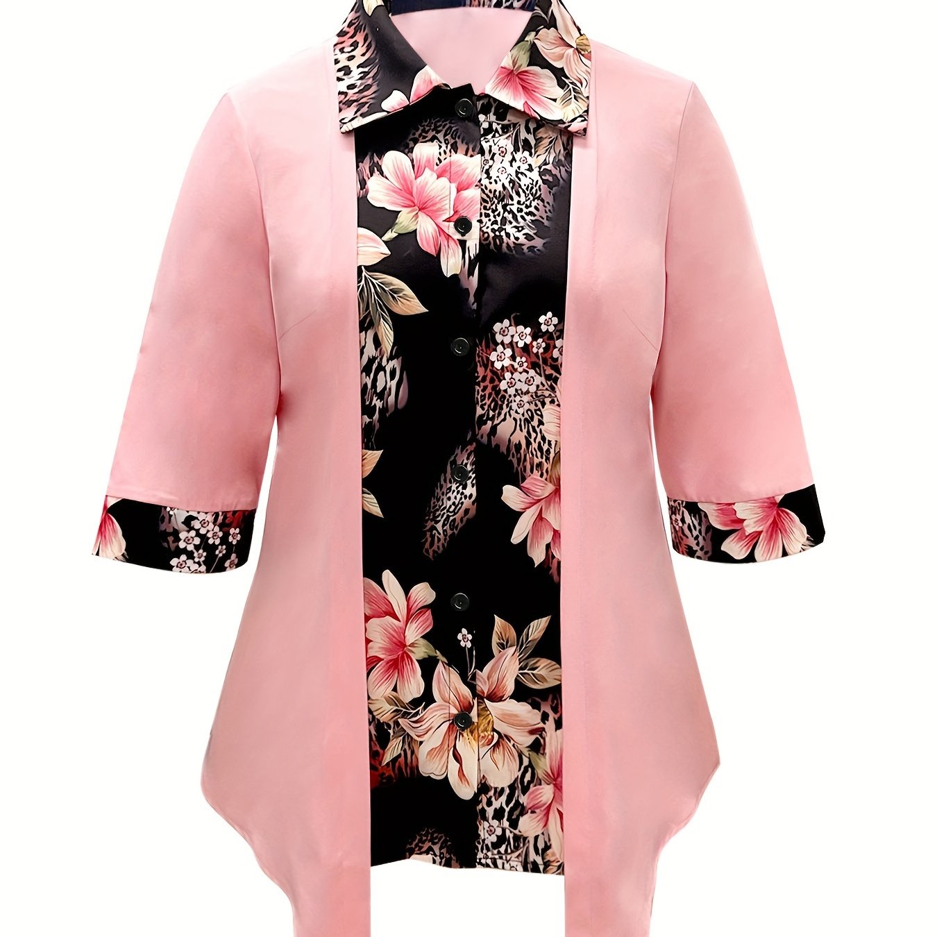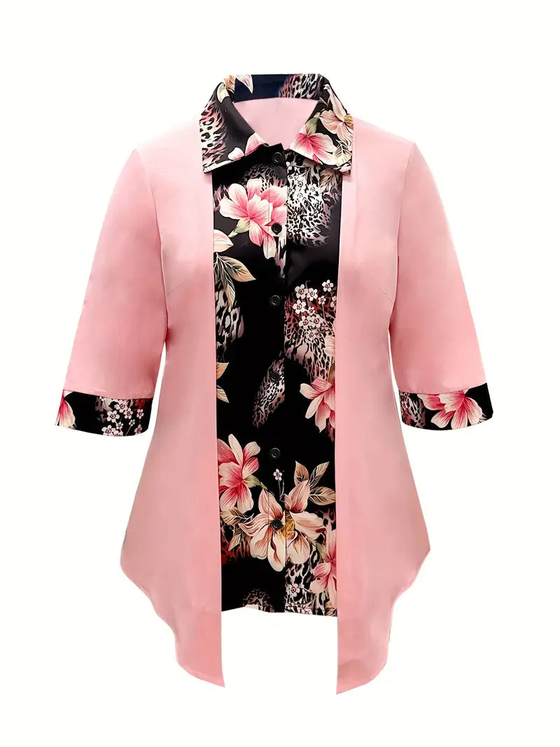 Katta o'lchamdagi gullar bilan patchwork ko'ylak, tugmachali old qismi, 3/4 uzunlikdagi yenglar, bahor va kuz uchun. Ayollar uchun katta o'lchamdagi kiyimlar.