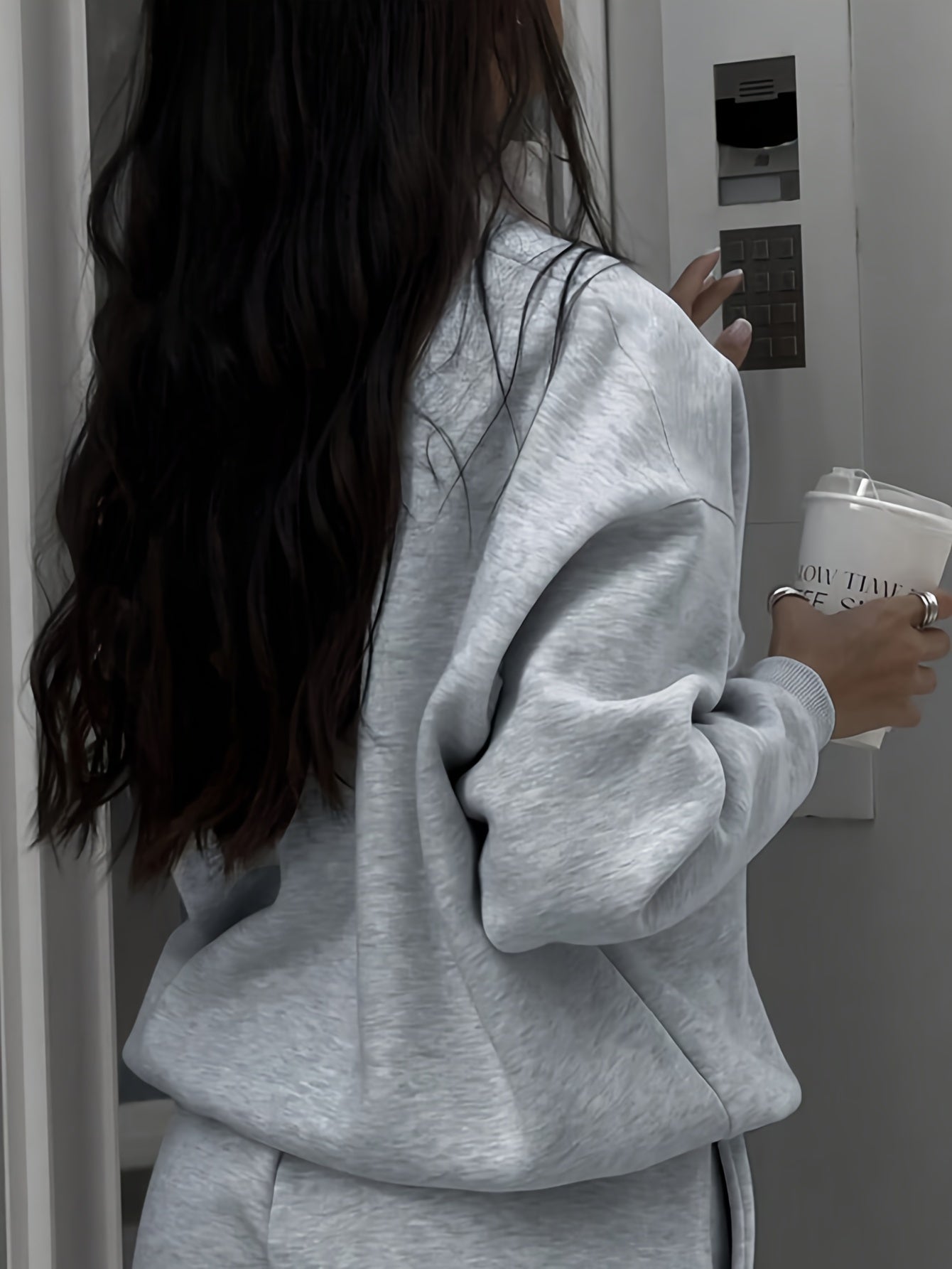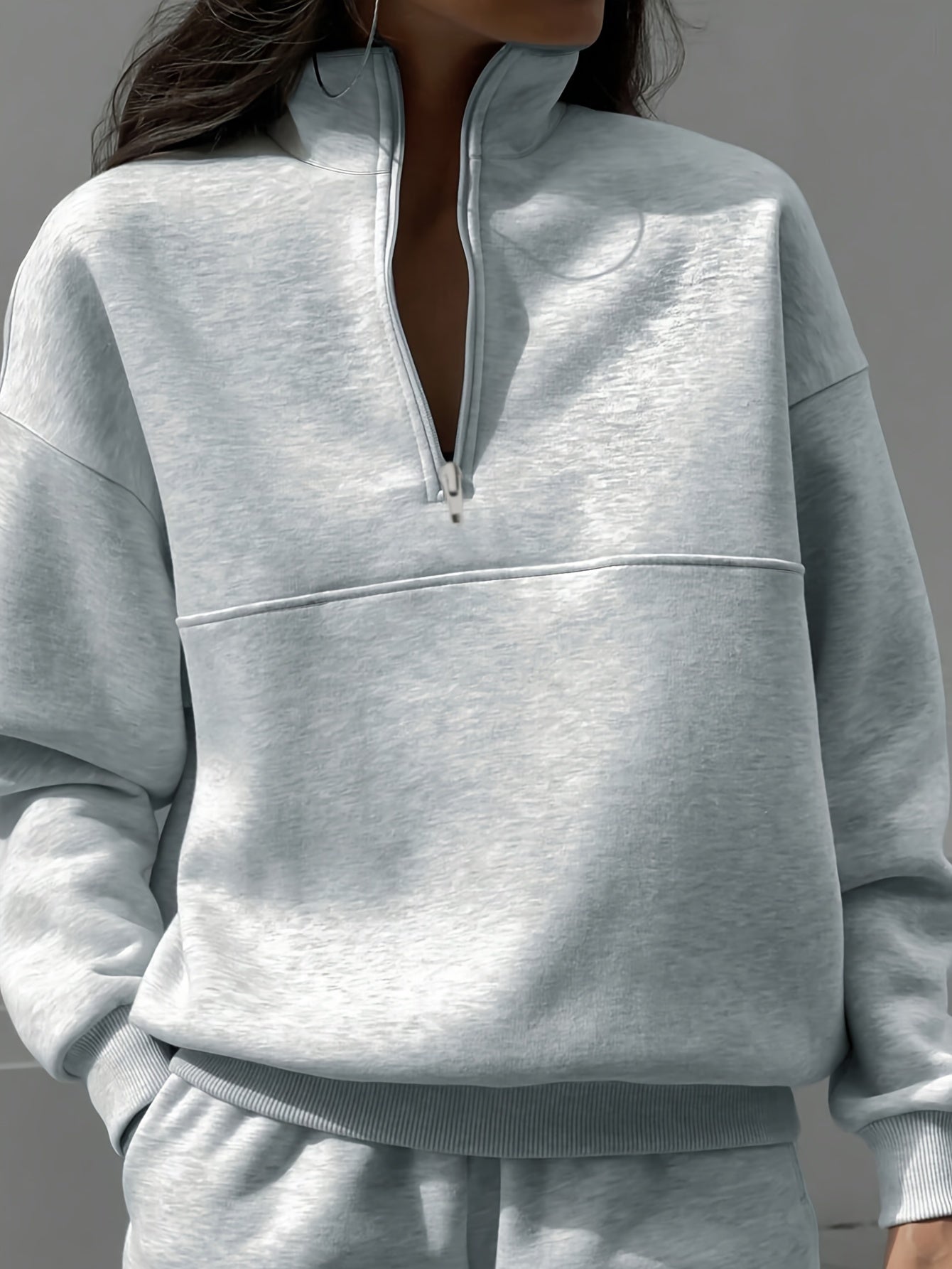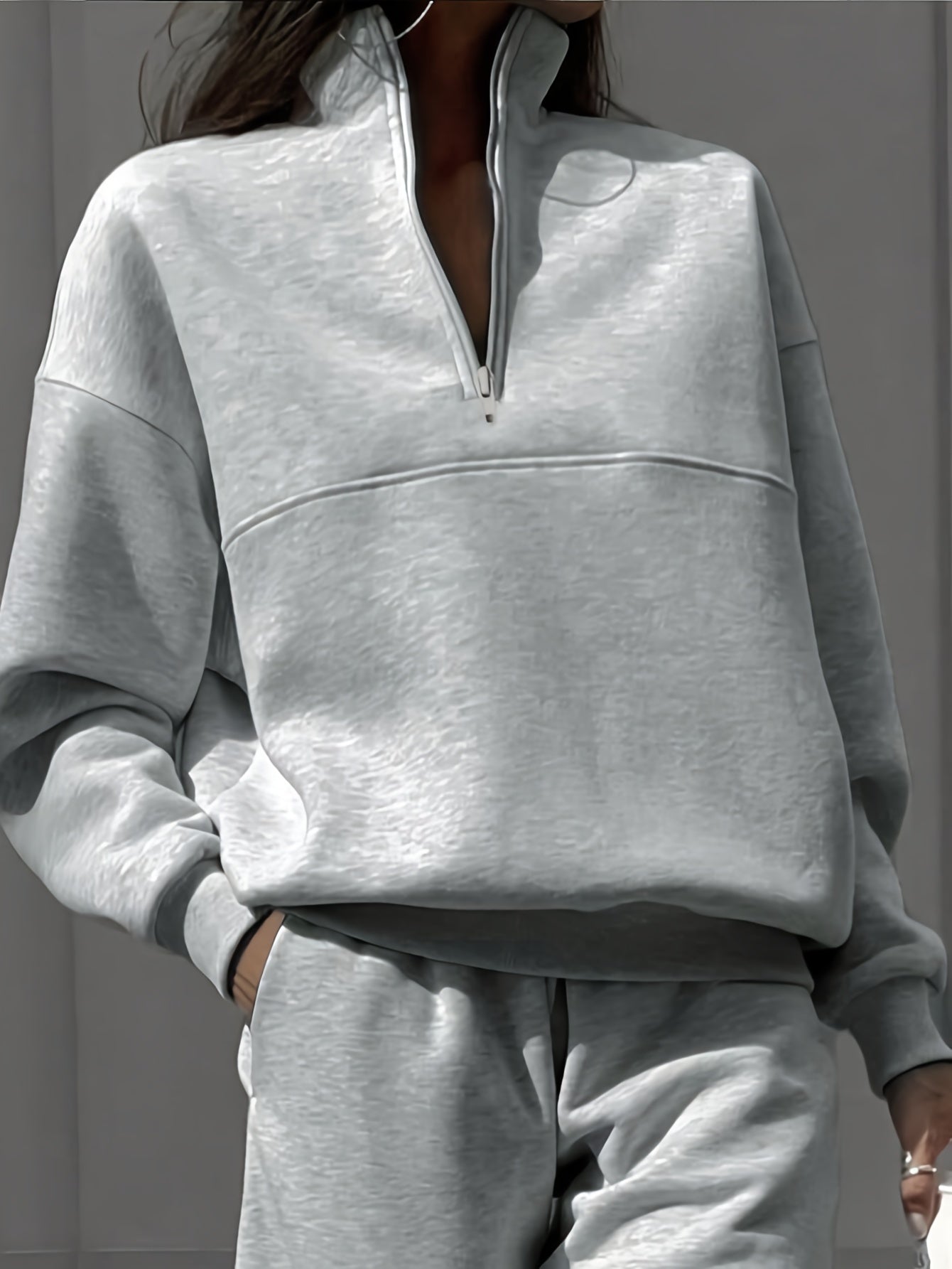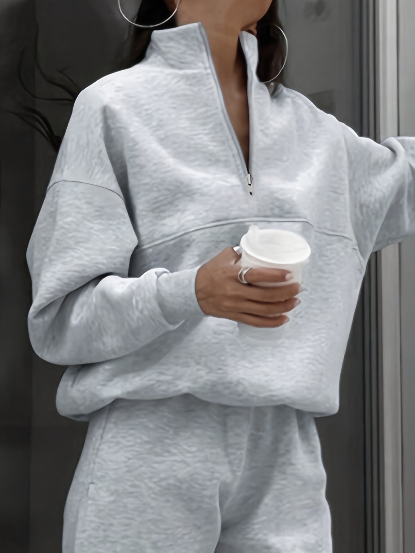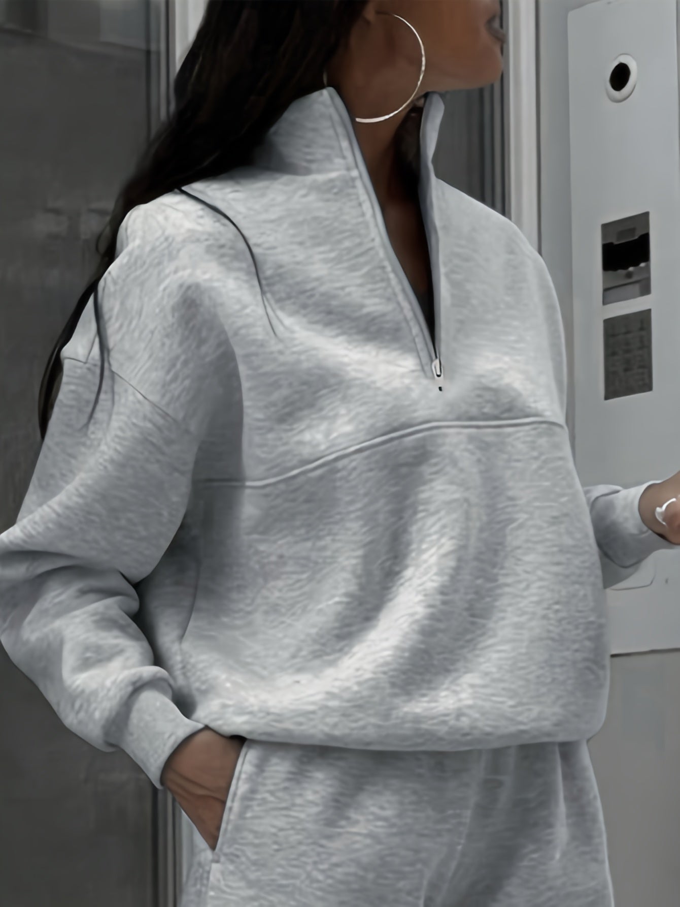 Plus o'lchamdagi kulrang futbolka ayollar uchun uzun qolli, yarim zipli, kuz-qish mavsumi