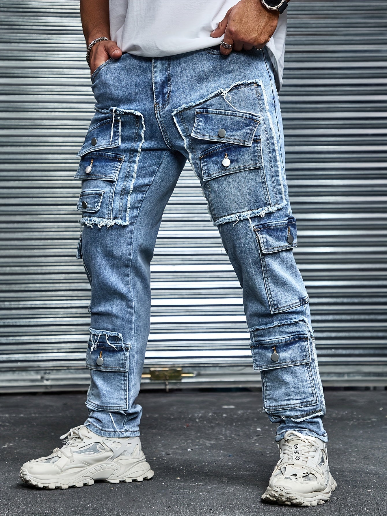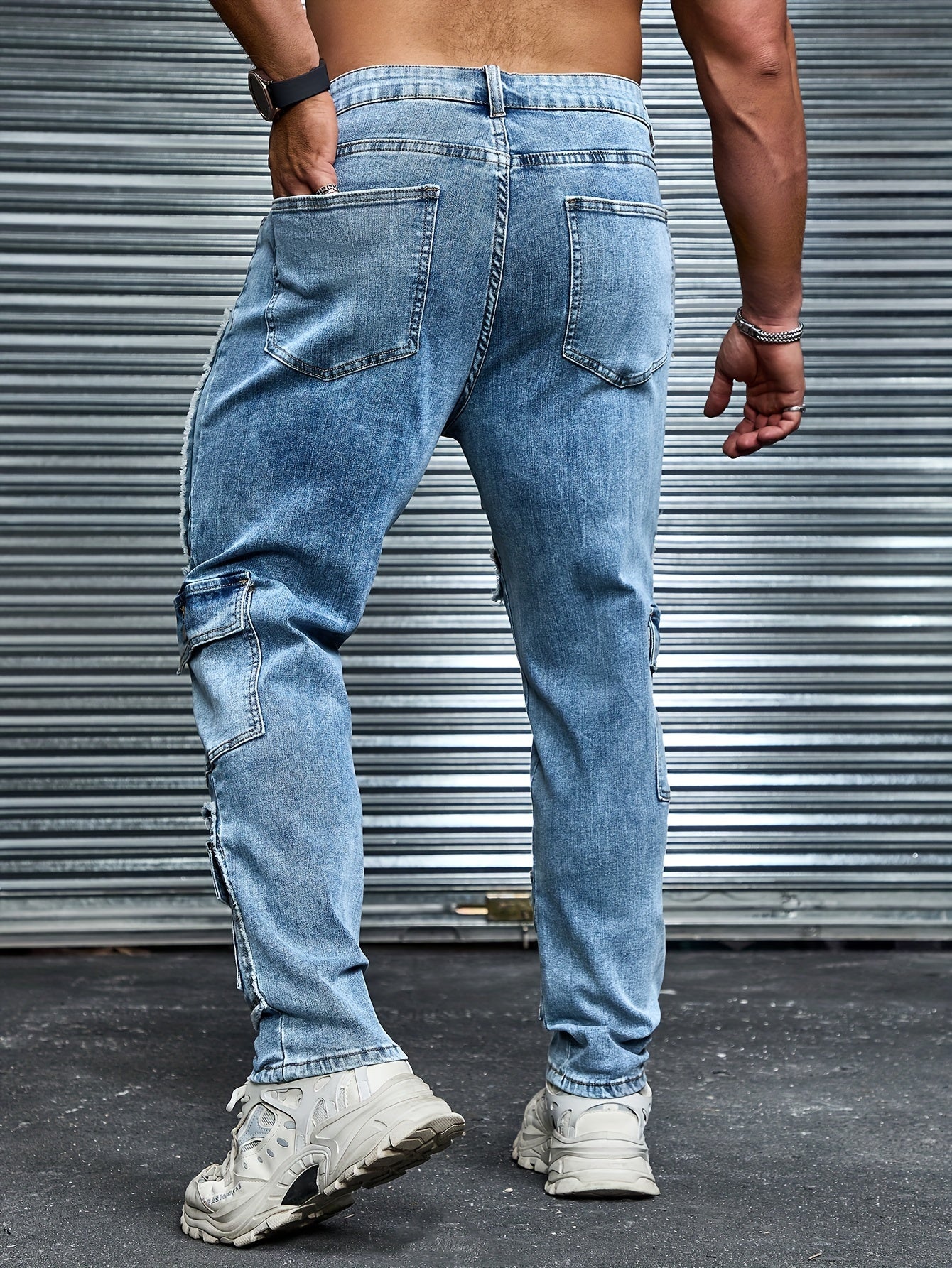 Kundalik kiyish uchun bir nechta cho'ntaklari, yirtilgan uslubi va qulay kesimi bo'lgan kattalar o'lchamidagi erkaklar uchun denim jinsi.