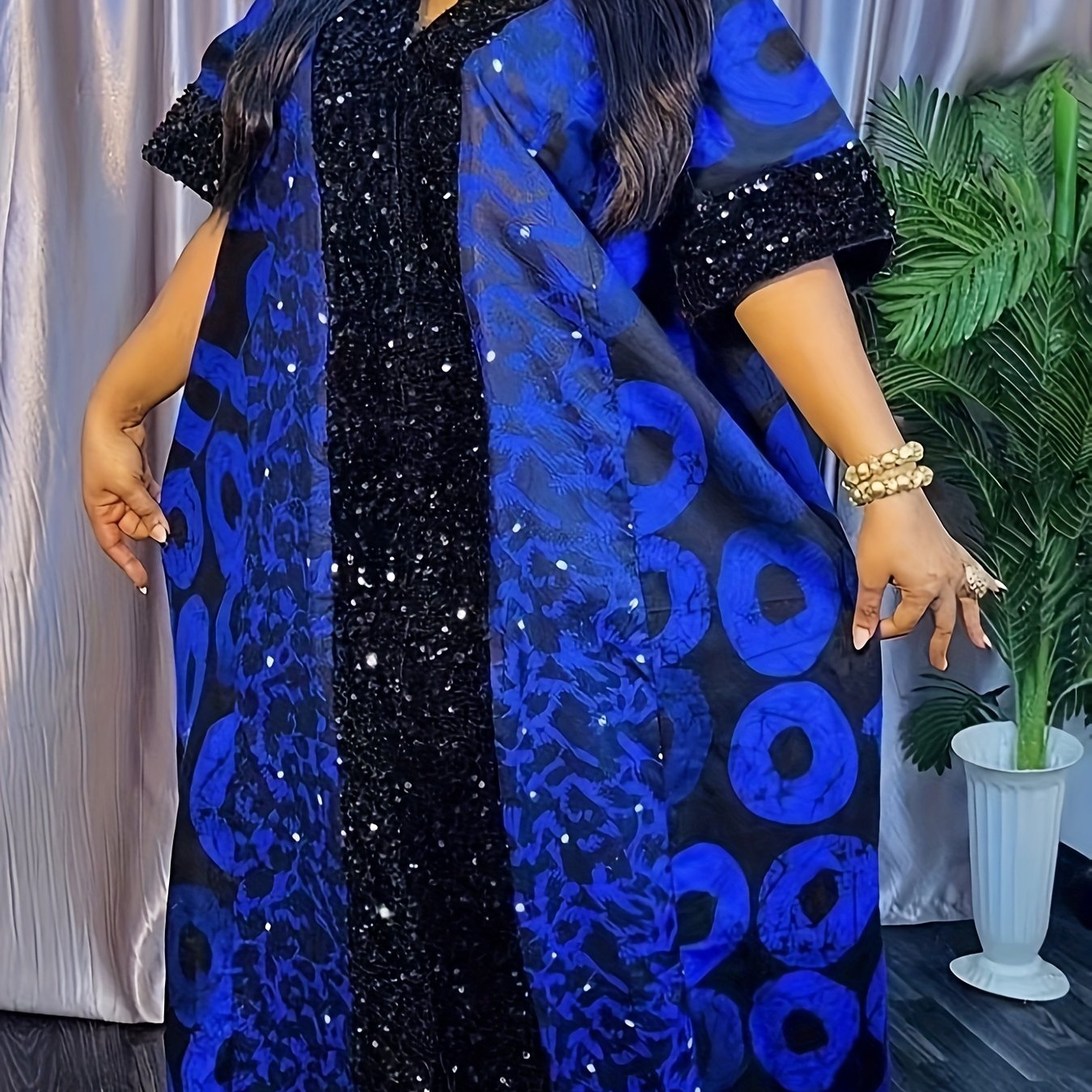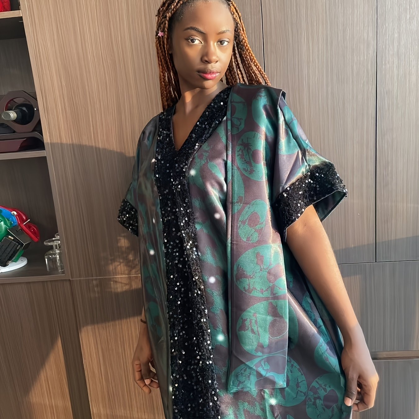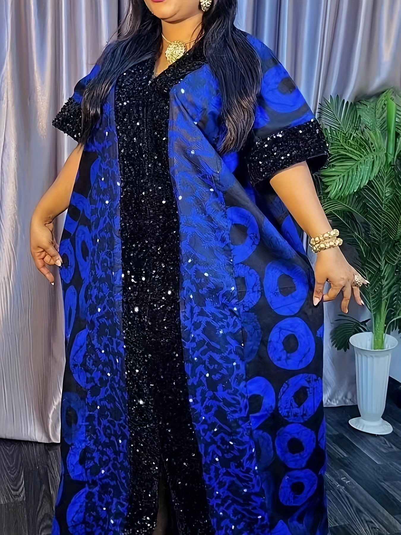 Plus o'lchamda bosma sequin kiyiwi, batwing qo'llari va V-shaklidagi bo'yin uchun ayollar uchun