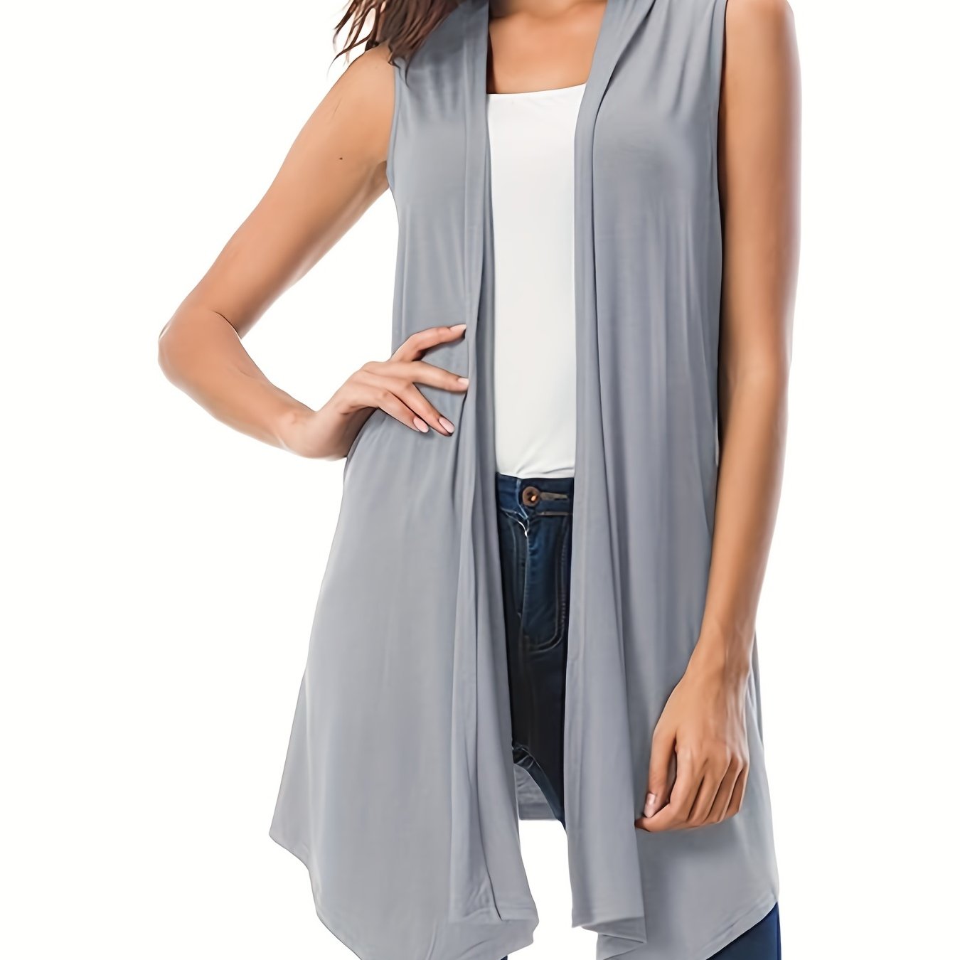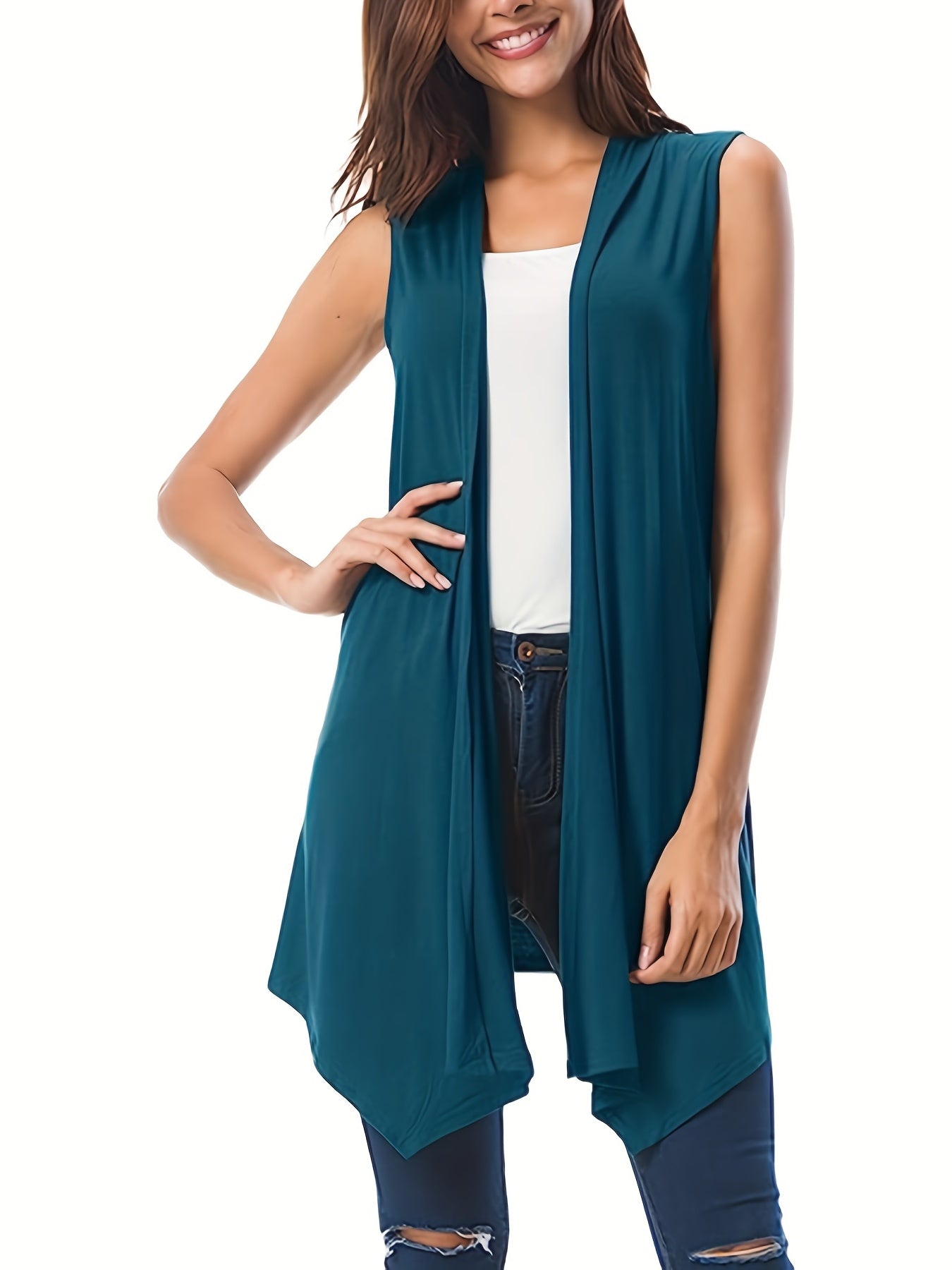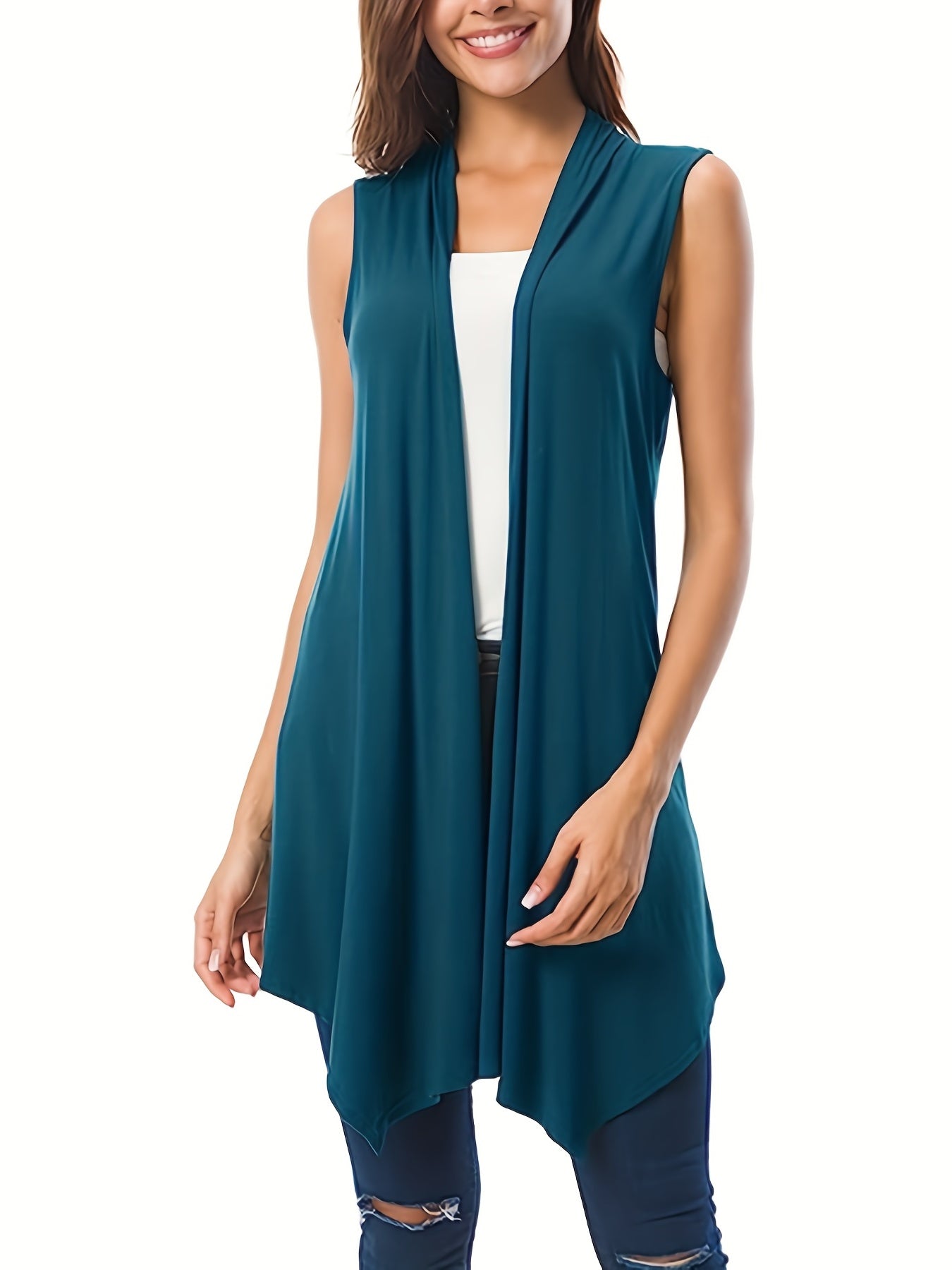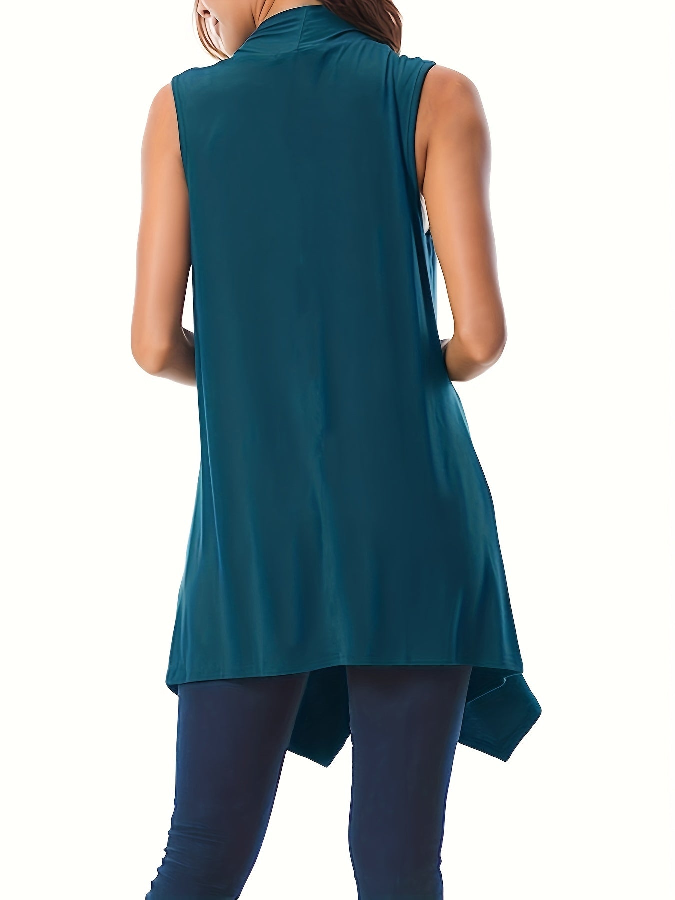 Ayollar uchun ochiq old qismi va asimmetrik qirralari bo'lgan plussayzli yengsiz yopqichlar.