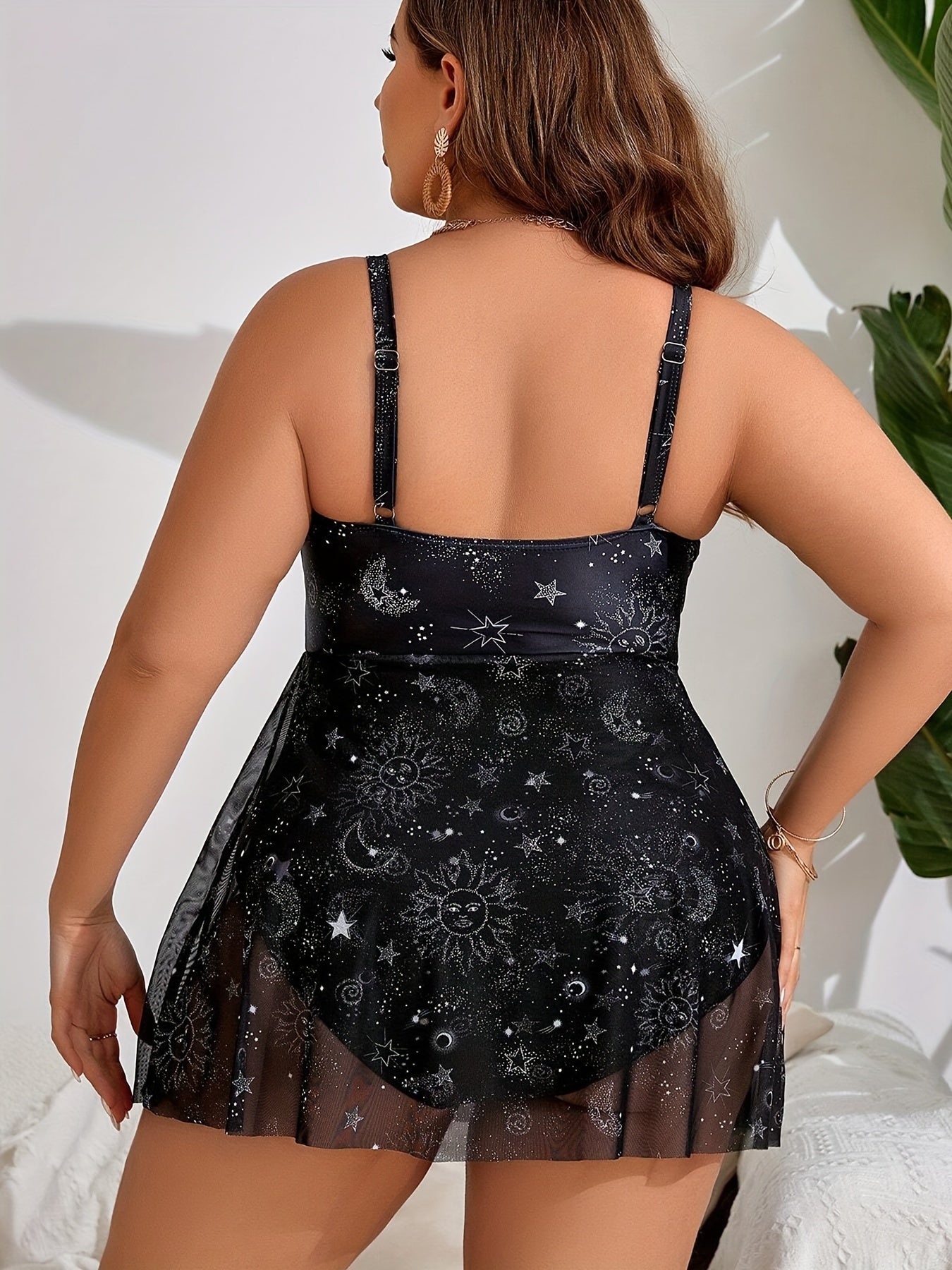 Ayollar uchun v-neck trikotaj suzish kiyimi, olib tashlanadigan yostiqlar, tasodifiy printli shaffof yubka, yelkasiz plyaj kiyimi, polyester mato, 195g/m² og'irlikdagi plus o'lchamdagi tankini suzish to'plami.