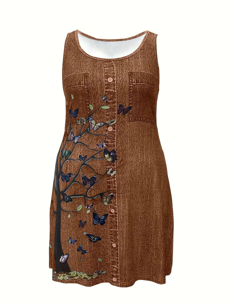 Plus Size Women's Cotton Sleep Dress with Butterfly Tree and Denim Print