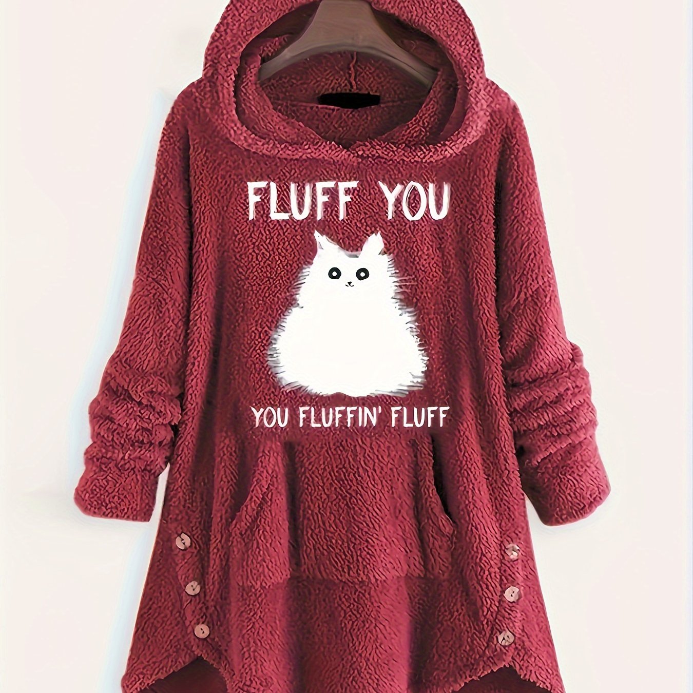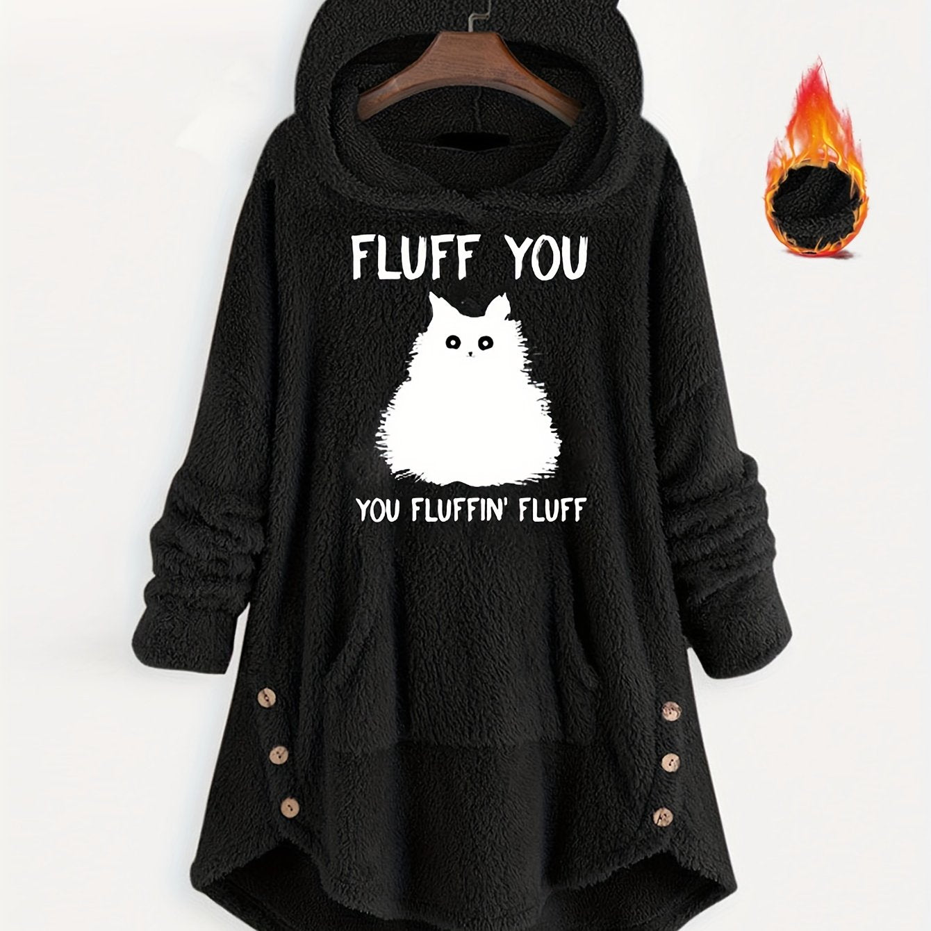 Plus o'lcham ayollar uchun fleece svitshot bilan slogan mushuk bosma uzun qo'lqop