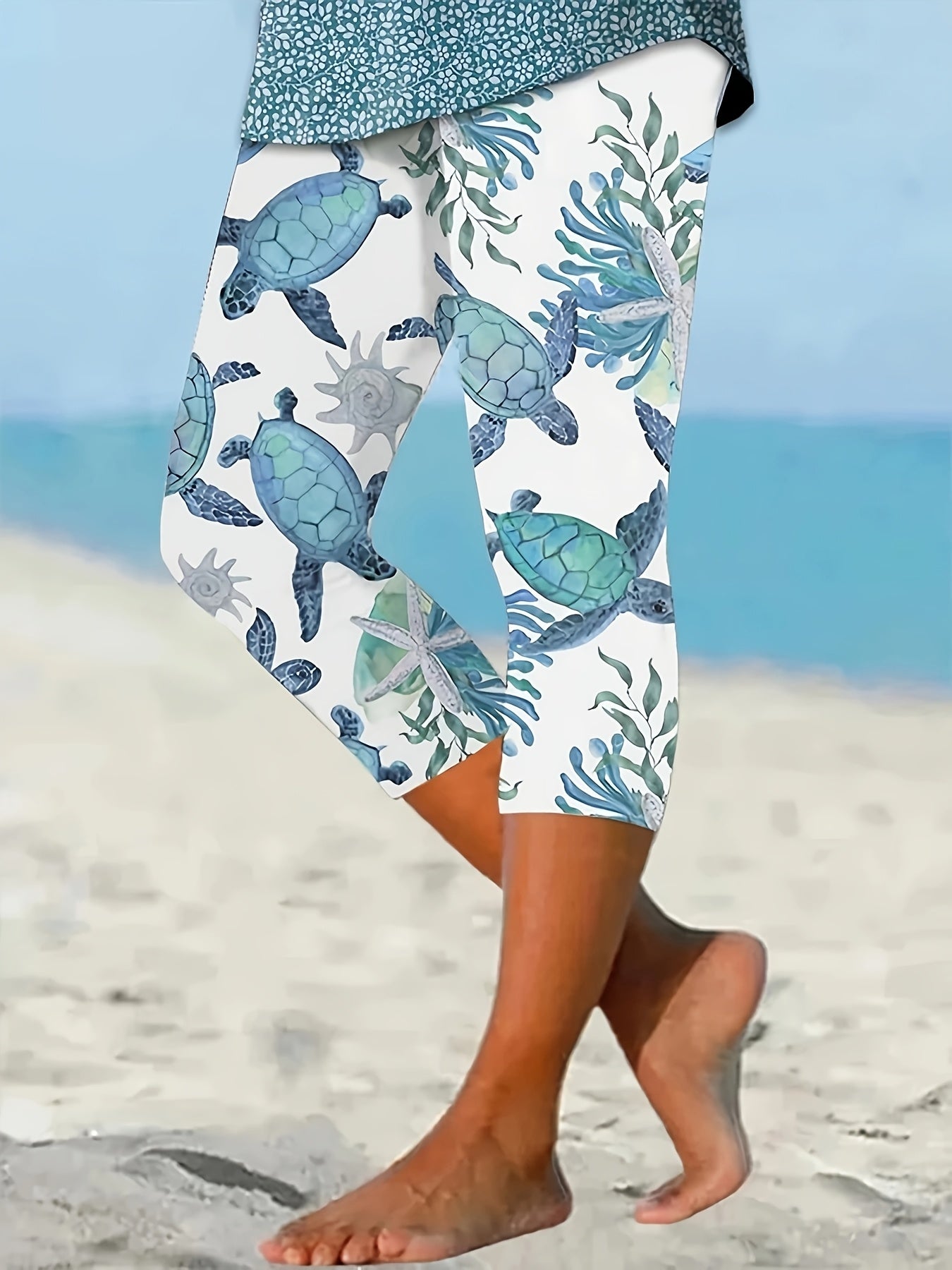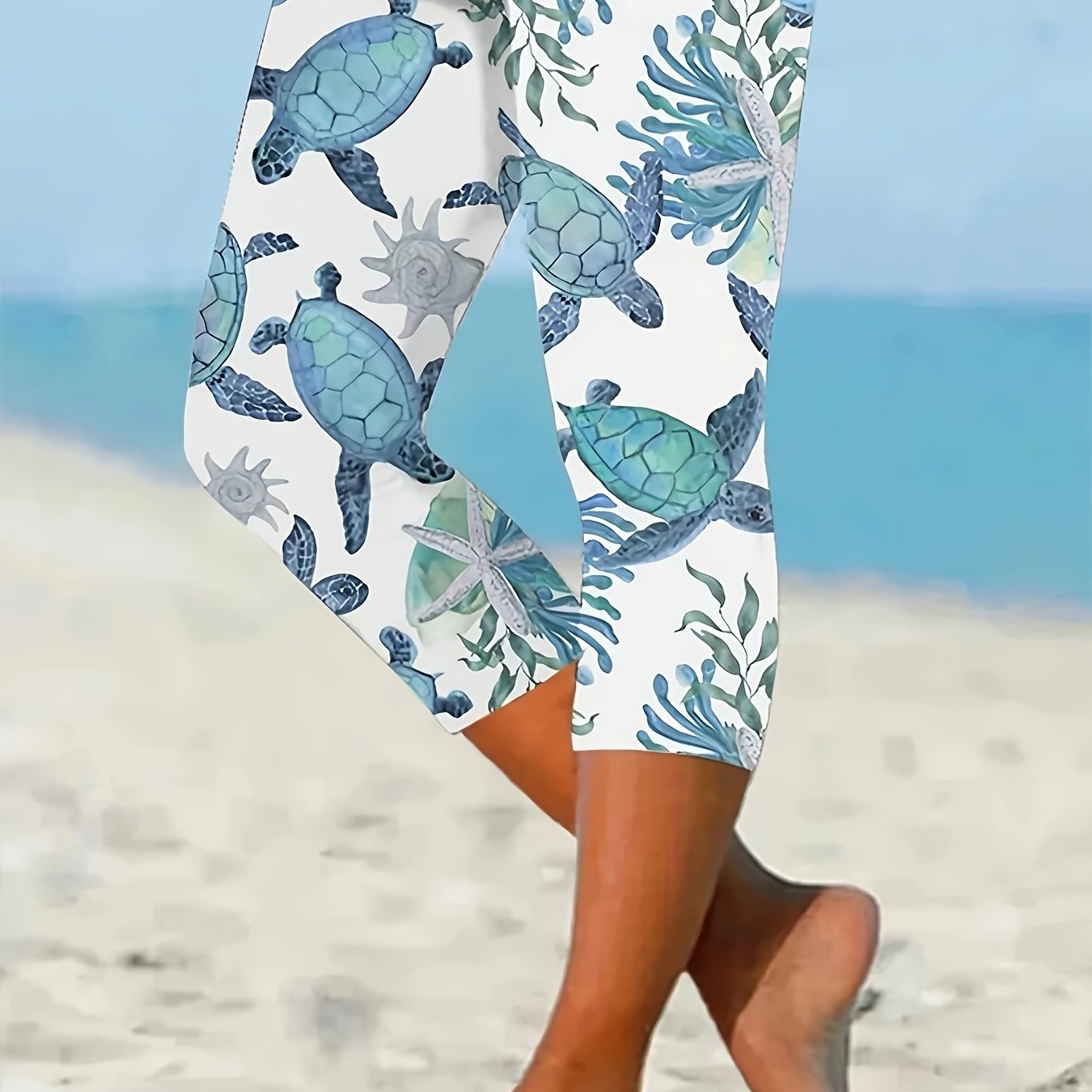 Plus Size Women's High-Waisted Yoga Pants Sea Turtle Print Stretchy Non-See-Through
