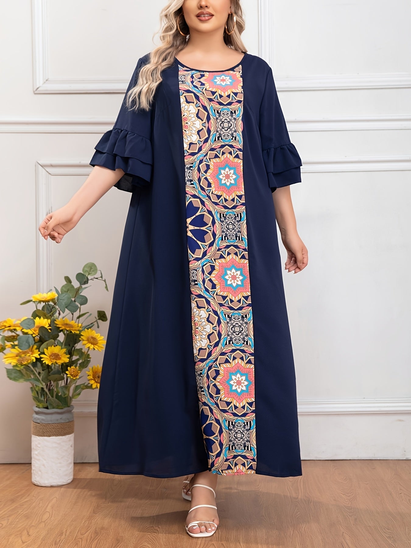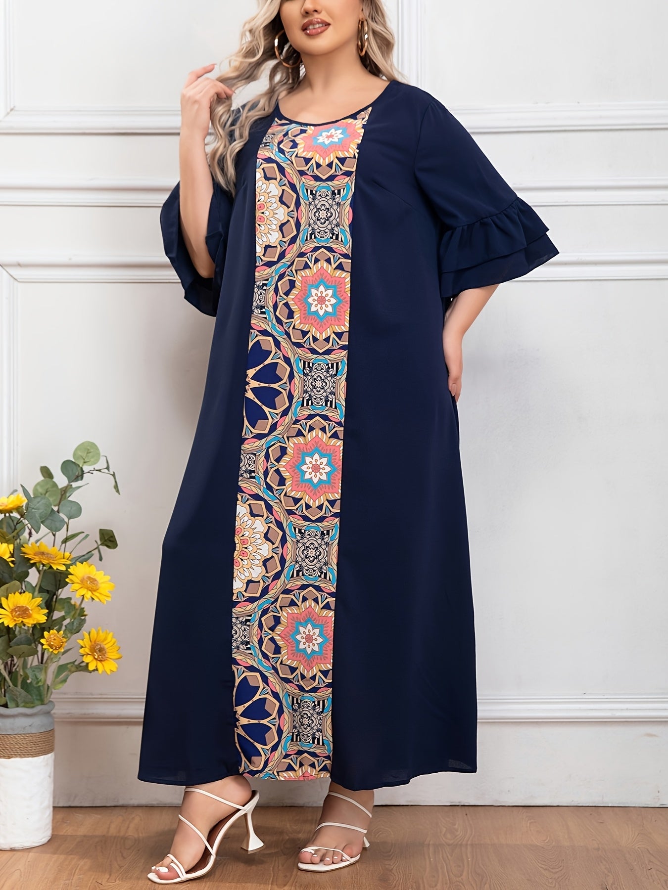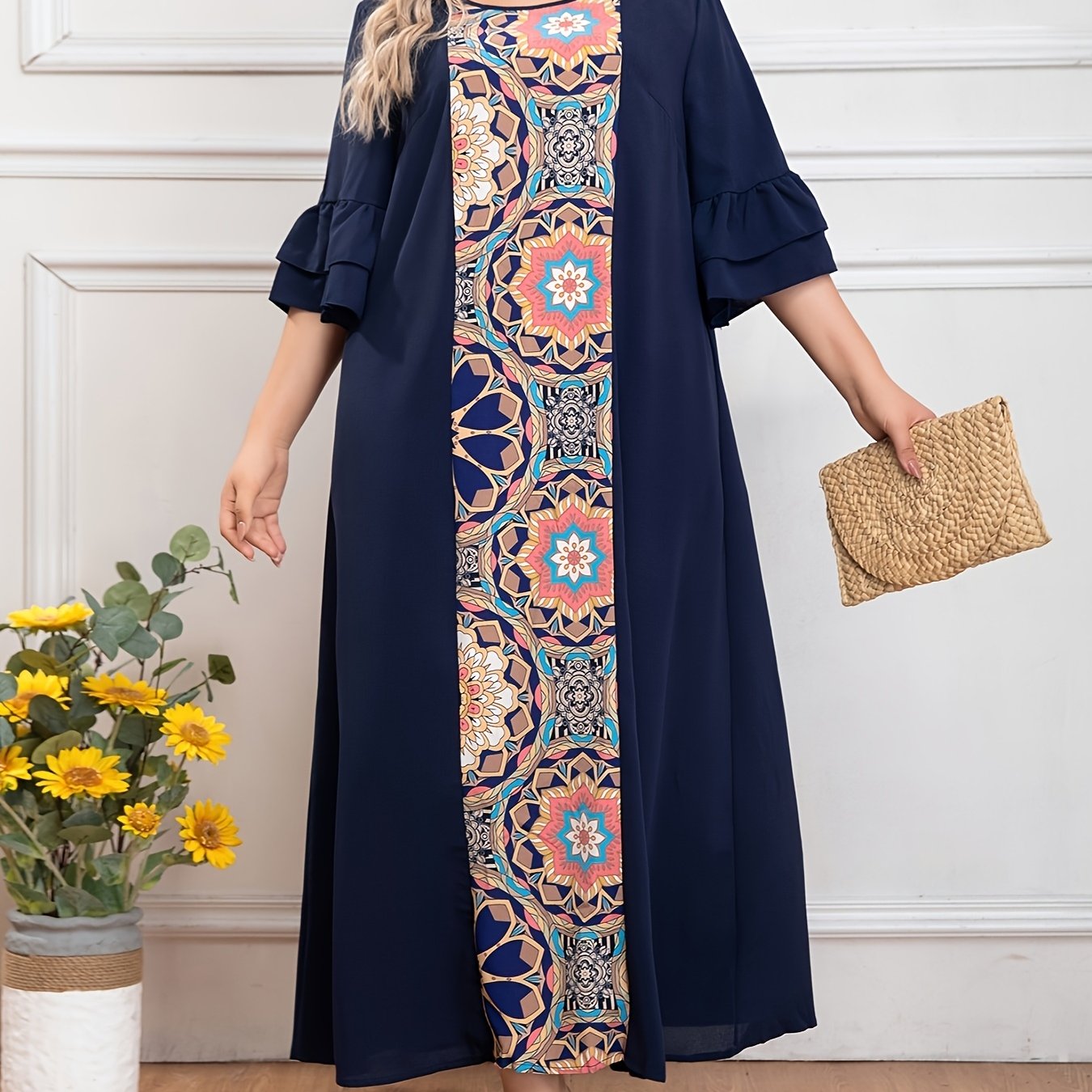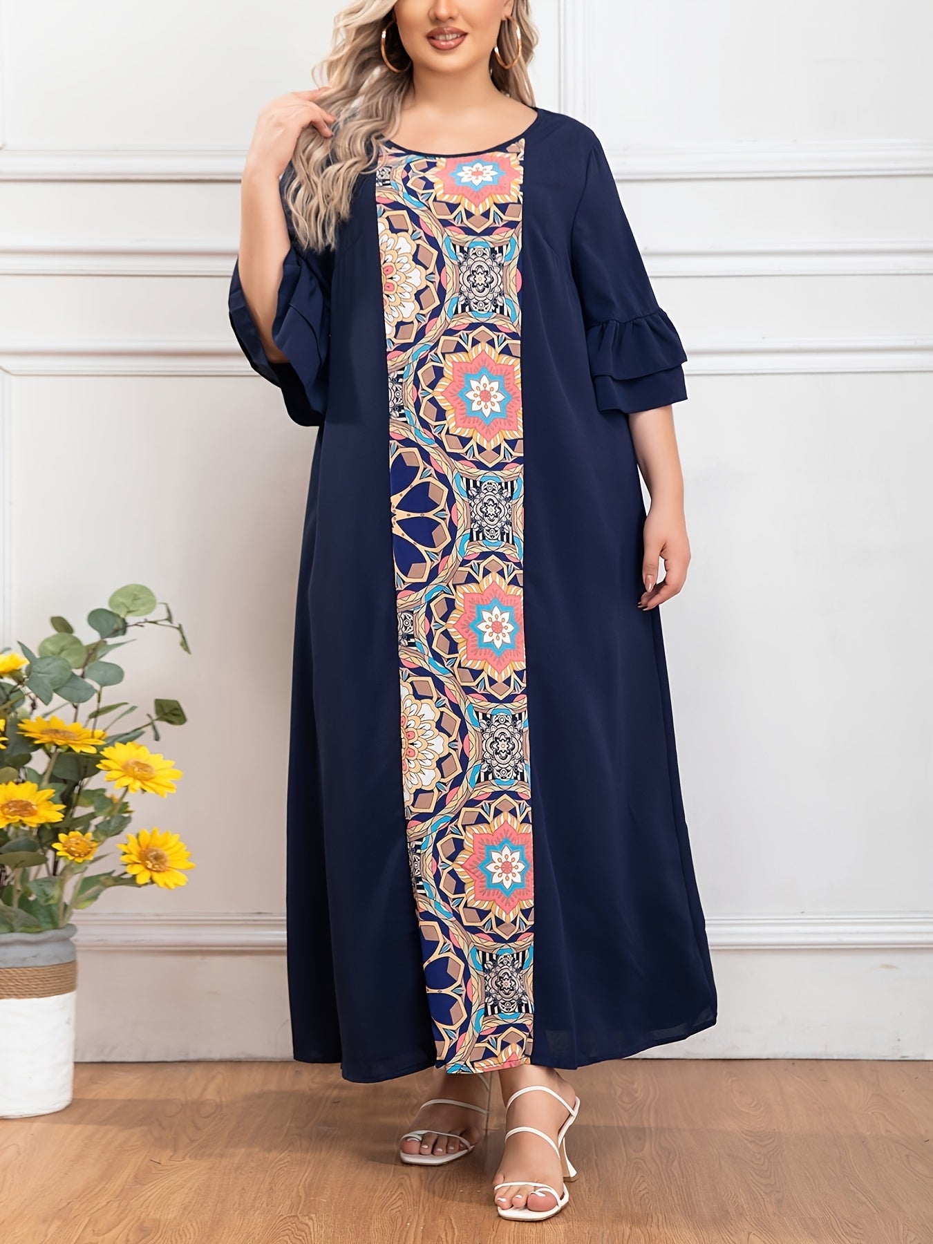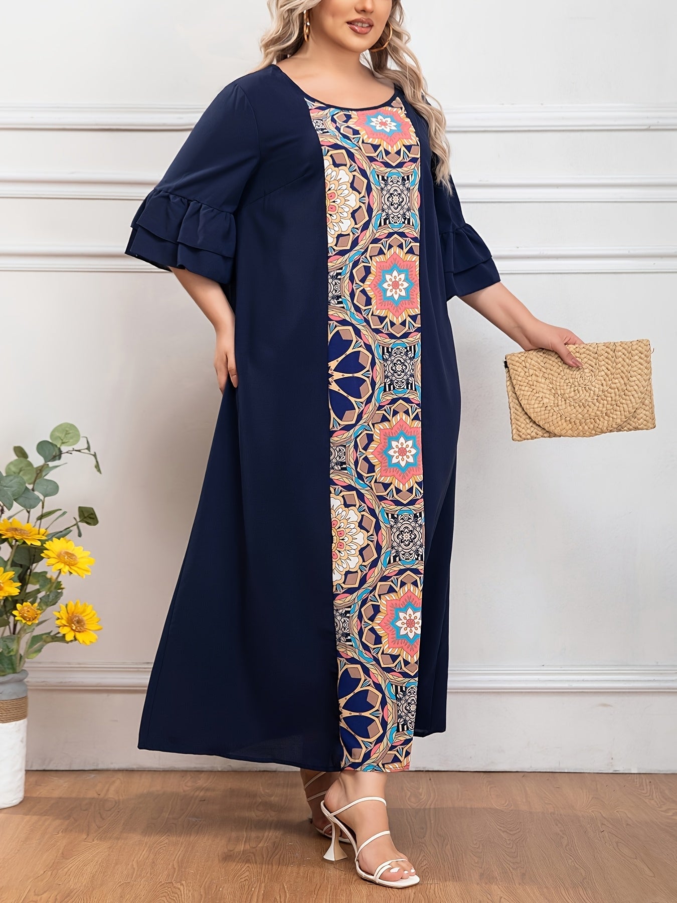 Plus o'lcham ayollar uchun erkin fitli krepe kiyi bilan yorqin bosma, barcha mavsumlar uchun qulaylik